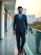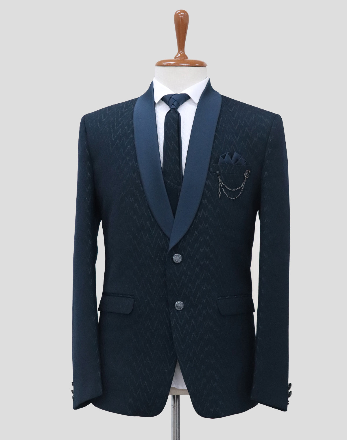 Beautifully Navy Blue self-design 5-piece suit set features intricate Polynosic thread work, adding a sophisticated touch. It includes a matching tie and unstitched satin trousers for a custom fit. Ideal for formal events, it offers both elegance and comfort.