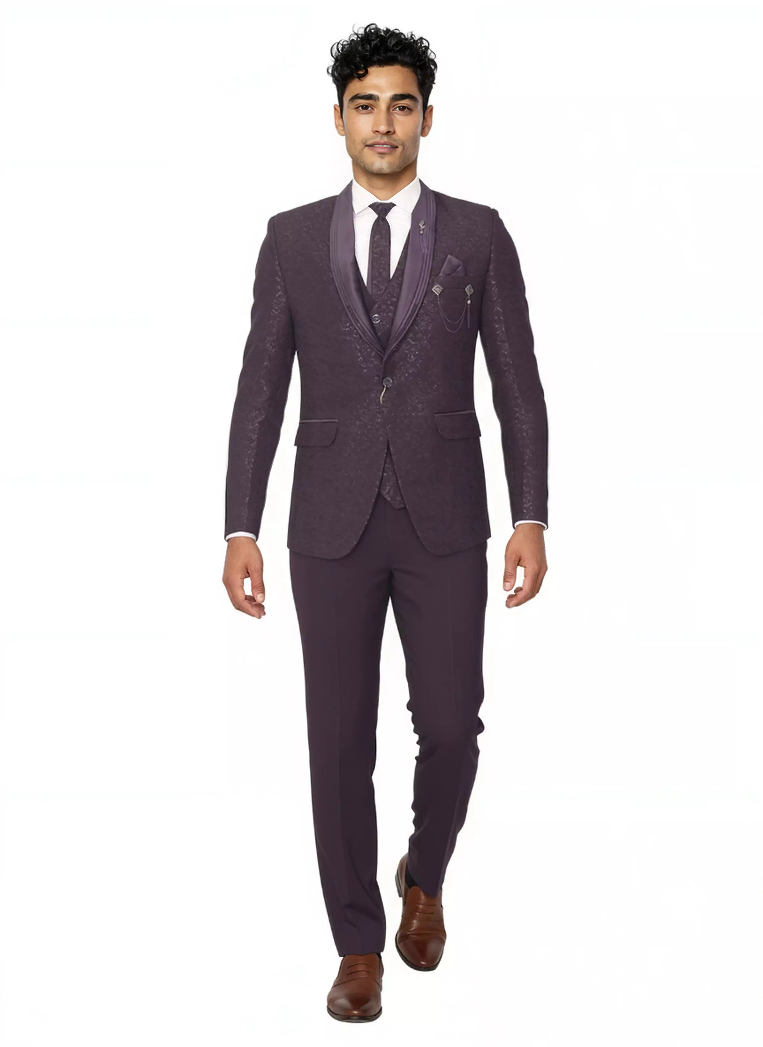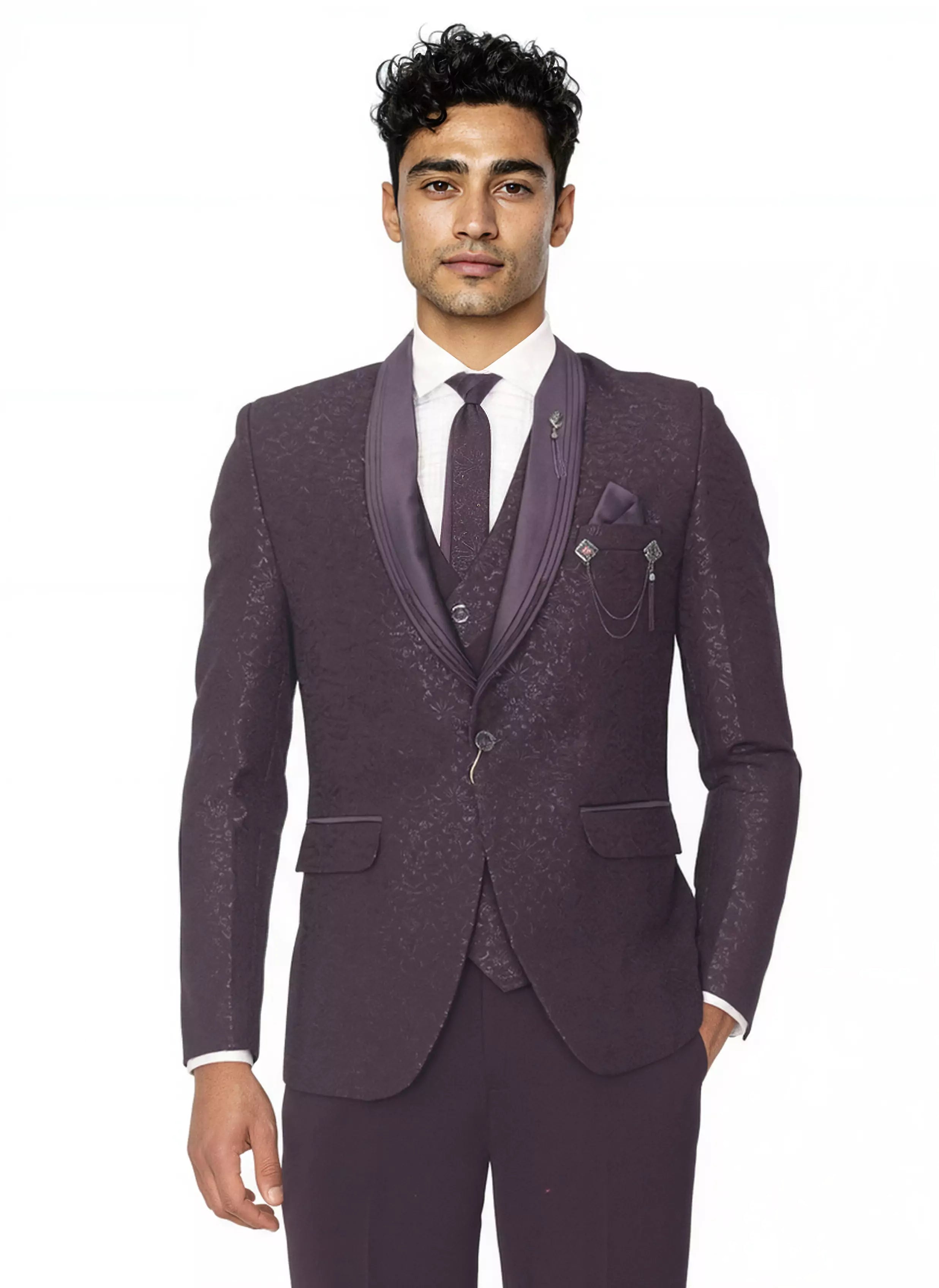 Stylish Self Floral Design Jacquard Suit perfect for party style. NOTE: 5 pc suit includes a matching suit jacket, stitched polynosic trouser, a waistcoat (vest), a tie and white span cotton shirt.