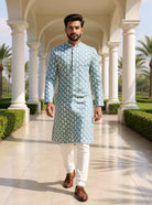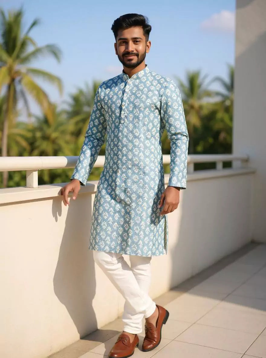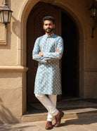 Vibrant blue cotton kurta adorned with floral motifs, paired with crisp off-white pajama—where charm meets comfort. An ideal pick for cheerful daytime events and gatherings.