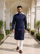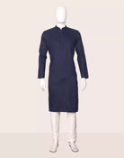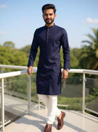 Charming blue cotton kurta with self-woven design, paired with classic off-white pajama—fusing comfort and style, perfect for day celebrations and relaxed elegance.