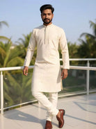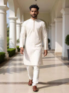 Nature-inspired botanical print on soft cotton kurta paired with classic off-white pajama—fresh, earthy, and effortlessly stylish. Perfect for serene day events and casual charm.