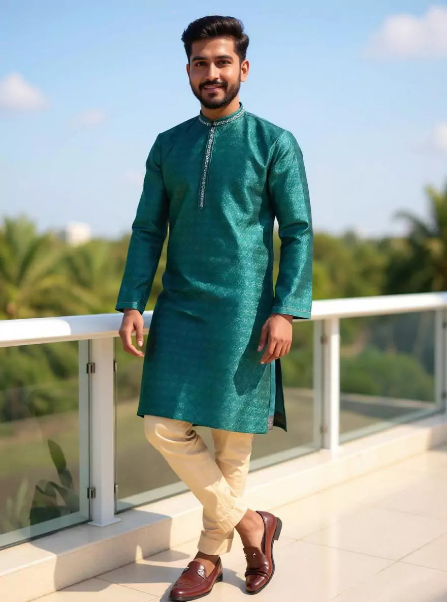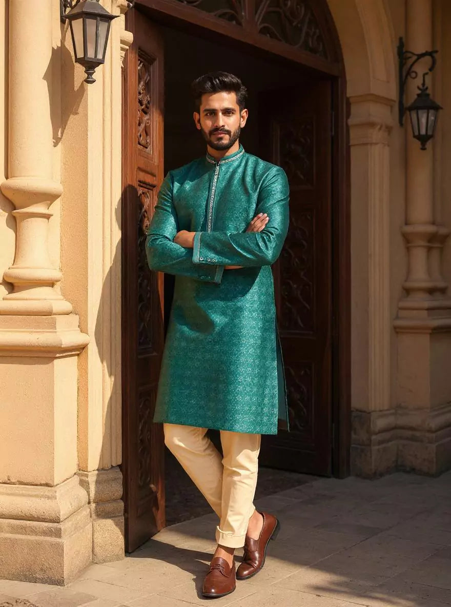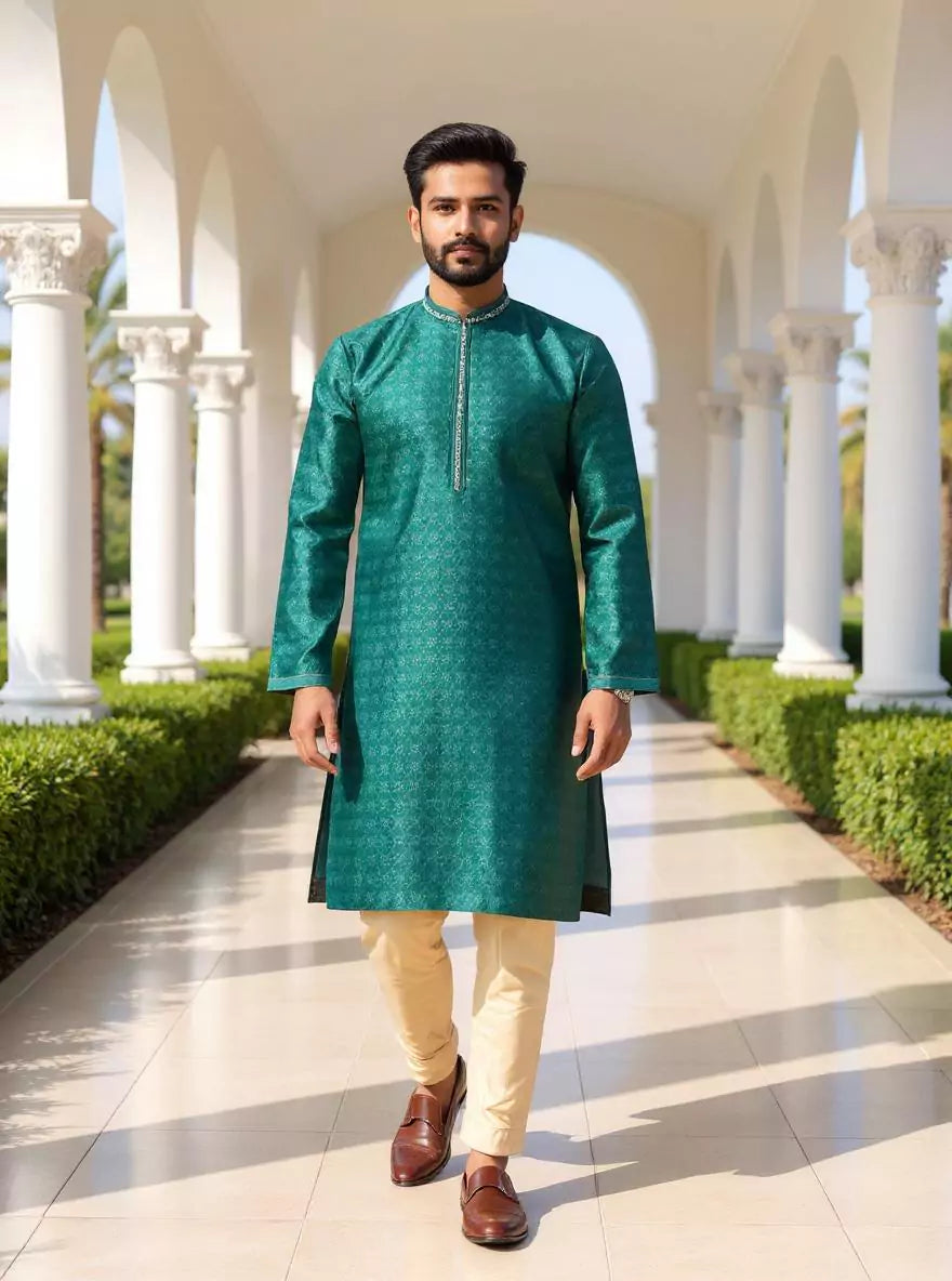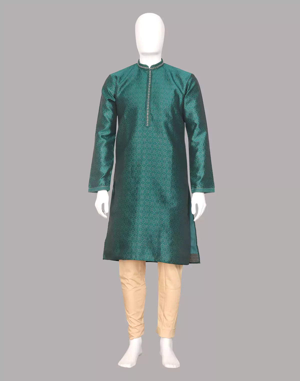 Embrace timeless elegance with this Bottle Green Self Weaving Jacquard Kurta adorned with intricate Zari Booti detailing. Paired with a rich gold cotton pyjama for a regal finish.