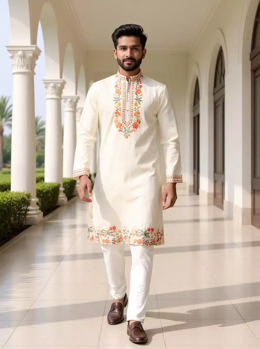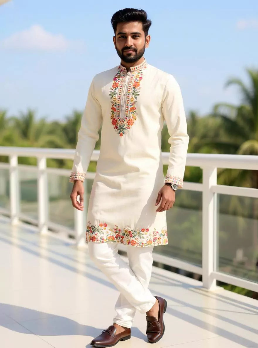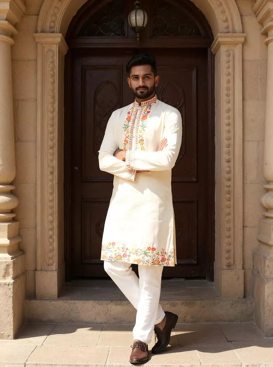 Chic men's cloud cream cotton silk kurta with elegant embroidered floral designs, ideal for casual or party wear. Comes with a matching cream pyjama.