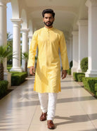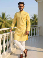 Elegant cotton self-design woven kurta paired with off-white pyjama. Perfect blend of tradition and comfort for festive and casual wear.