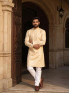 Elegant cotton self-design woven kurta paired with off-white pyjama. Perfect blend of tradition and comfort for festive and casual wear.
