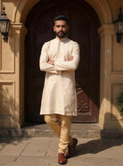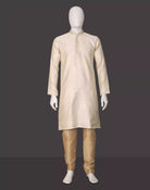 Elevate your ethnic look with this Cream Checks Kurta Pajama featuring a stylish Butta Jacquard design. Perfect for festive occasions and celebrations.