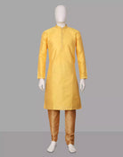 Radiant gold jacquard kurta with self-patterned elegance, paired with matching gold pajama—exudes regal sophistication, perfect for grand occasions and festive glimmer.