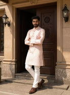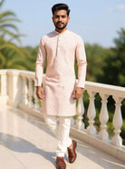 Elegant pink cotton kurta showcasing delicate trellis patterns, paired with timeless off-white pajama—soft hues and intricate design make it ideal for festive daytime charm.