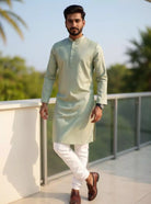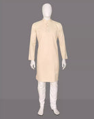 Elevate your ethnic style with this self-design cotton straight-cut men's kurta paired effortlessly with off-white pyjama. Light, breathable, and perfect for festive or casual wear.