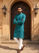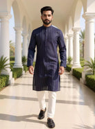 Striped patterned cotton Kurta with delicate thread work, paired with an off-white pyjama. A perfect mix of comfort and style for a smart casual look.