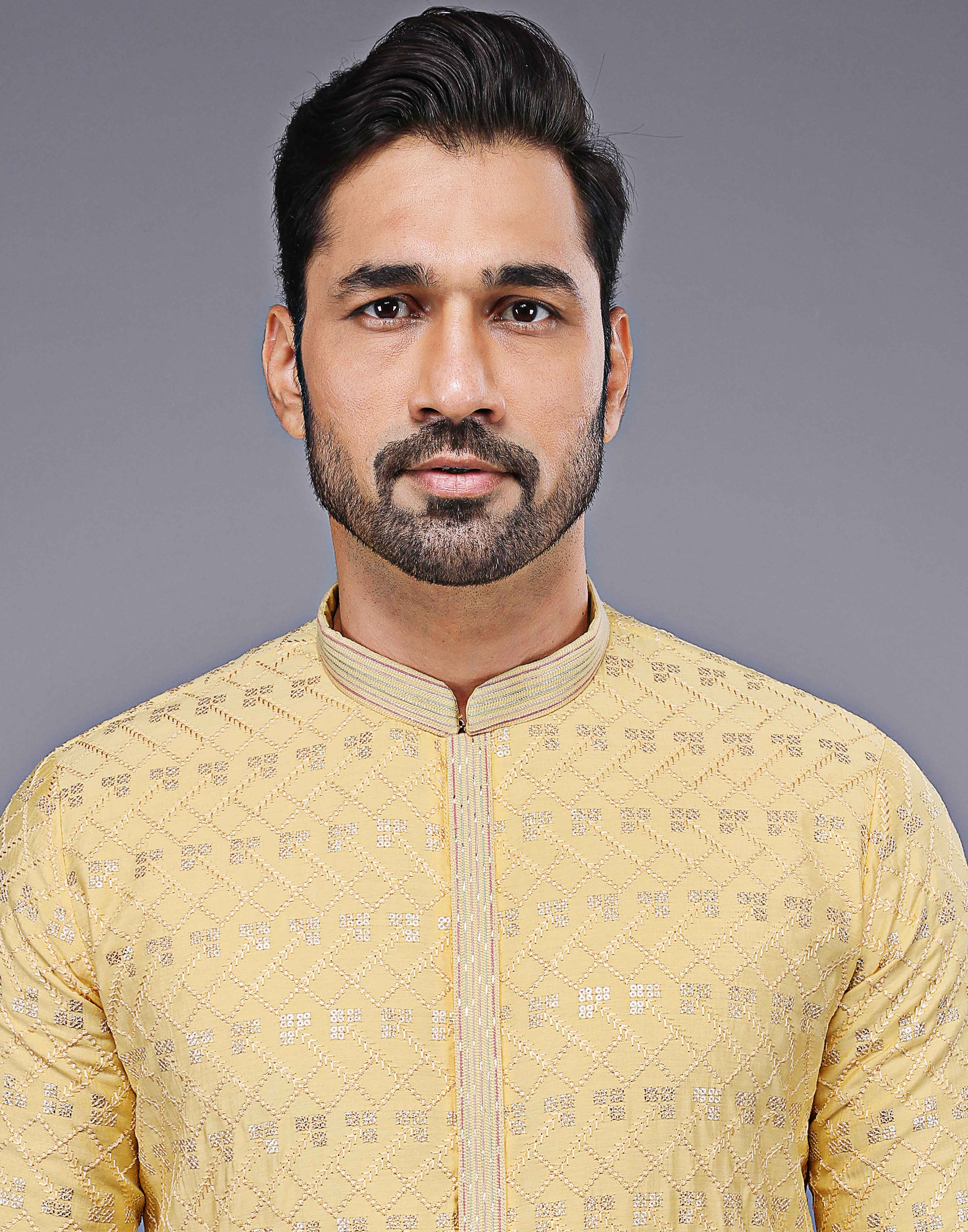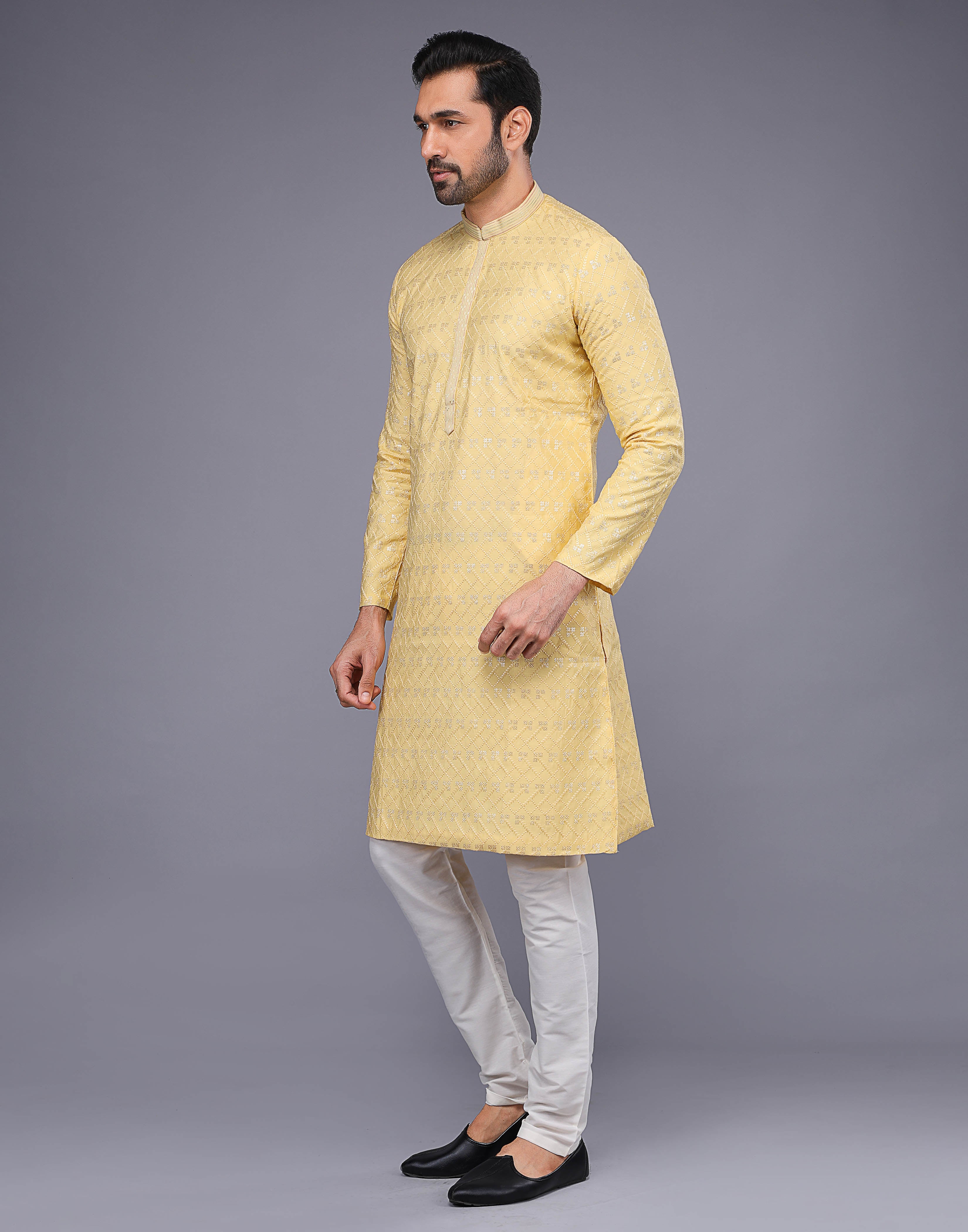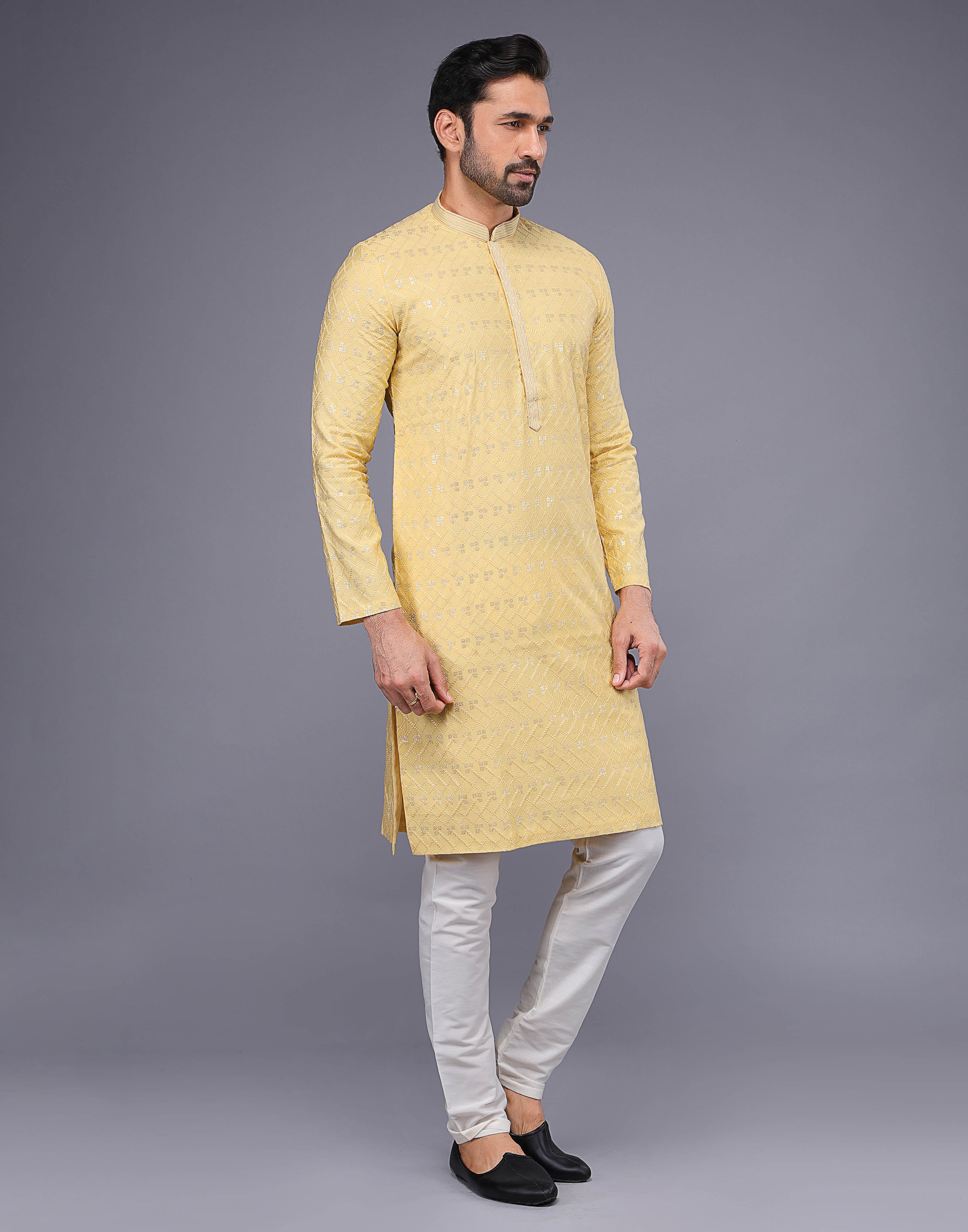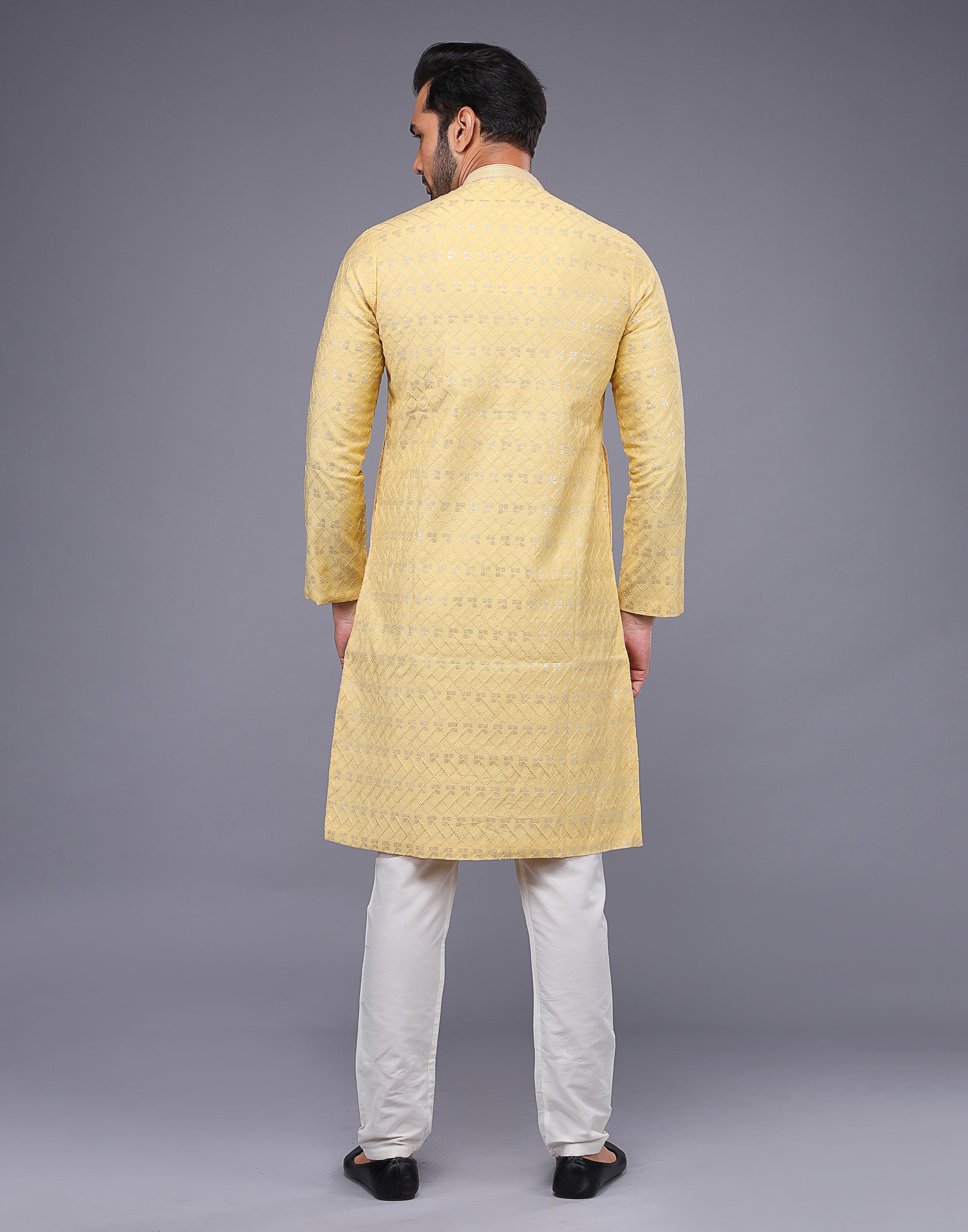 Elegant Light Yellow Embellished with Thread Work Kurta Pajama