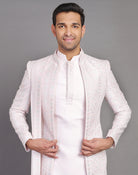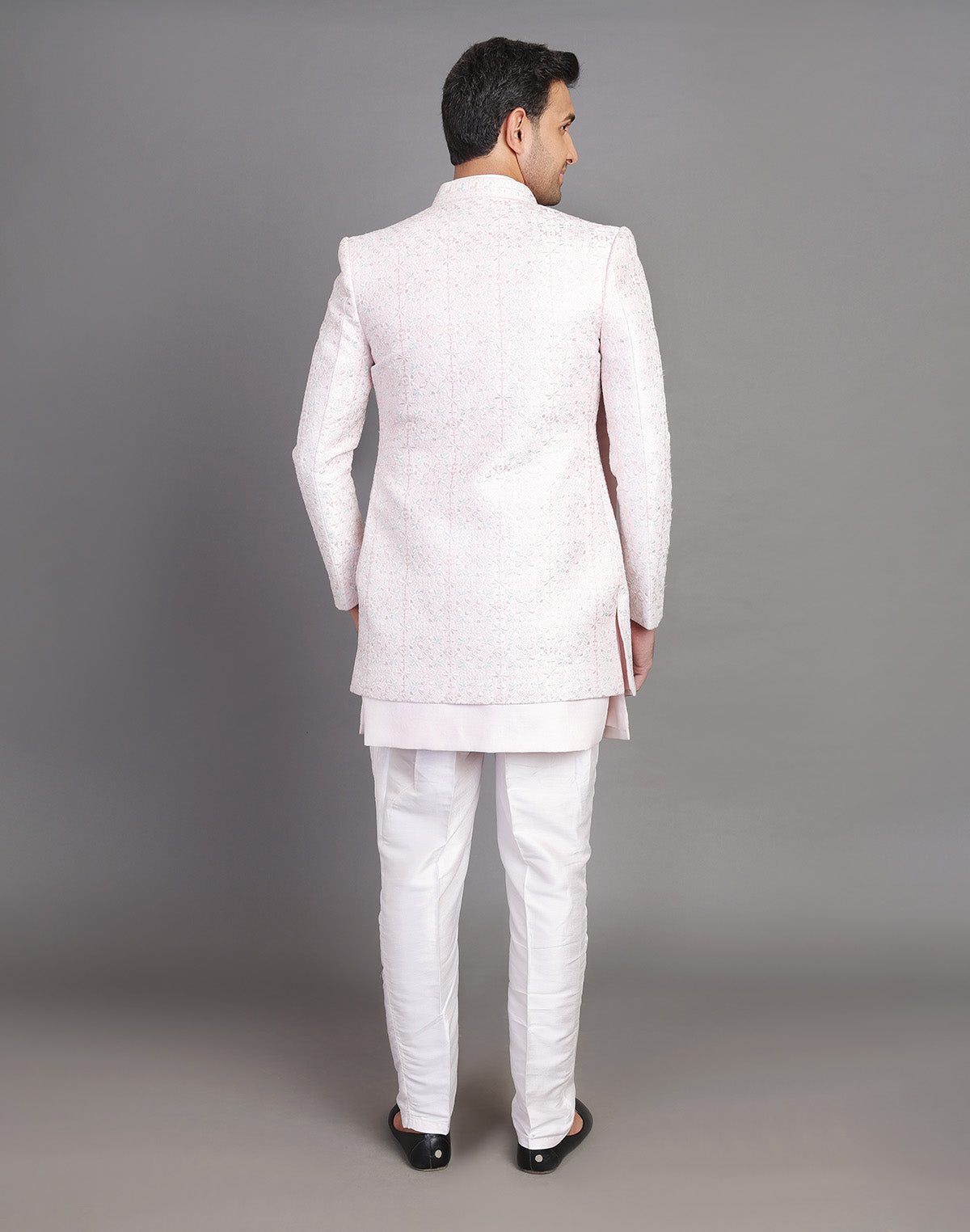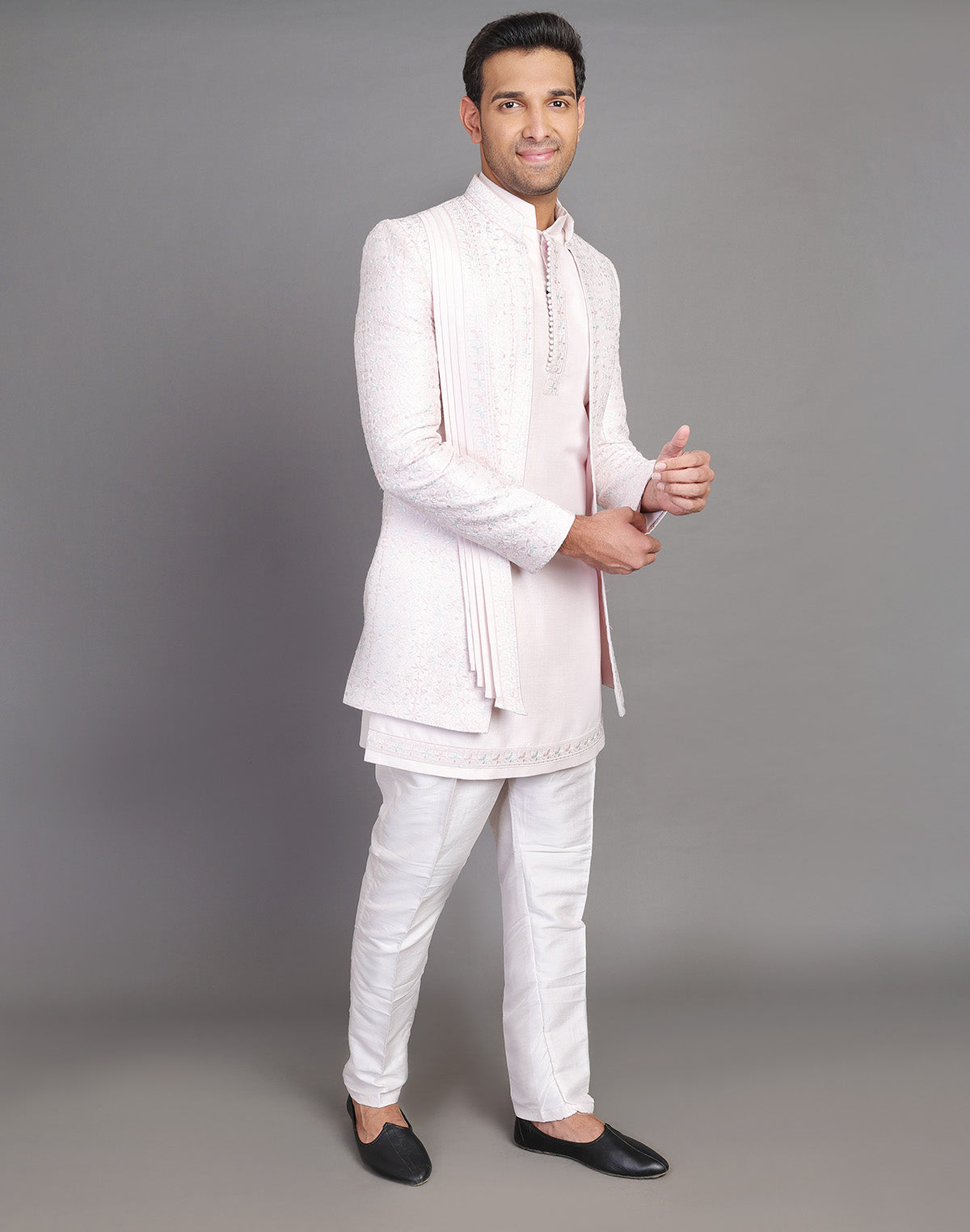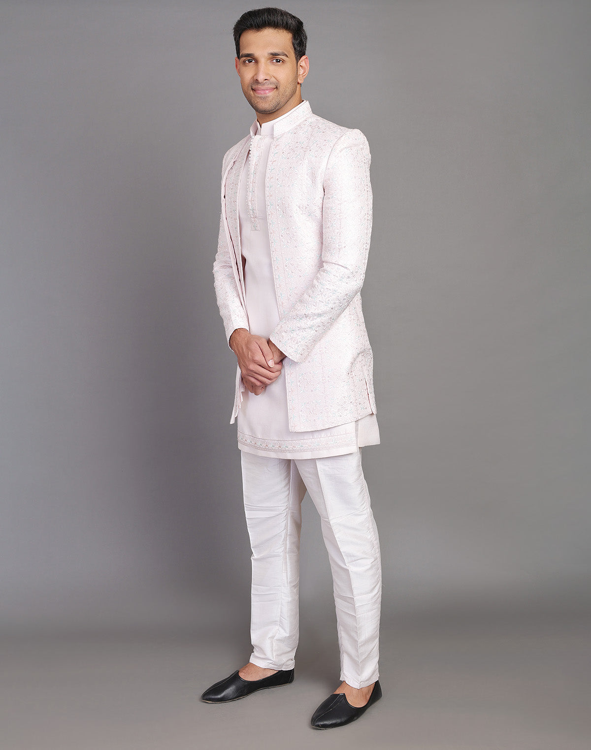 Stylish Pink Coloured Highlighted Thread with Embroidery Work Raw Silk Indo Open Jacket is a luxurious, elegant garment designed with intricate craftsmanship. The fabric is raw silk, featuring self-highlighted threads woven into the material, creating a subtle texture that enhances its beauty. The sequence work adds a touch of glamour, making it perfect for festive occasions. The Indo Open Jacket design gives it a modern yet traditional feel, ideal for layering over ethnic attire like sarees or lehengas, and is a stylish option for both formal and semi-formal events.