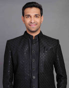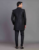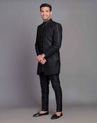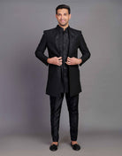 Raw Silk All Over Self Design Thread and Embellished Indo Open Style features intricate threadwork with a subtle self-design pattern on raw silk fabric. It is enhanced with embellishments for a touch of elegance and showcases an open-front design typical of traditional Indo-western fusion styles. This ensemble combines classic craftsmanship with modern flair for a sophisticated and versatile look.