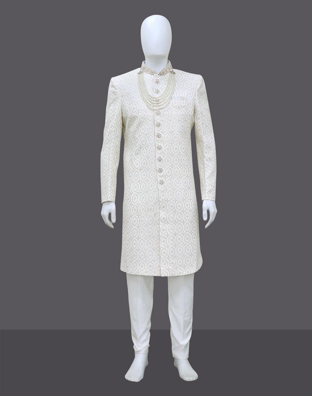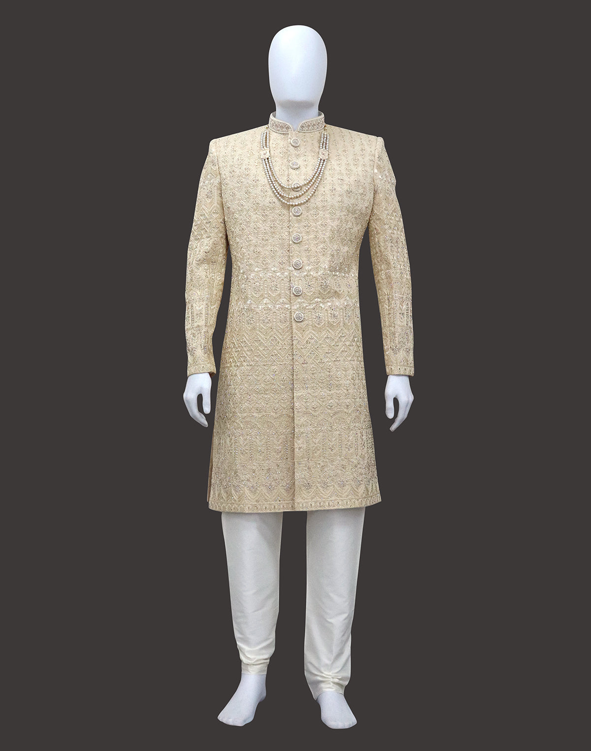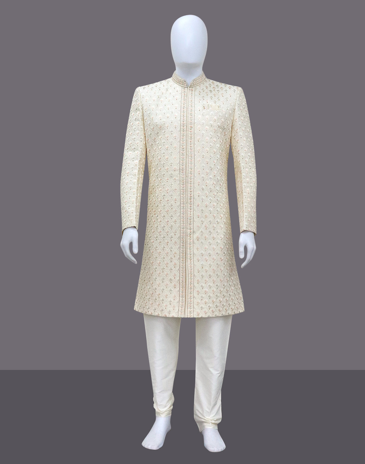 Cream Floral Multi Thread Embroidery with Stones work Milky Silk Sherwani