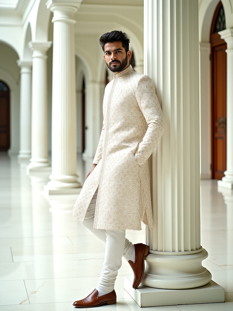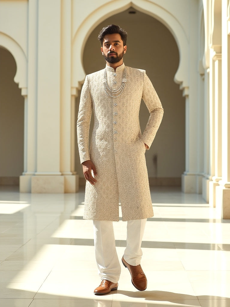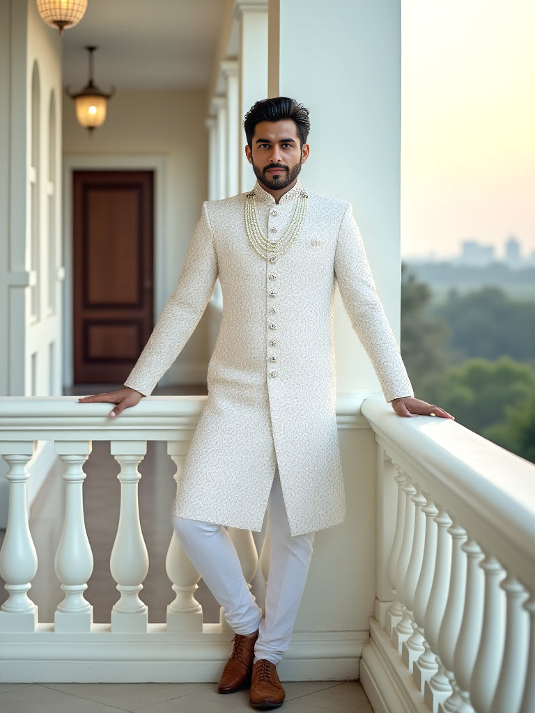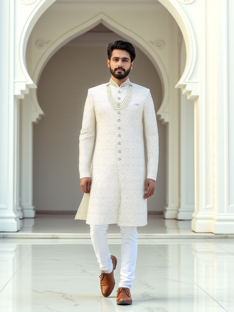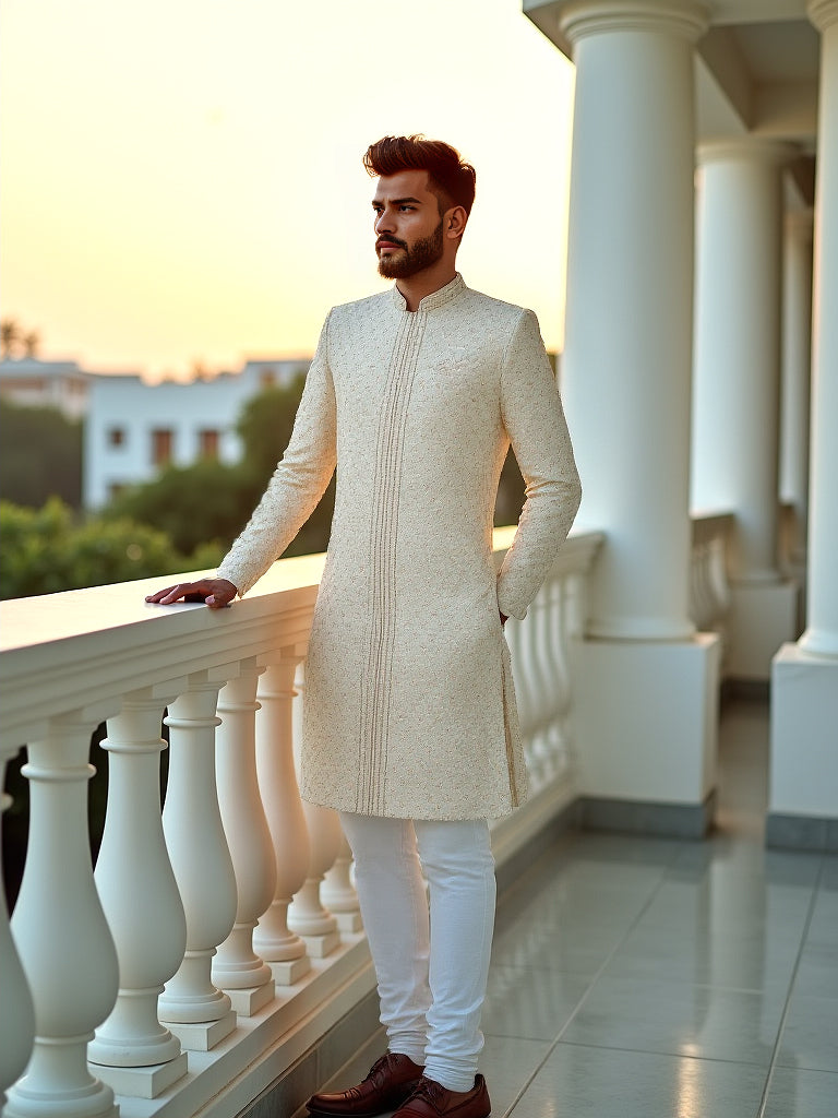 Cream Floral Multi Thread Embroidery with Stones work Milky Silk Sherwani