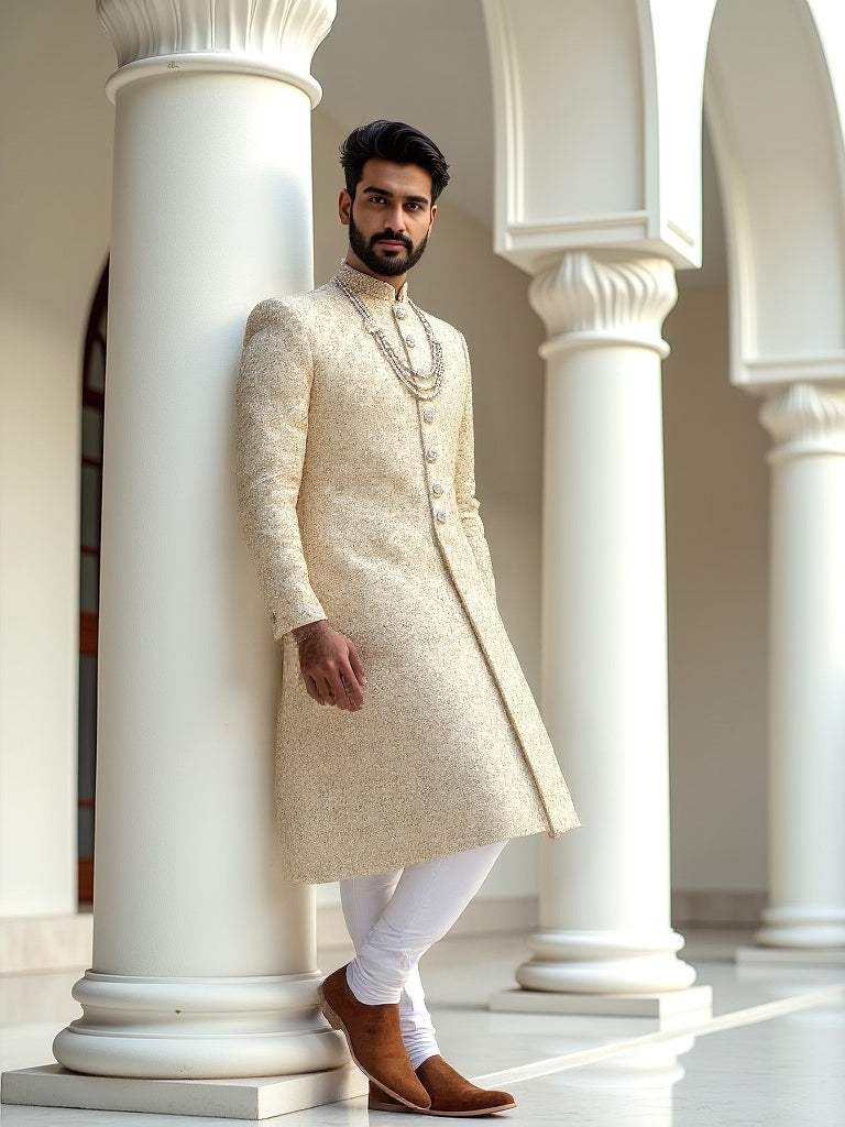 Embroidered with Stones Swed Cotton Sherwani in Cream