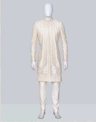 Cream Heavy Stones Swed Cotton Wedding Sherwani: Intricate stonework on soft Swed cotton, perfect for a grand wedding. Classic, elegant, and comfortable.