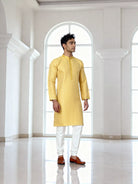 Look stunning in our Bright Yellow Trellis Patterned Jacquard Kurta paired with Off White Pyjama. Perfect for any party or festive occasion. Elevate your style effortlessly!