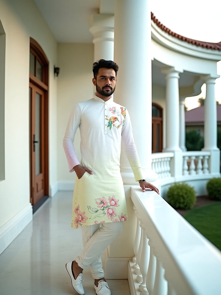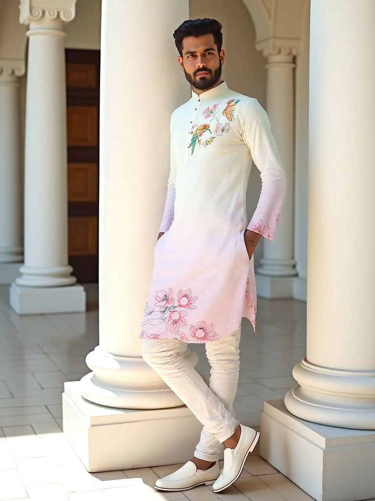 Step out in style with this white ombre printed cotton kurta, offering a fresh and modern ethnic look. Made from soft, breathable cotton, it ensures all-day comfort and a relaxed fit. The subtle ombre effect adds a touch of sophistication to the design. Paired with off-white pyjamas, it's ideal for festive occasions or casual outings.