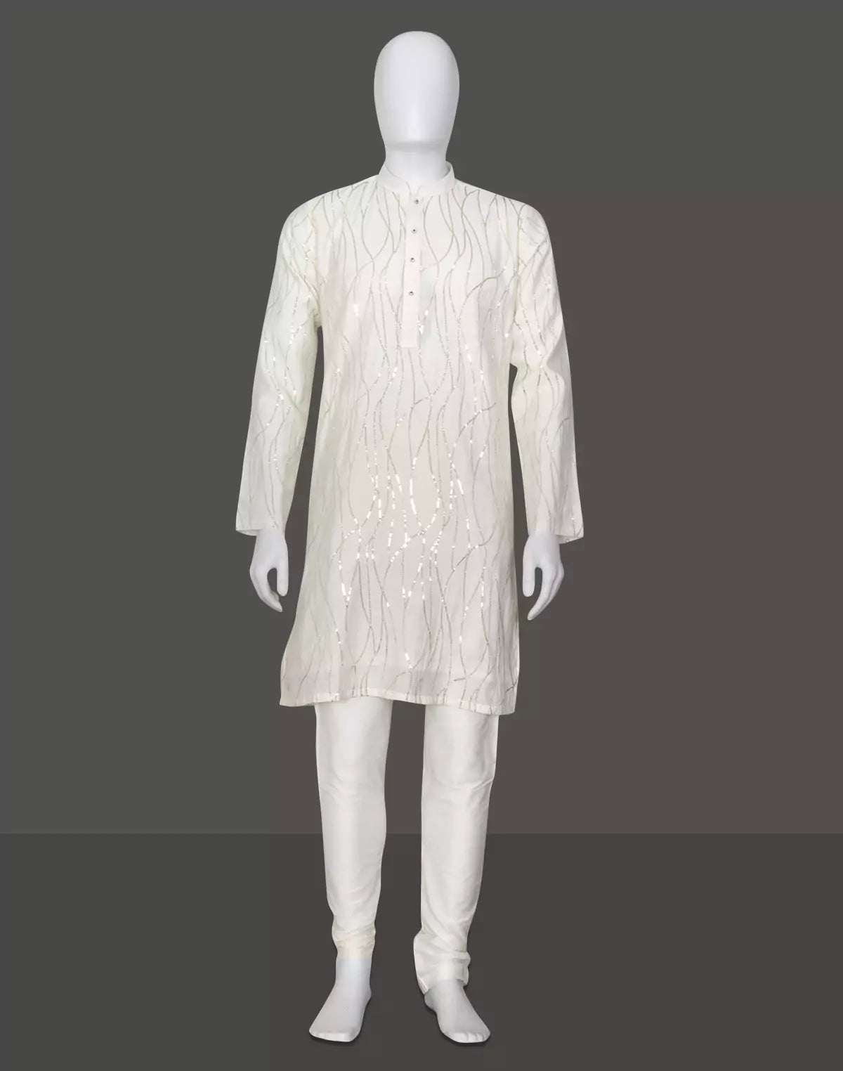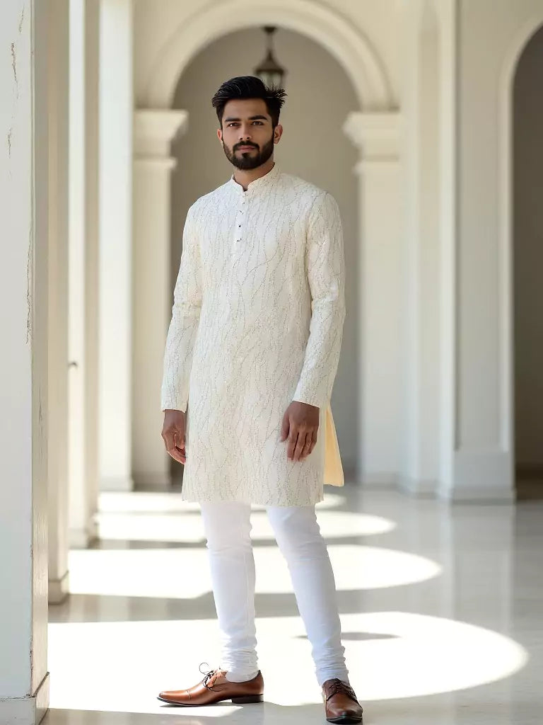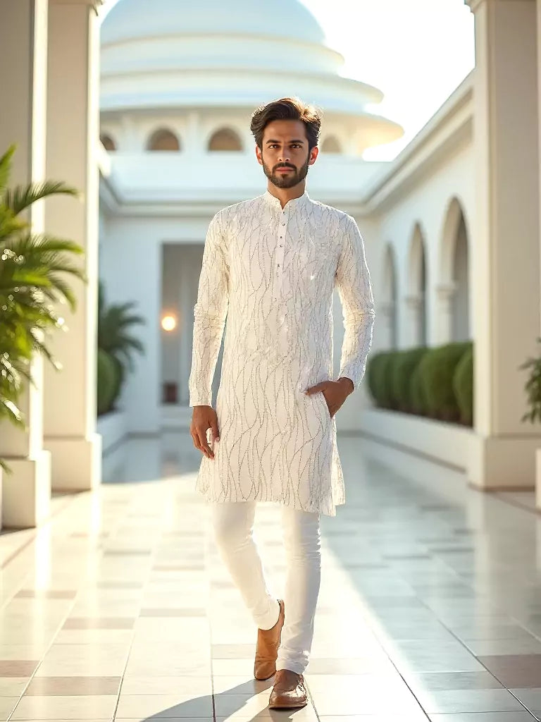 White All Over Sequence work Raw Silk Elegant Kurta Pyjama Set