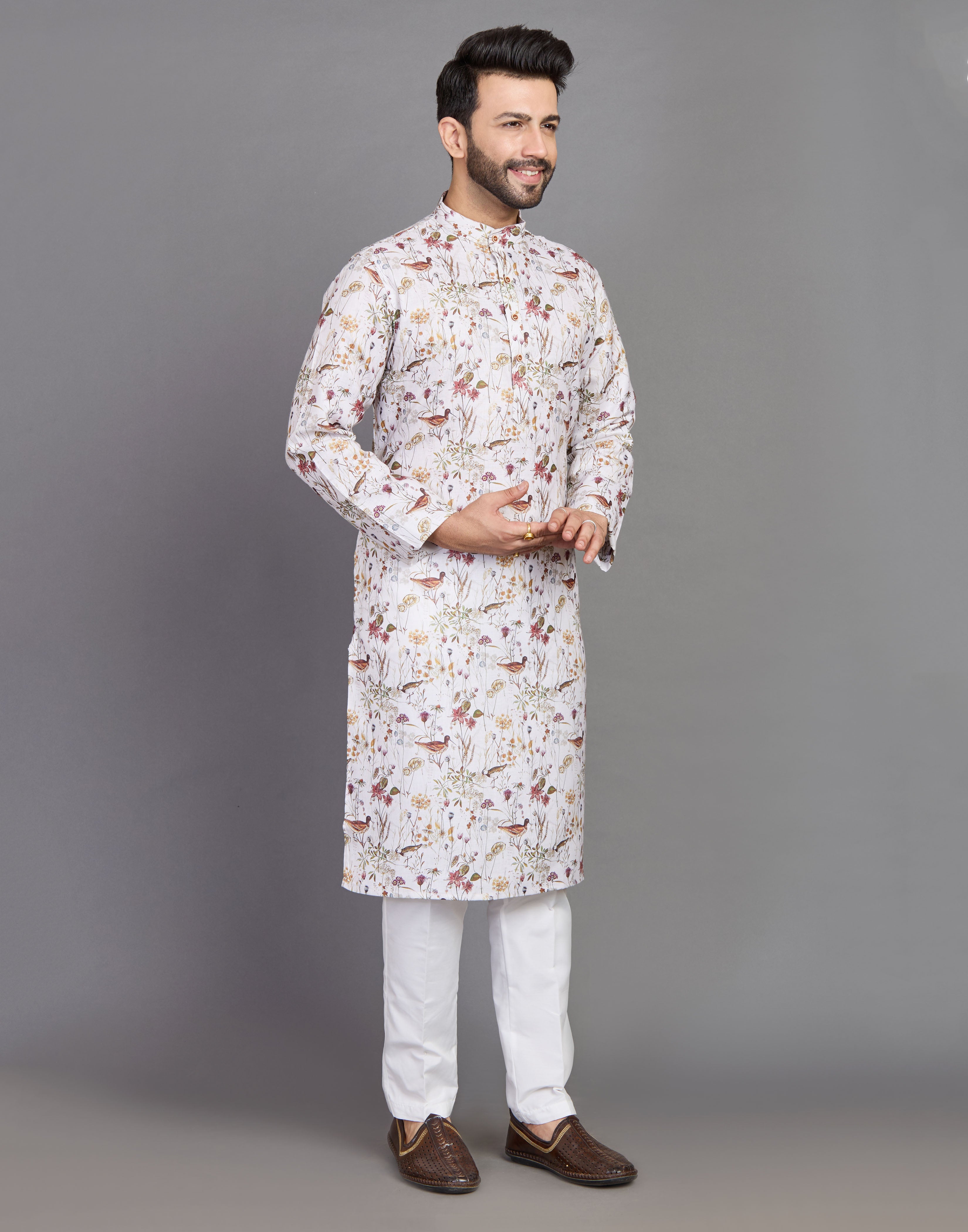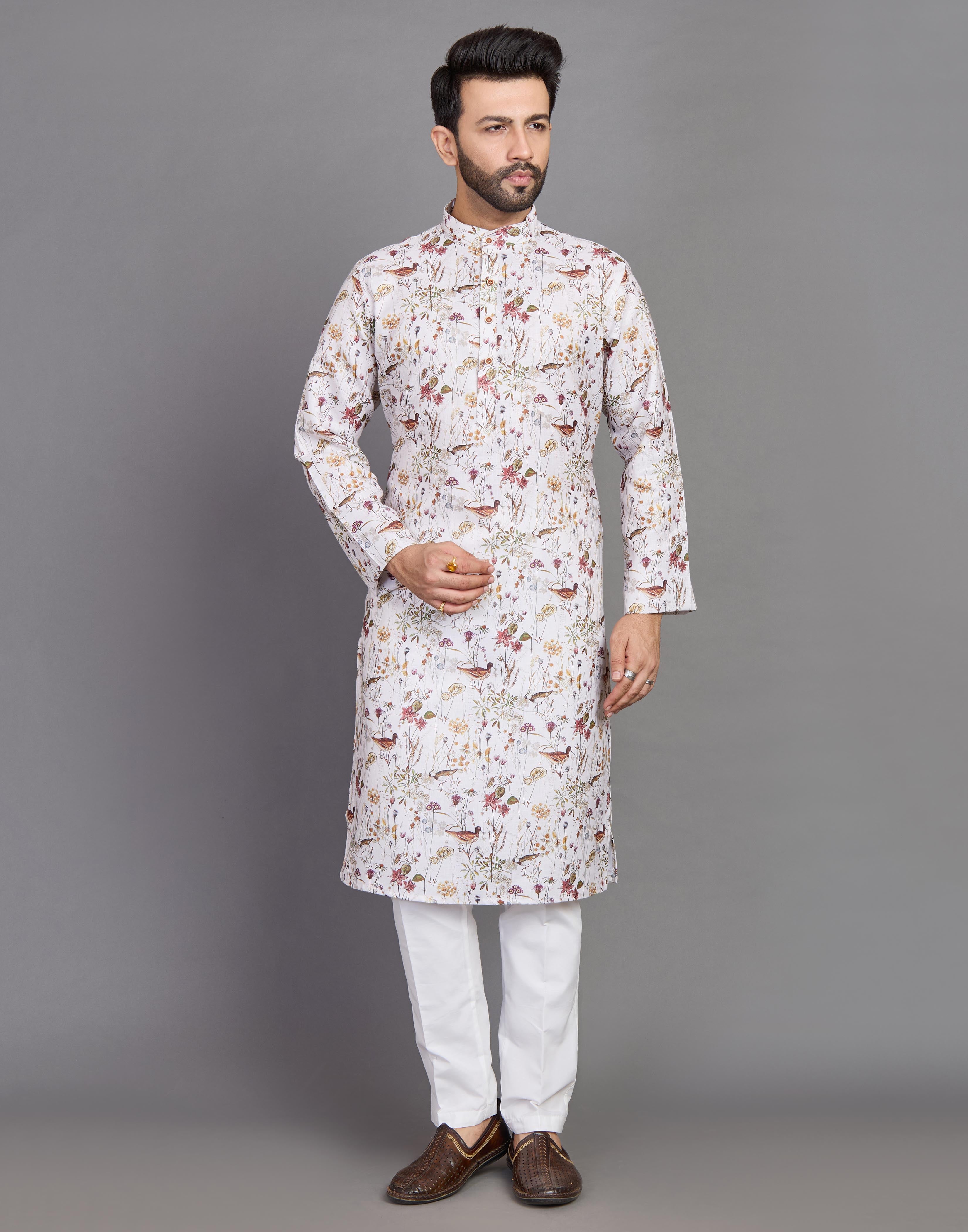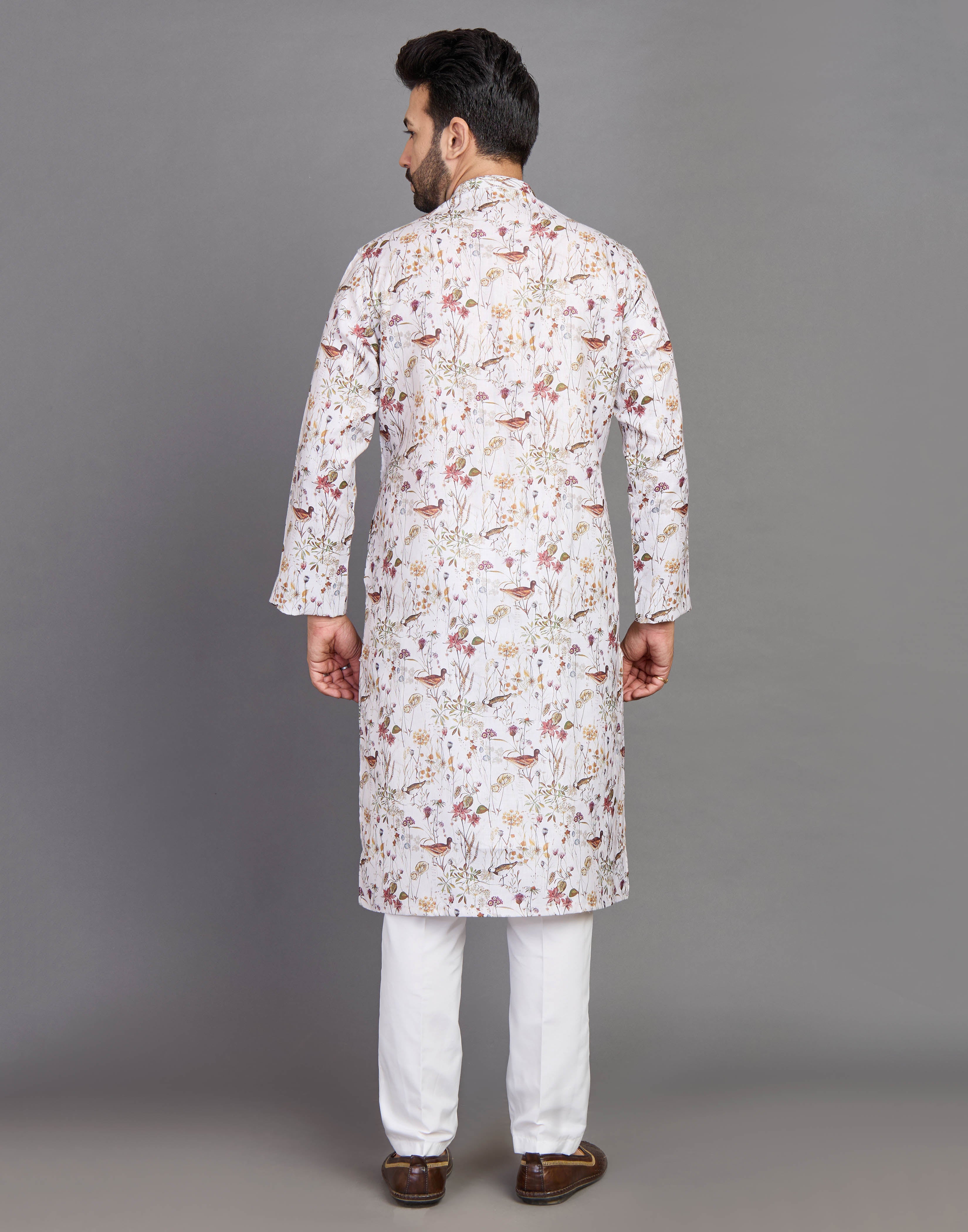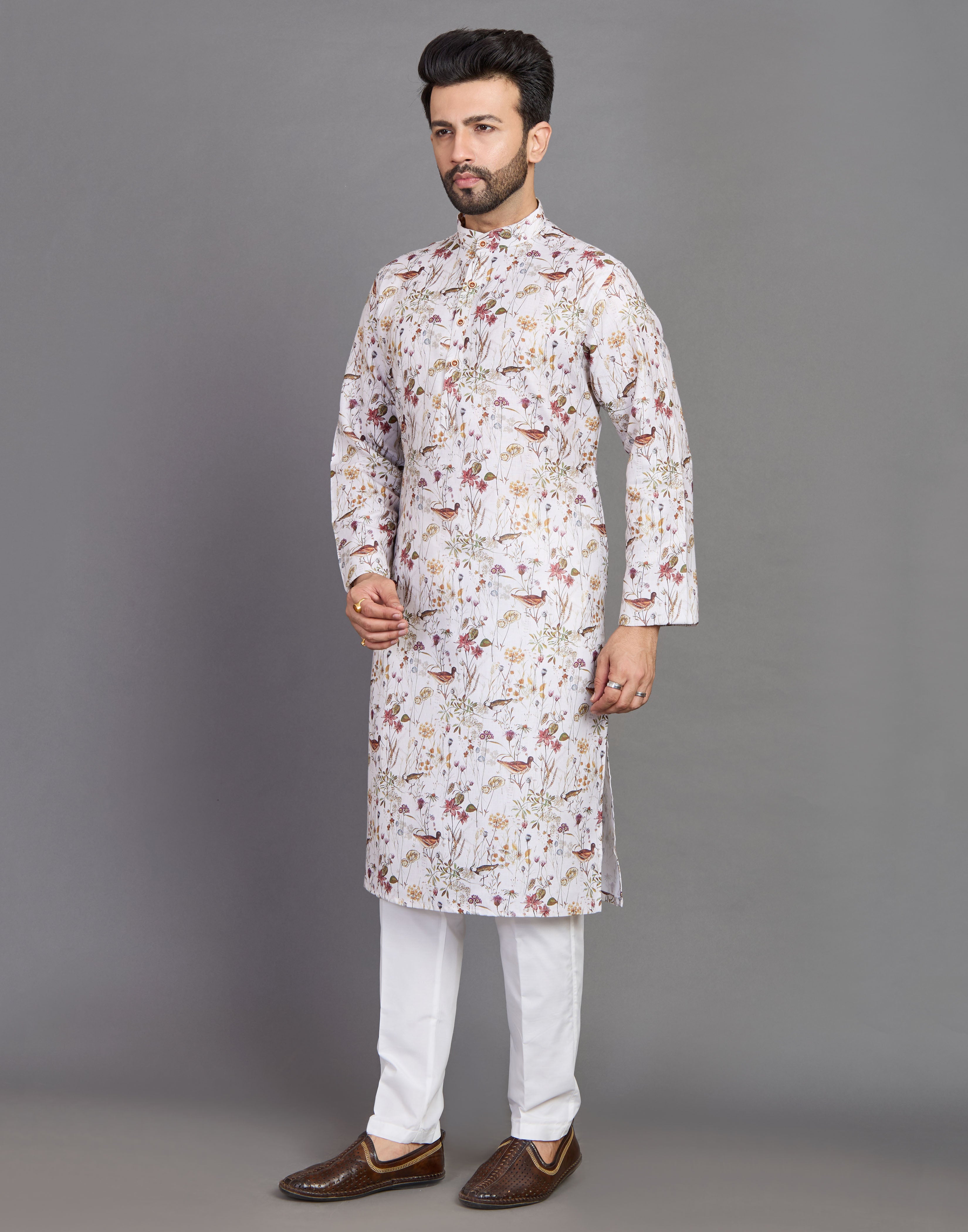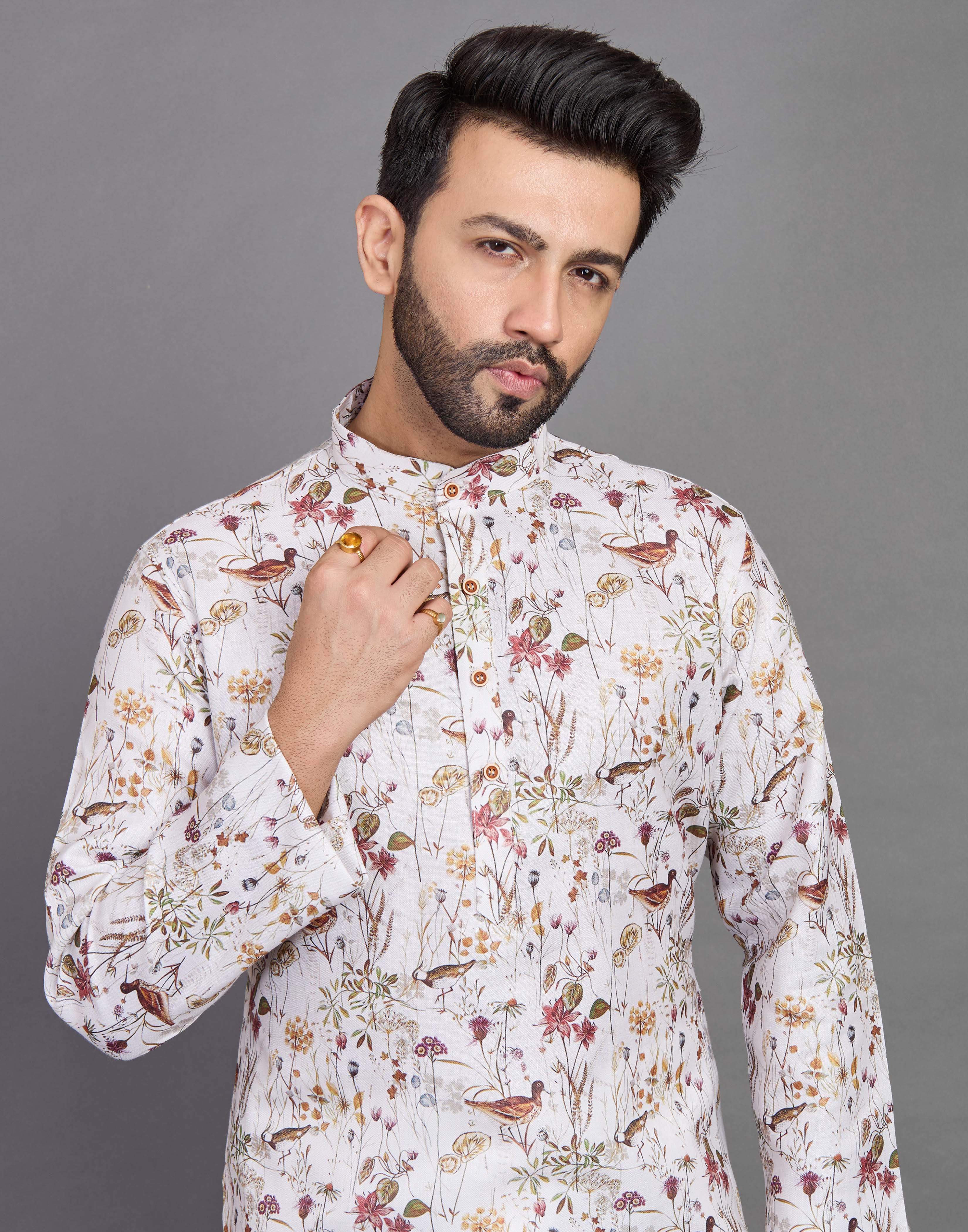 Cotton Leaf & Birds Printed Party Wear Style Kurta Men