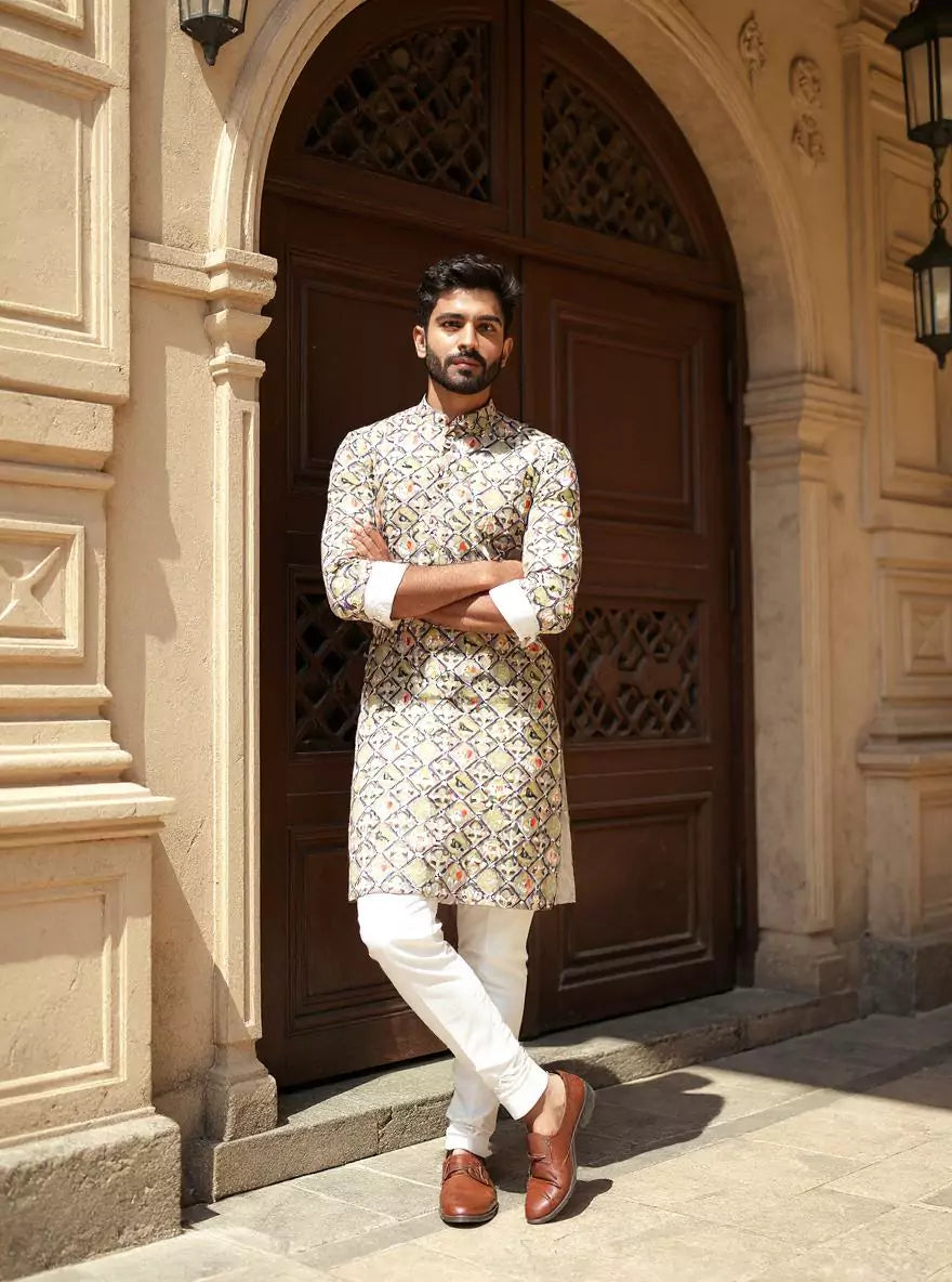 Fawn Ikat Print Regular Fit Giza Cotton Kurta