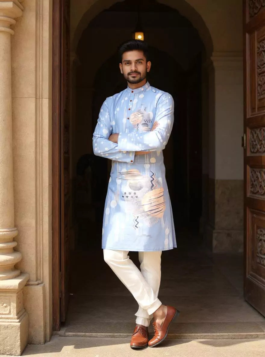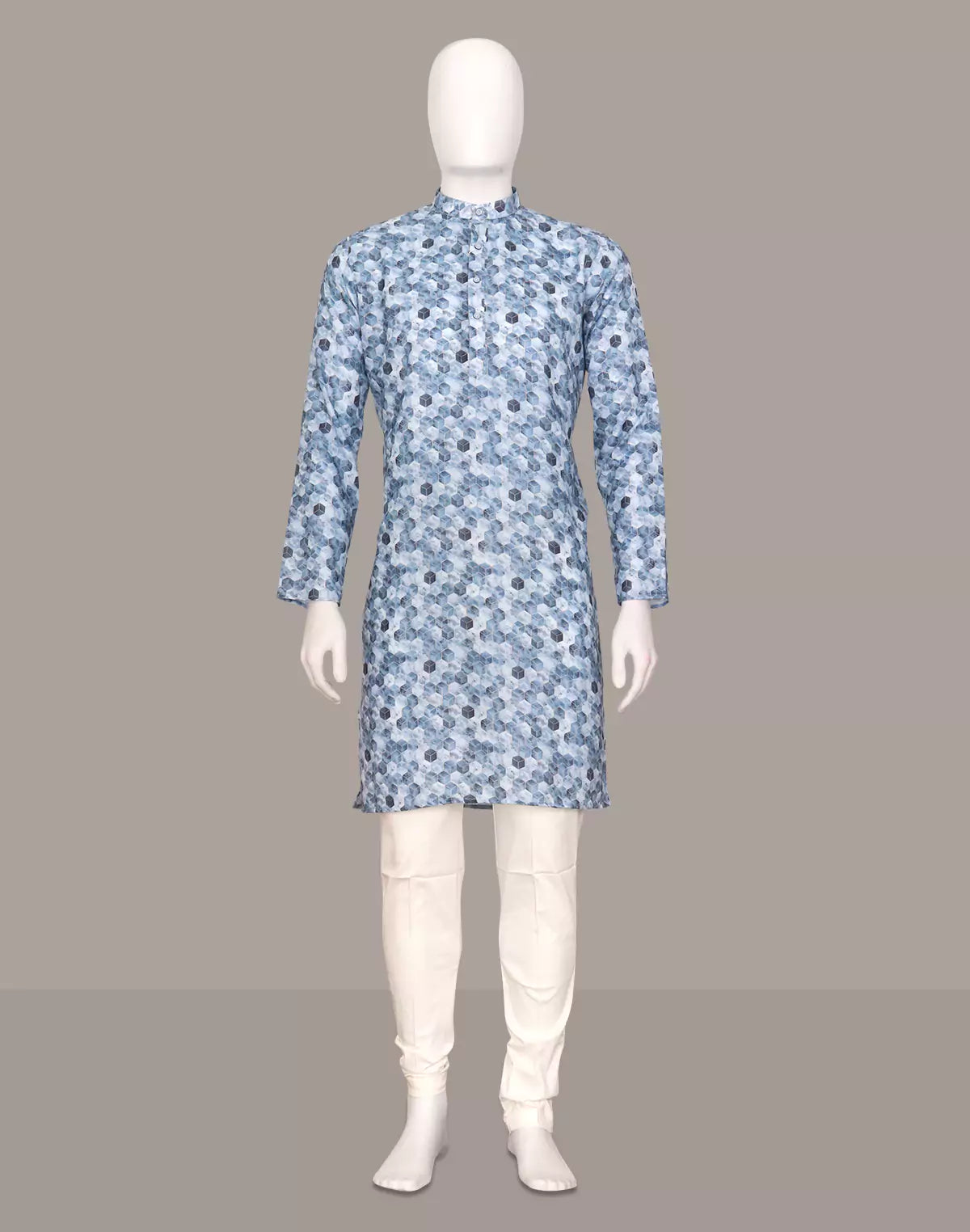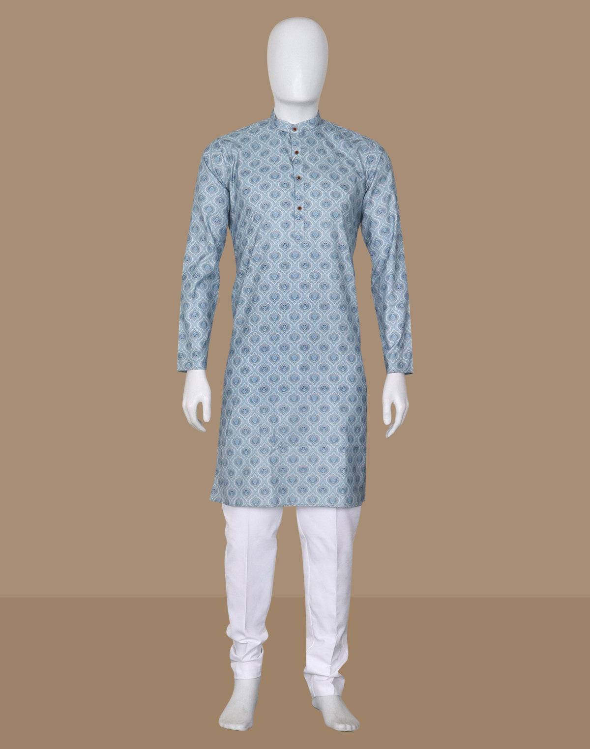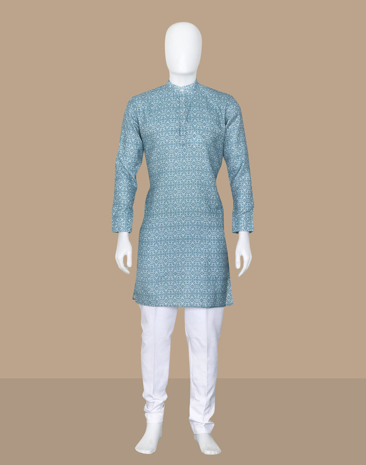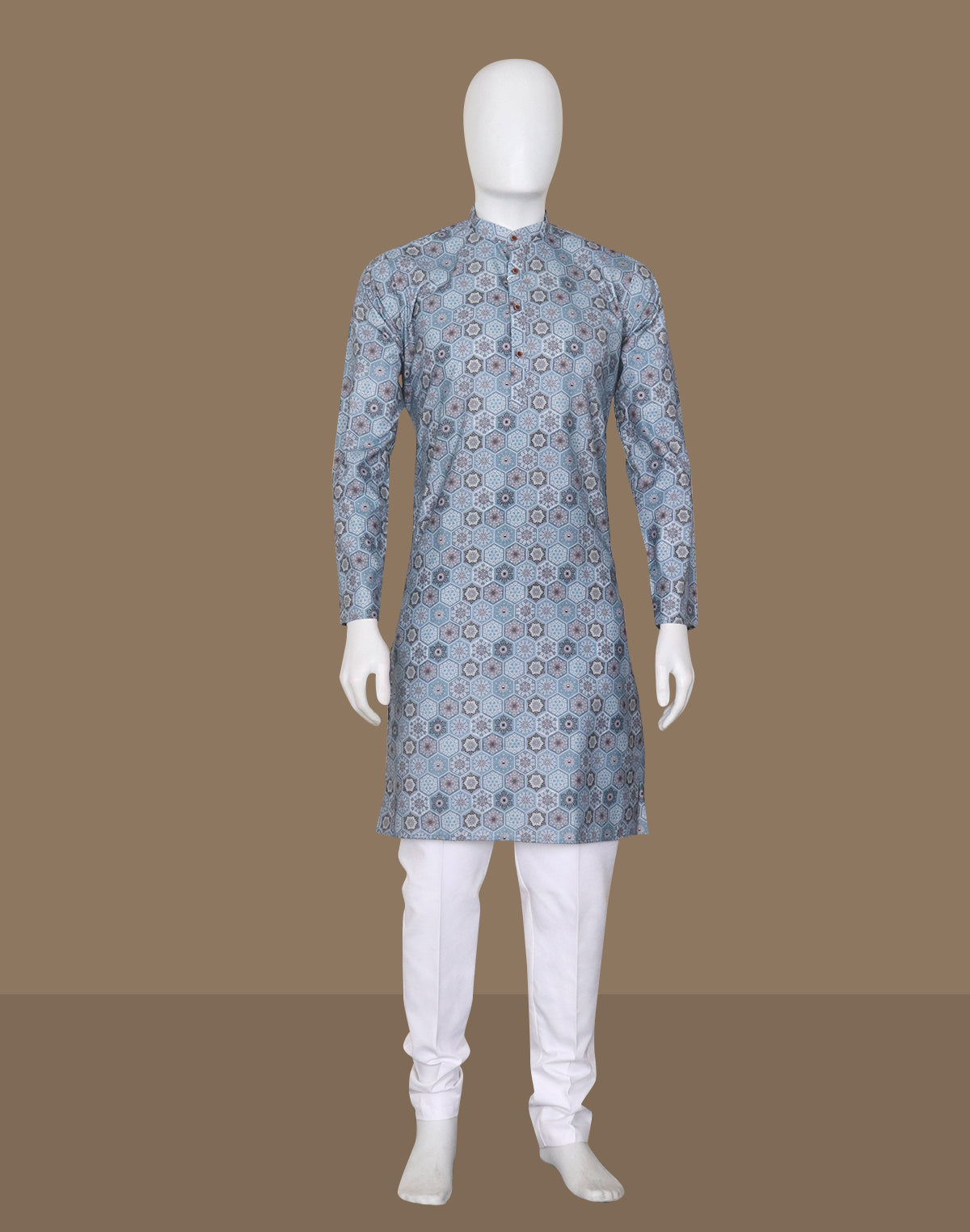 Light Sky Geometric Print Cotton Silk Kurta for Men