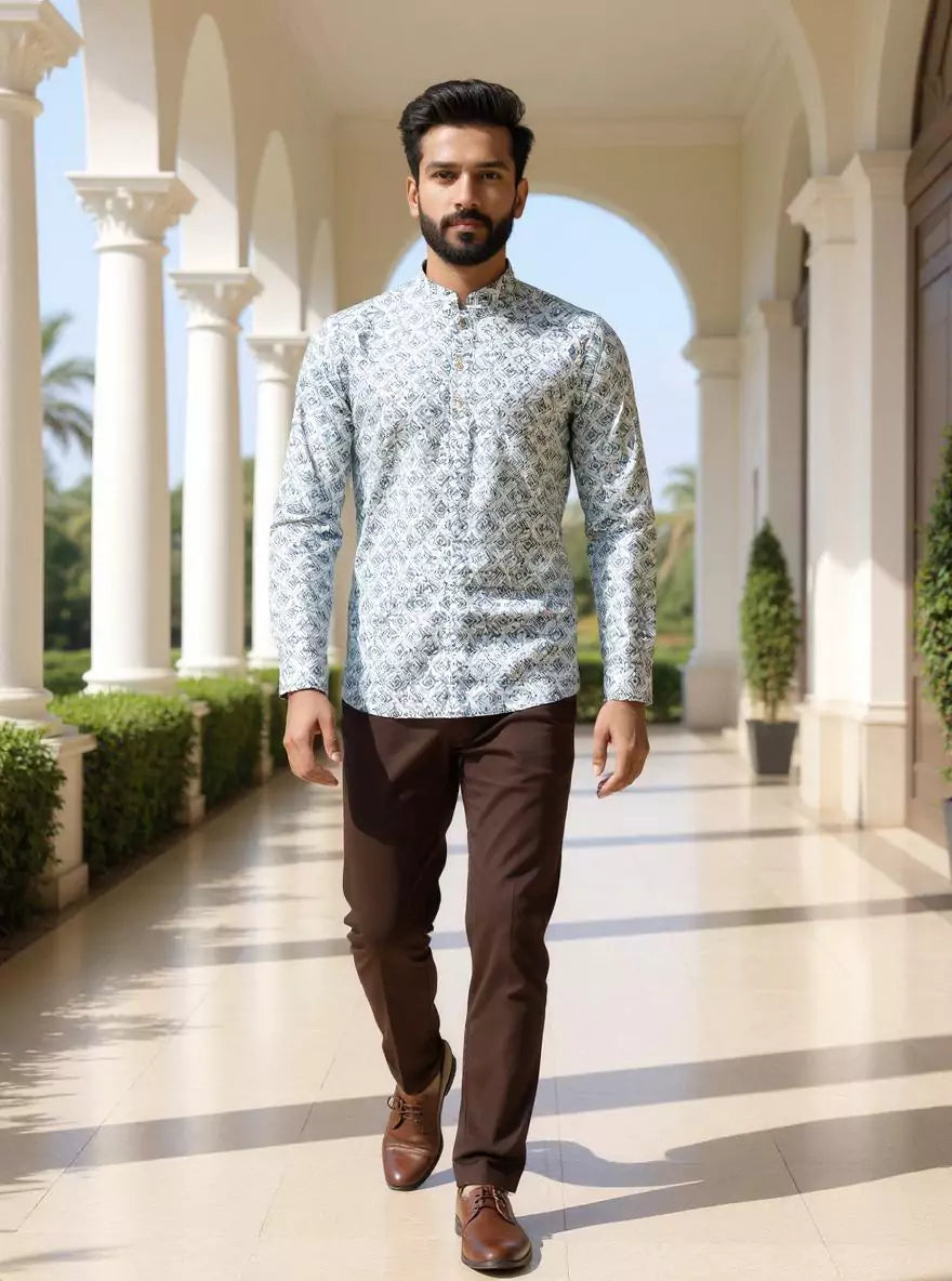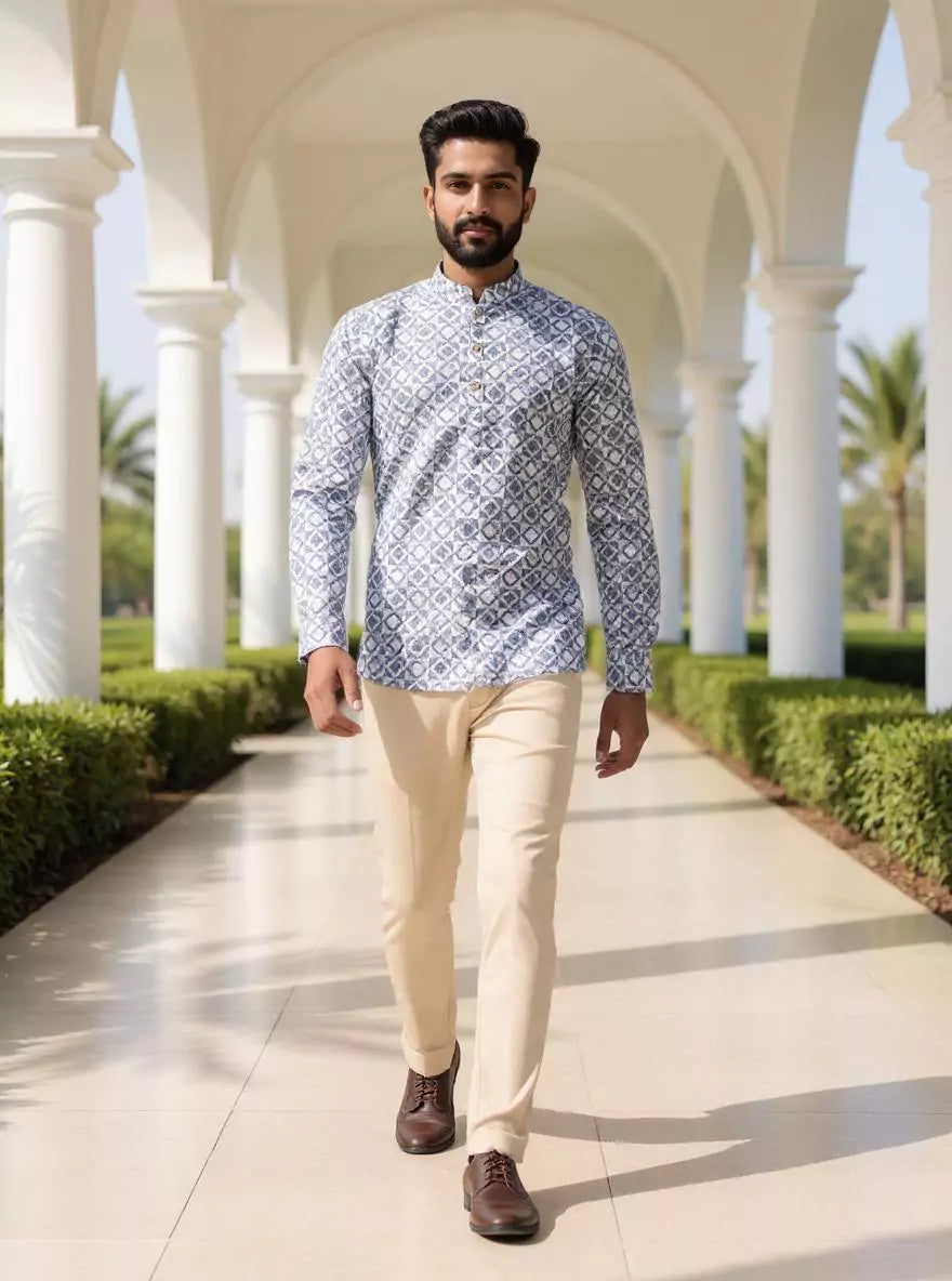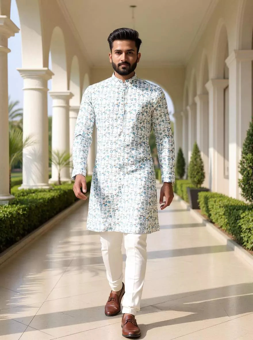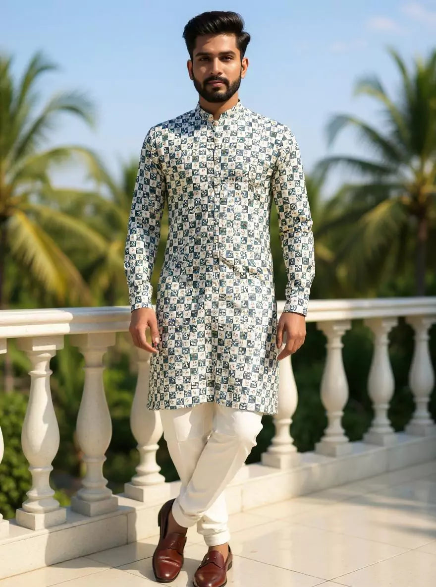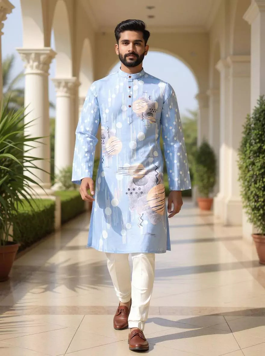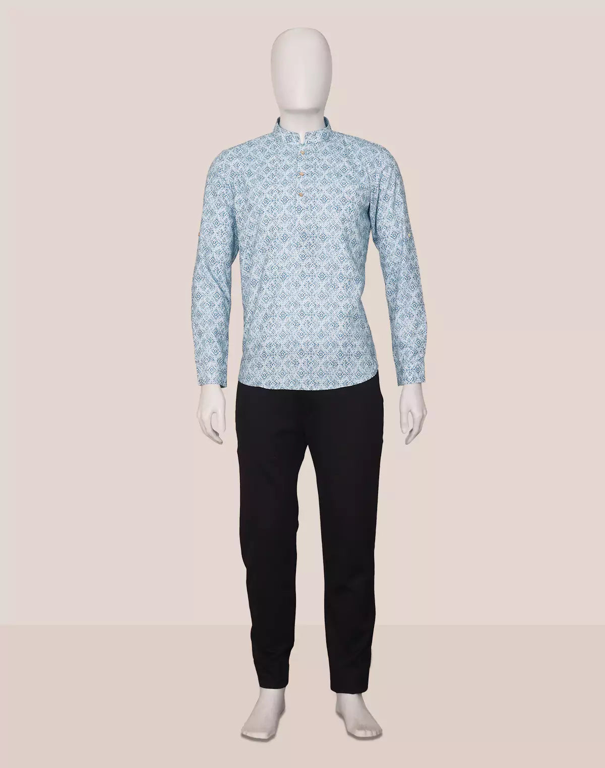 Light Sky Geometric Print Cotton Silk Kurta for Men