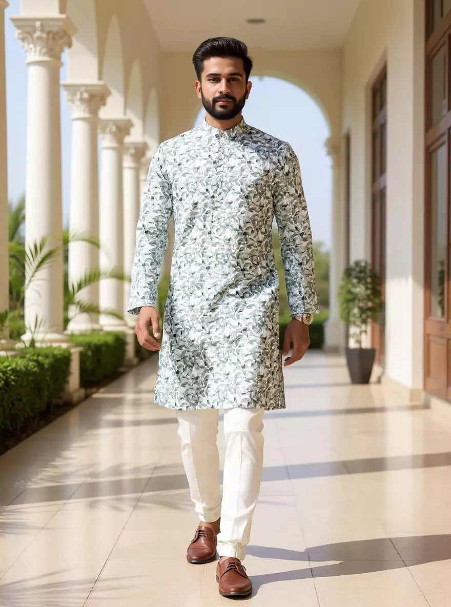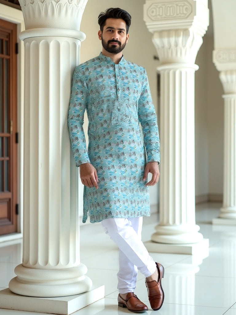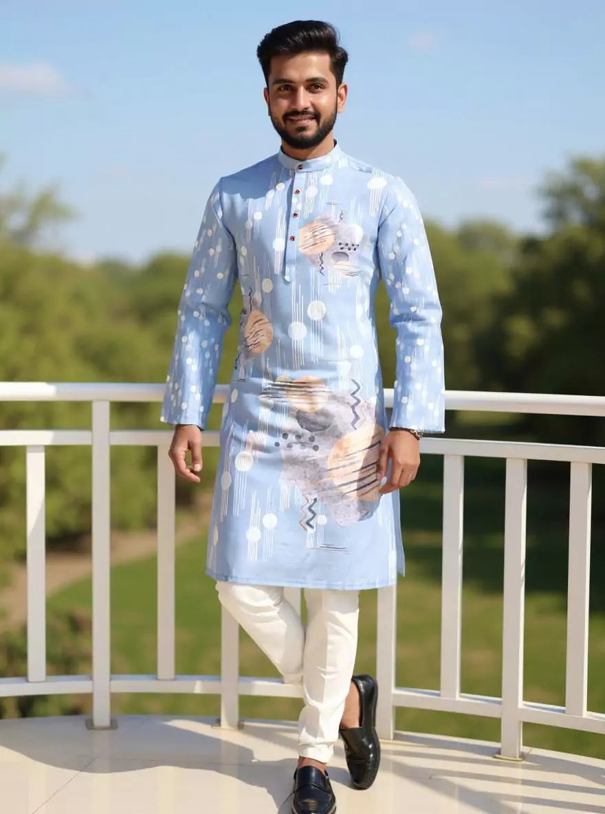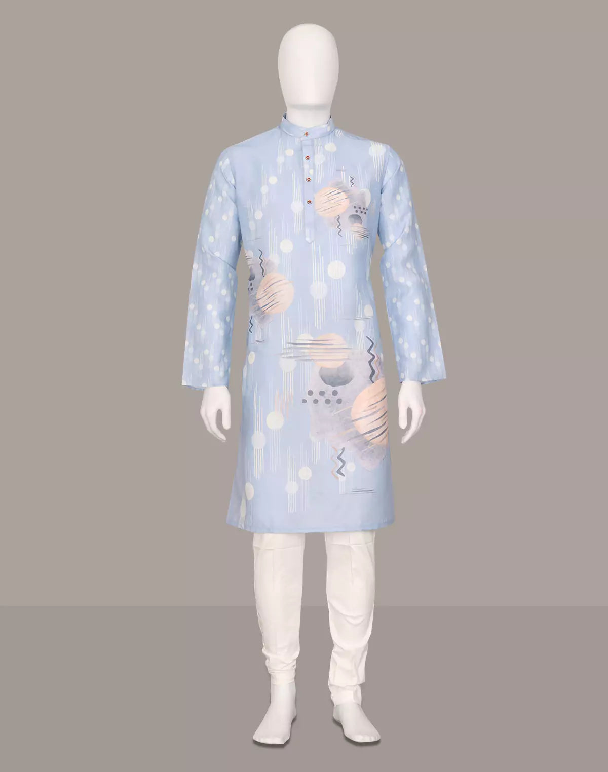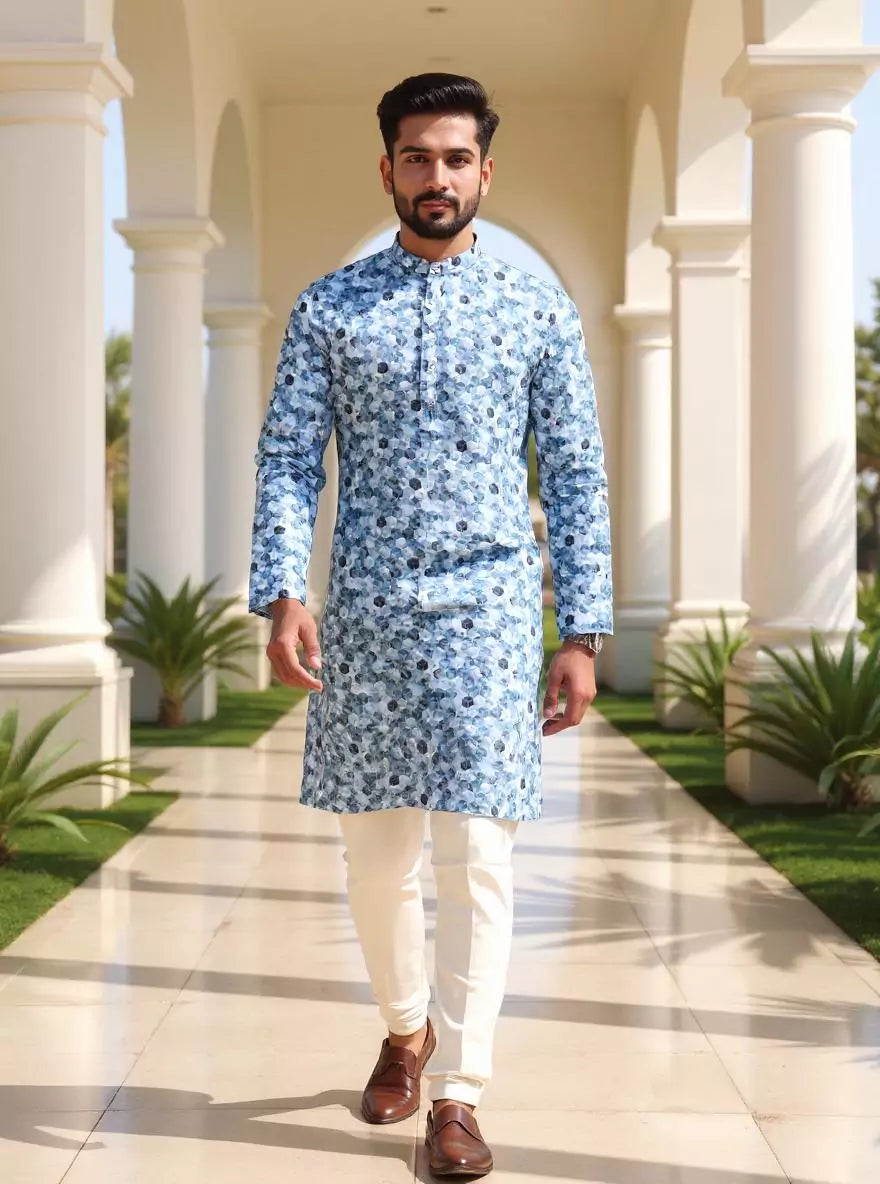 Light Sky Geometric Print Cotton Silk Kurta for Men
