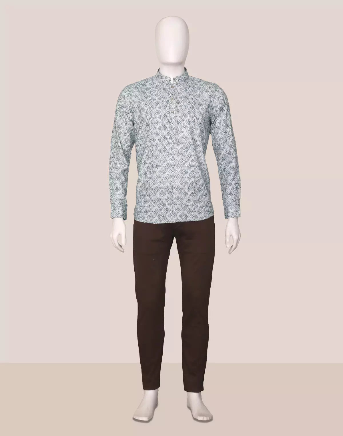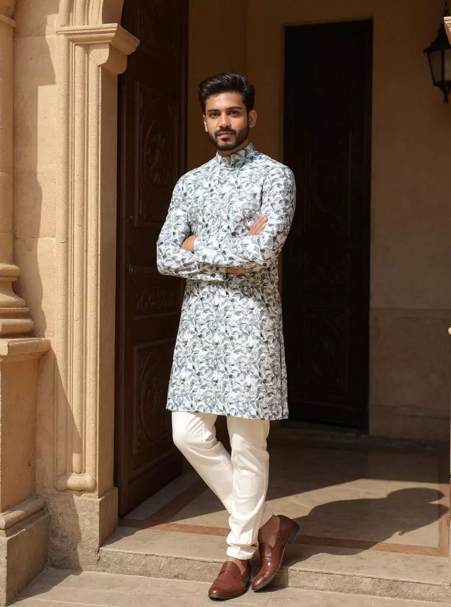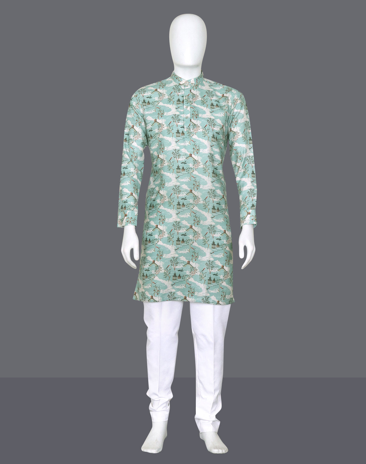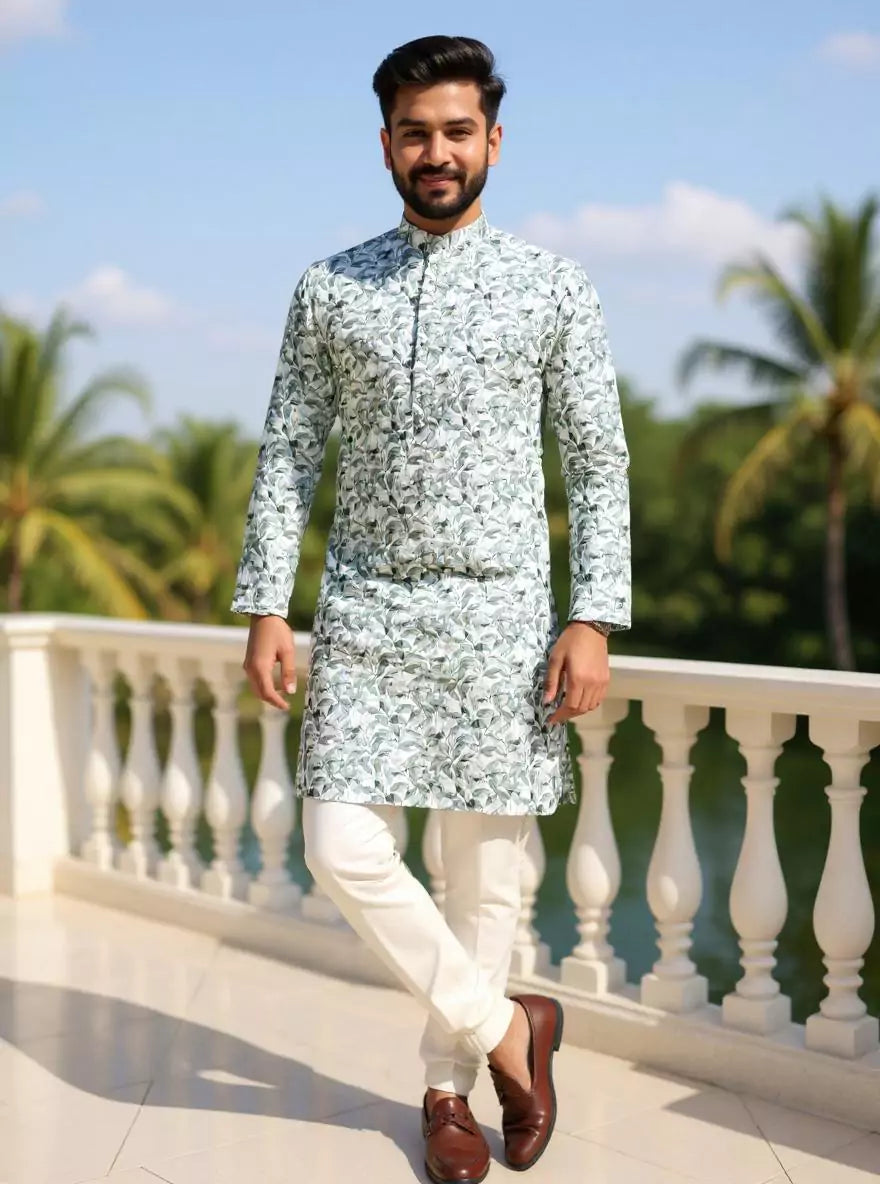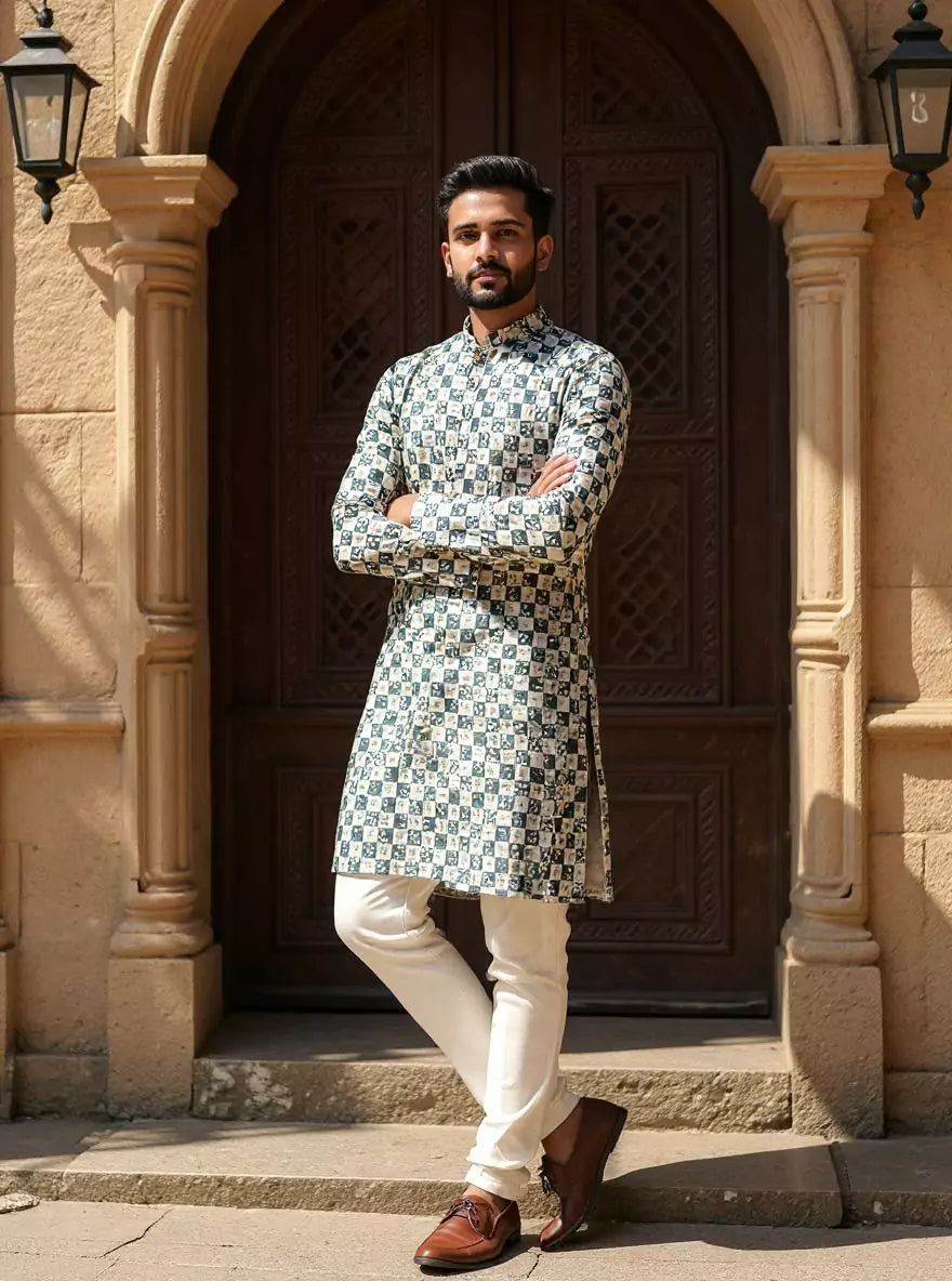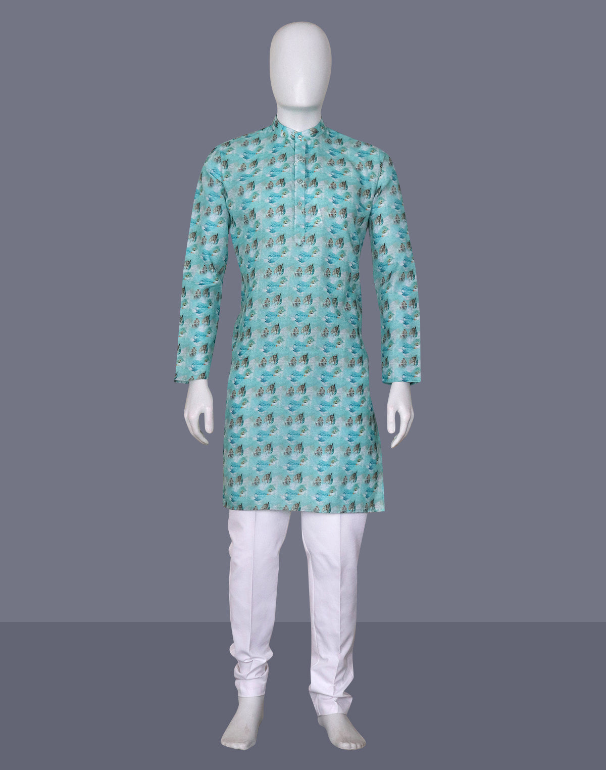 Light Sky Geometric Print Cotton Silk Kurta for Men