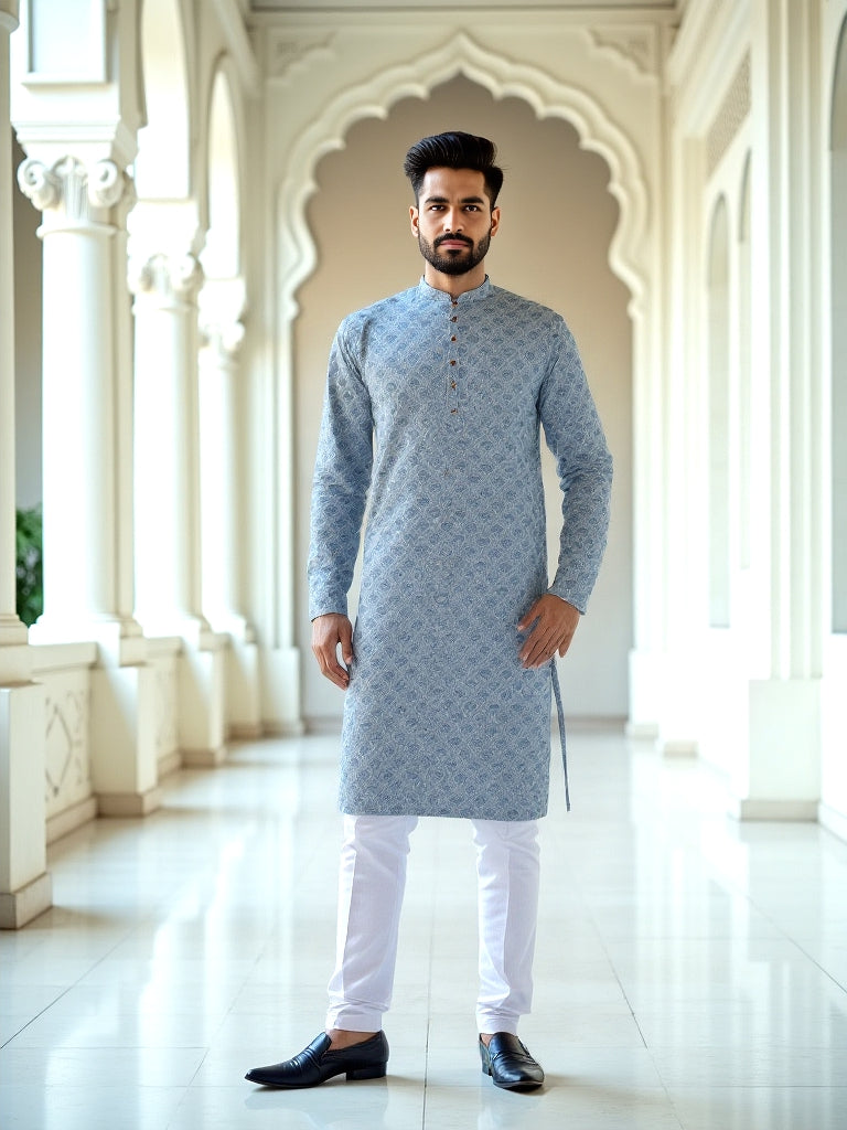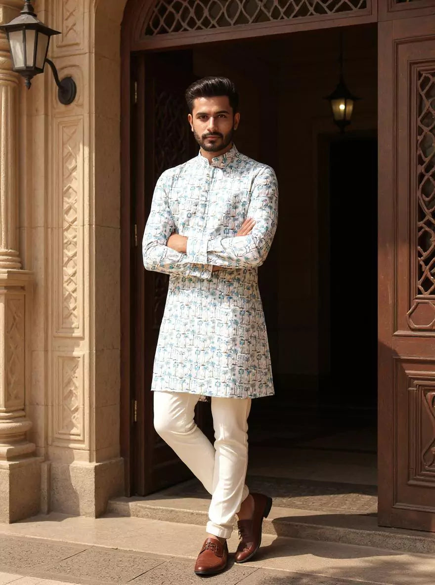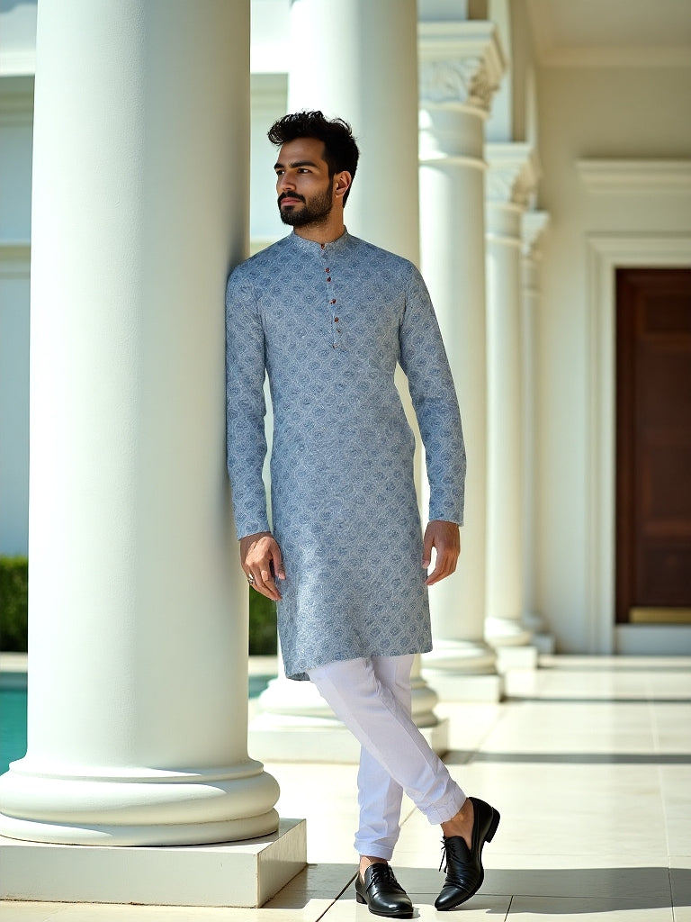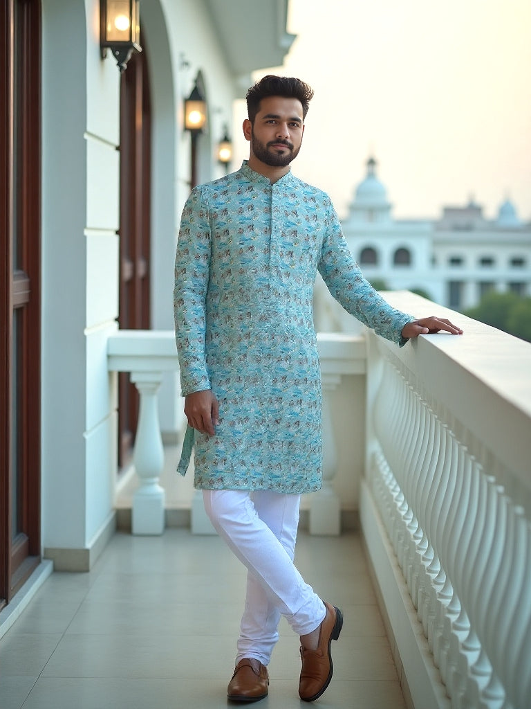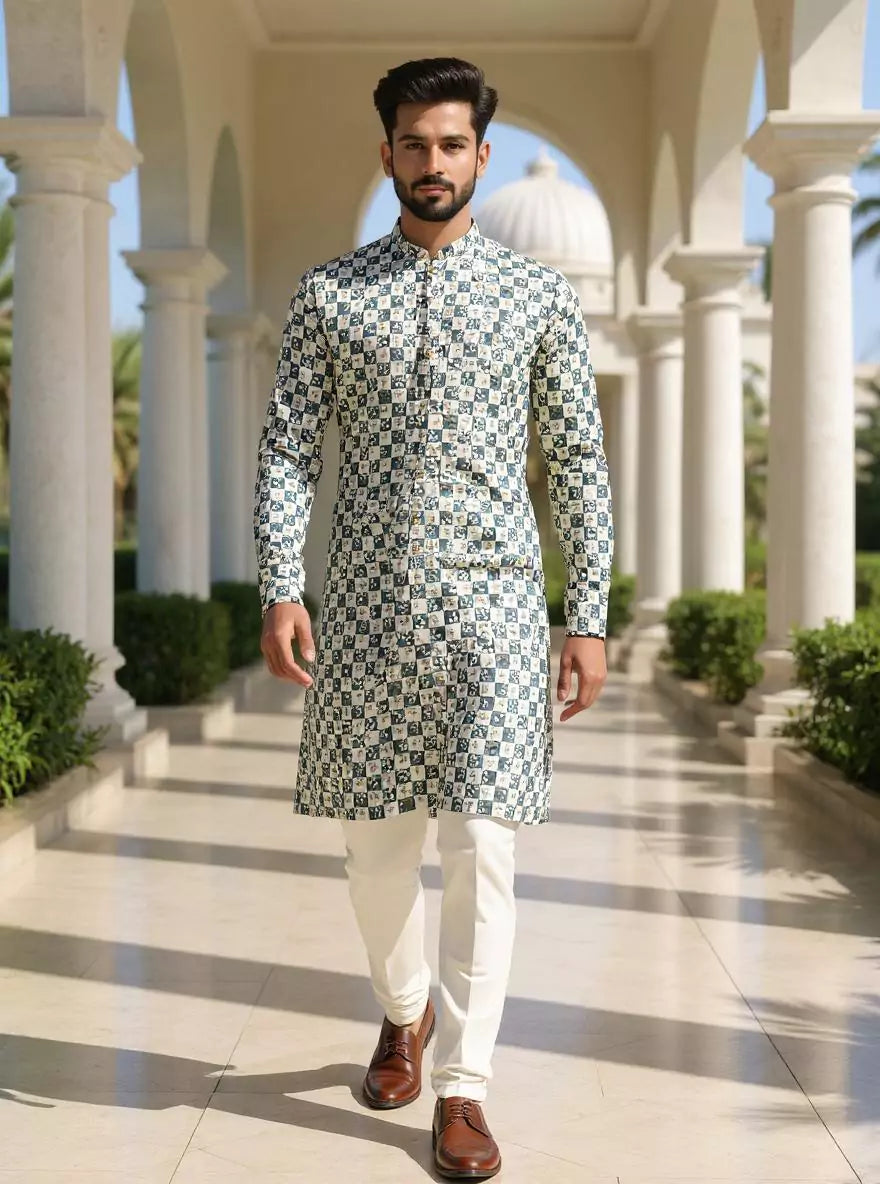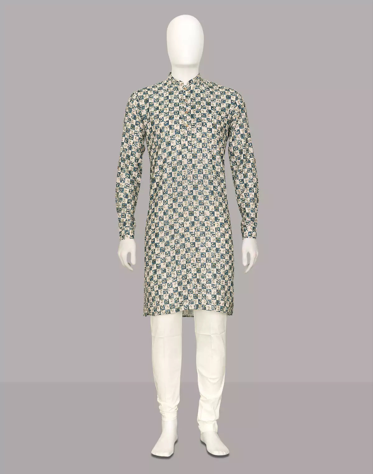 Light Sky Geometric Print Cotton Silk Kurta for Men