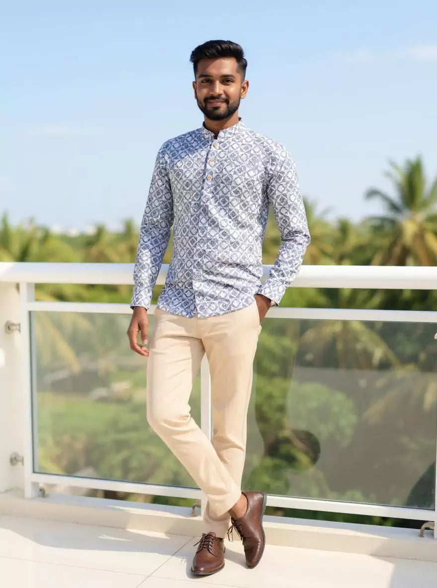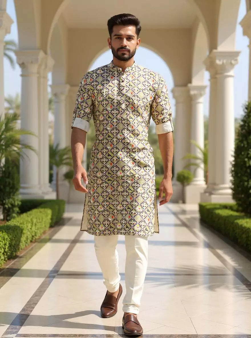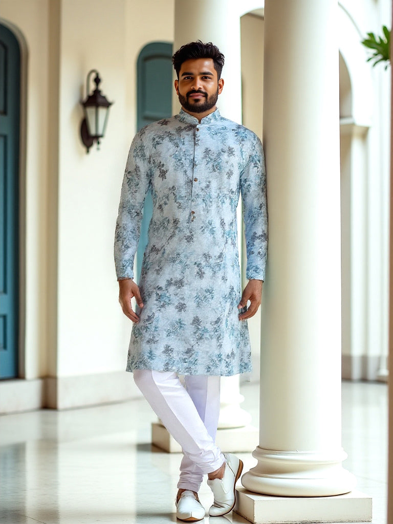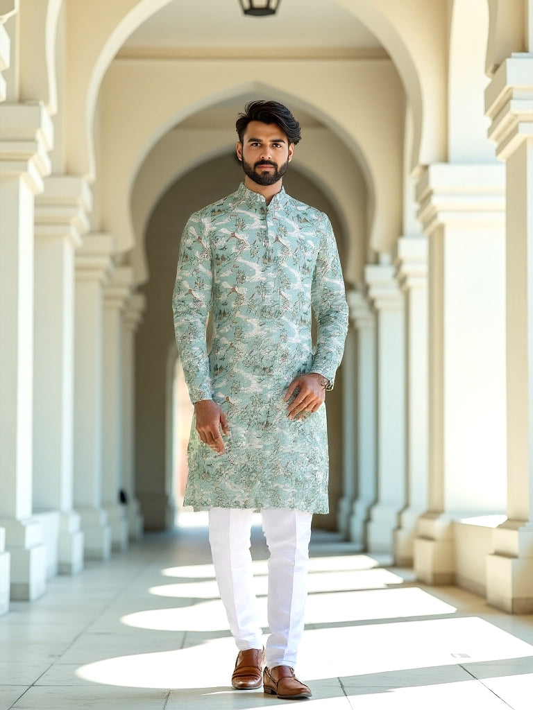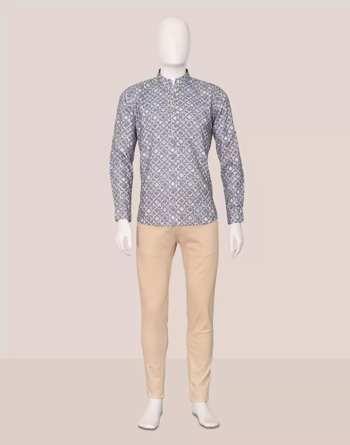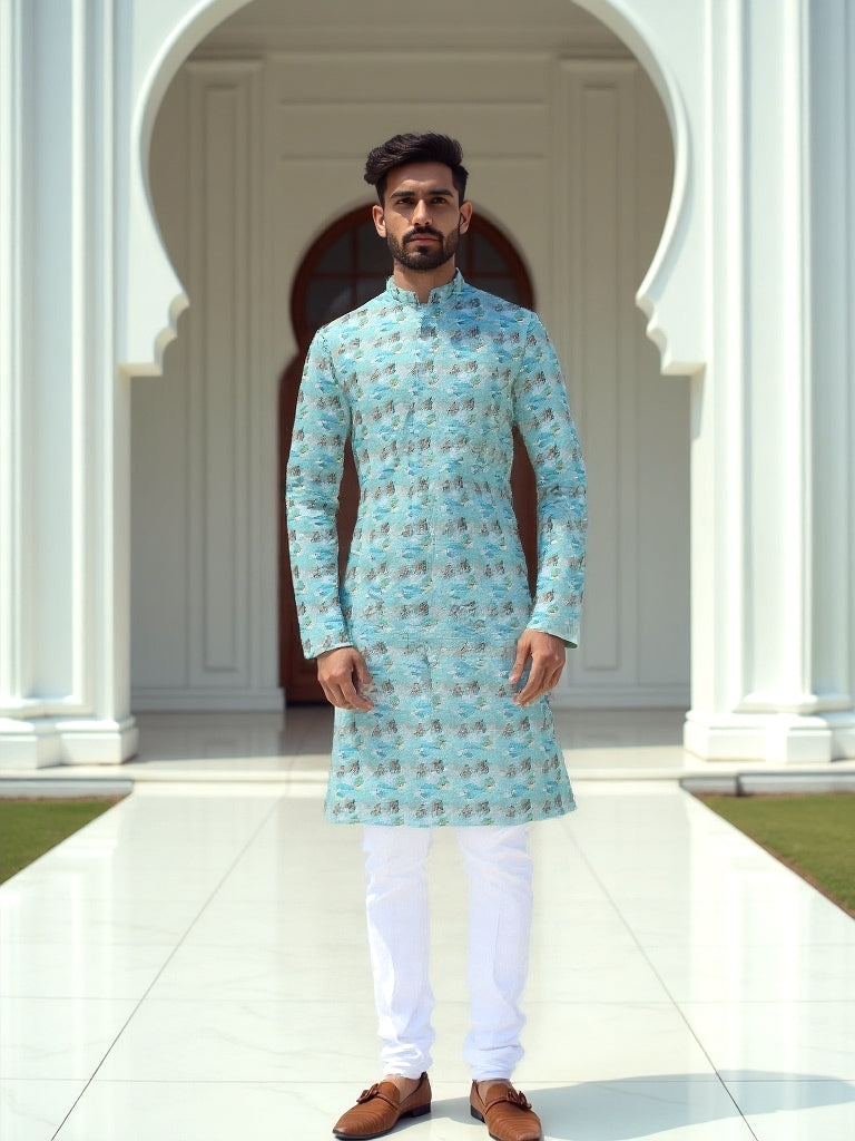 Light Sky Geometric Print Cotton Silk Kurta for Men