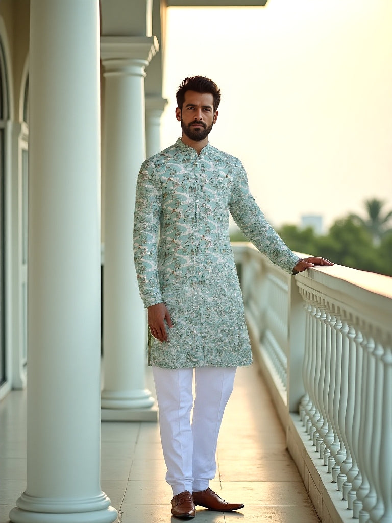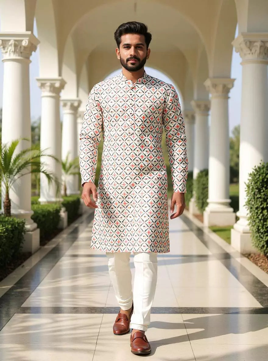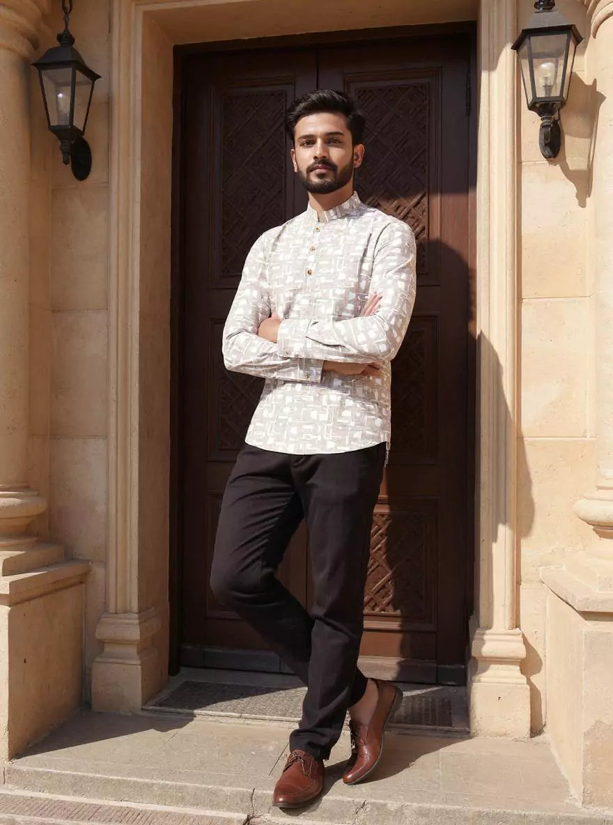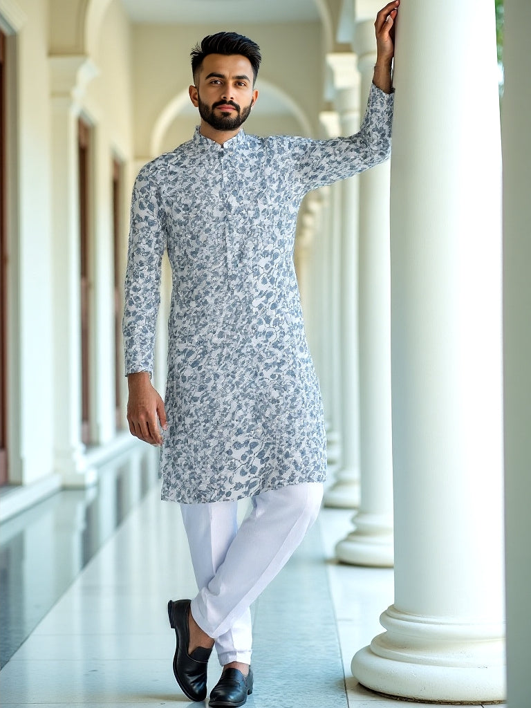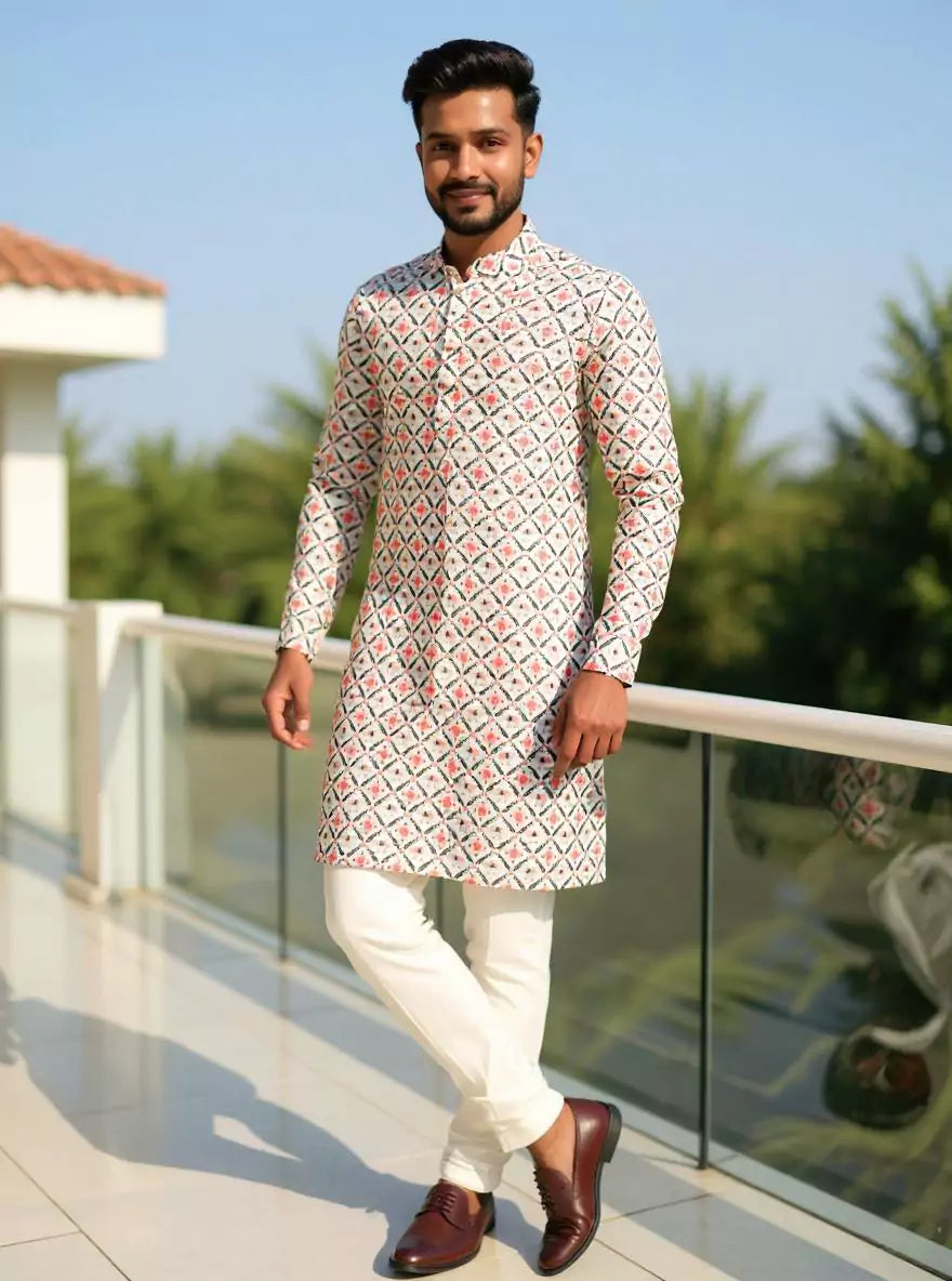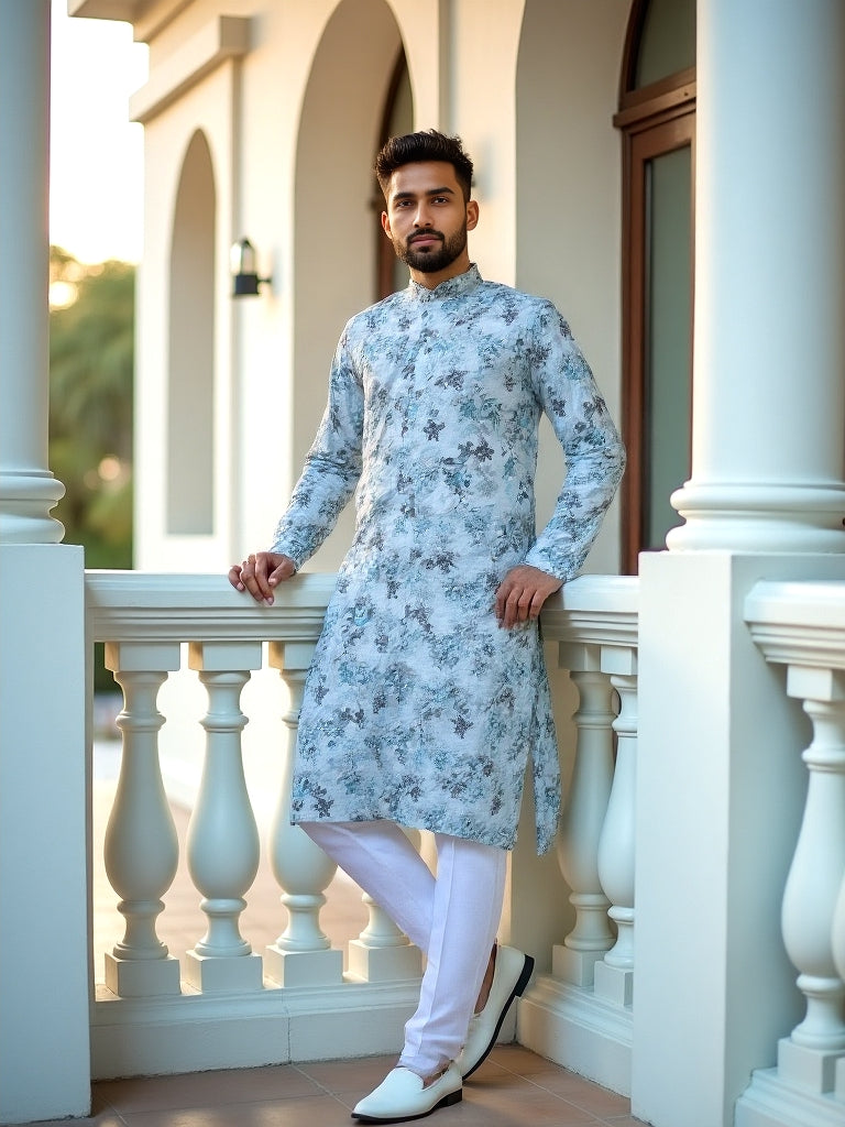 Light Sky Geometric Print Cotton Silk Kurta for Men