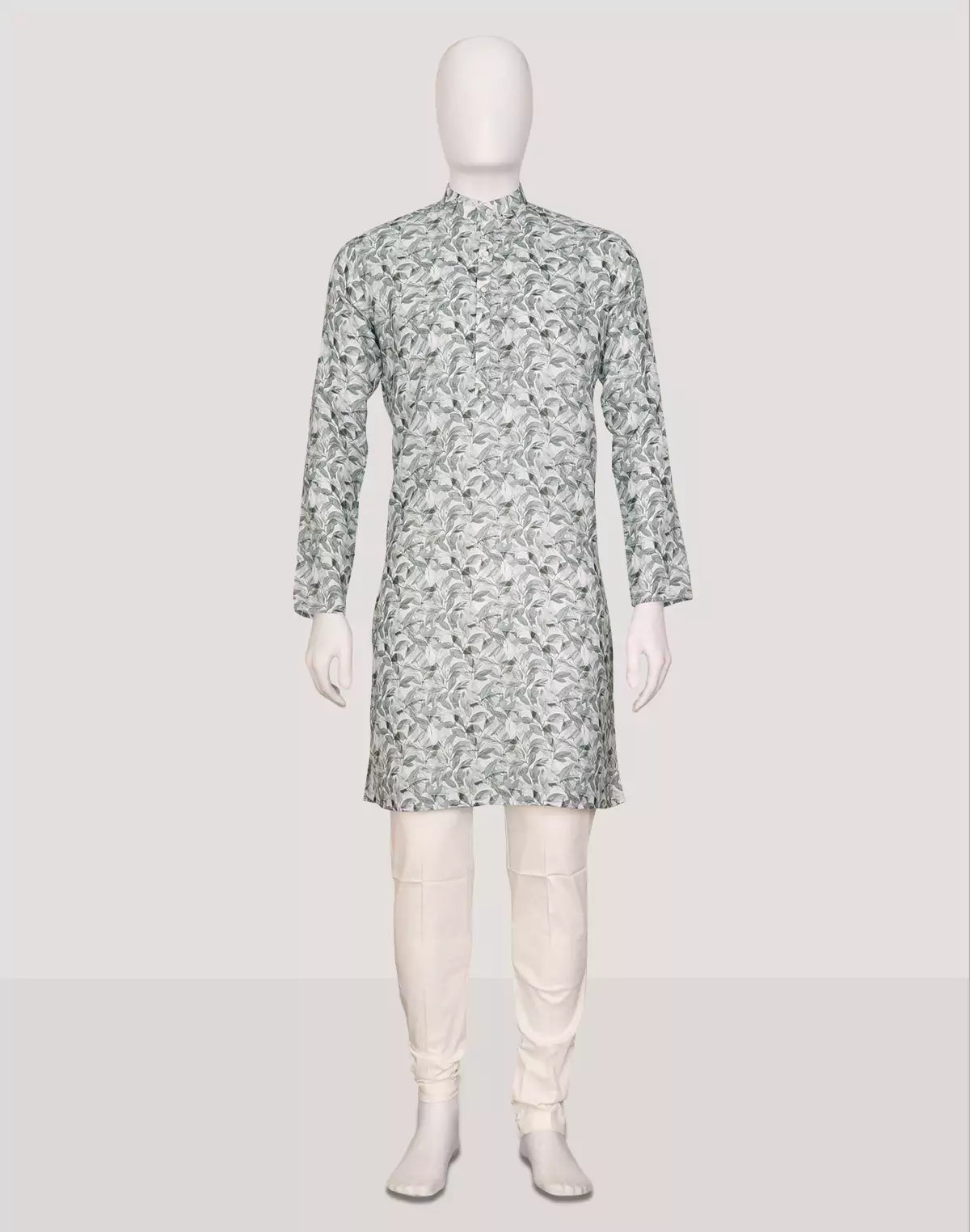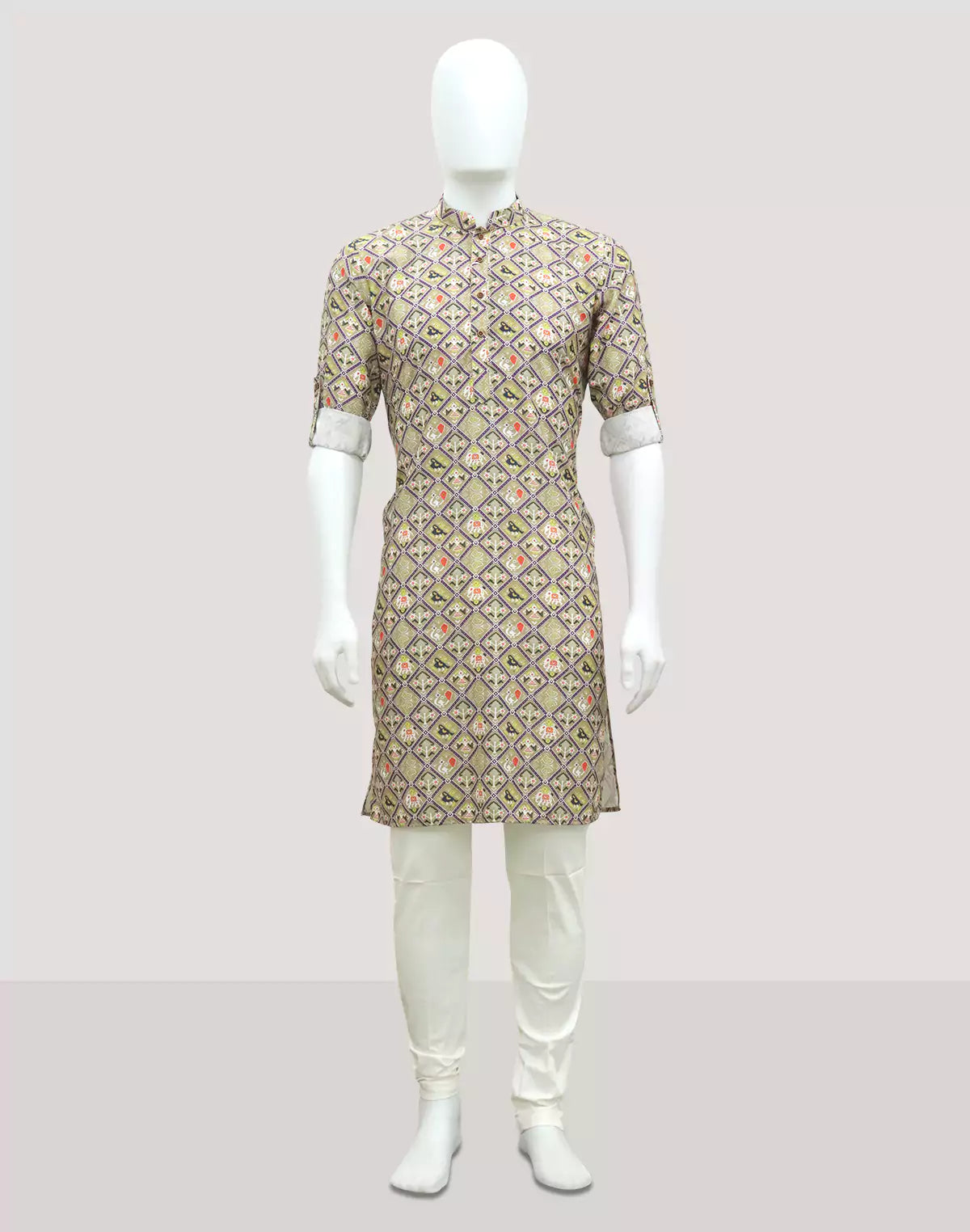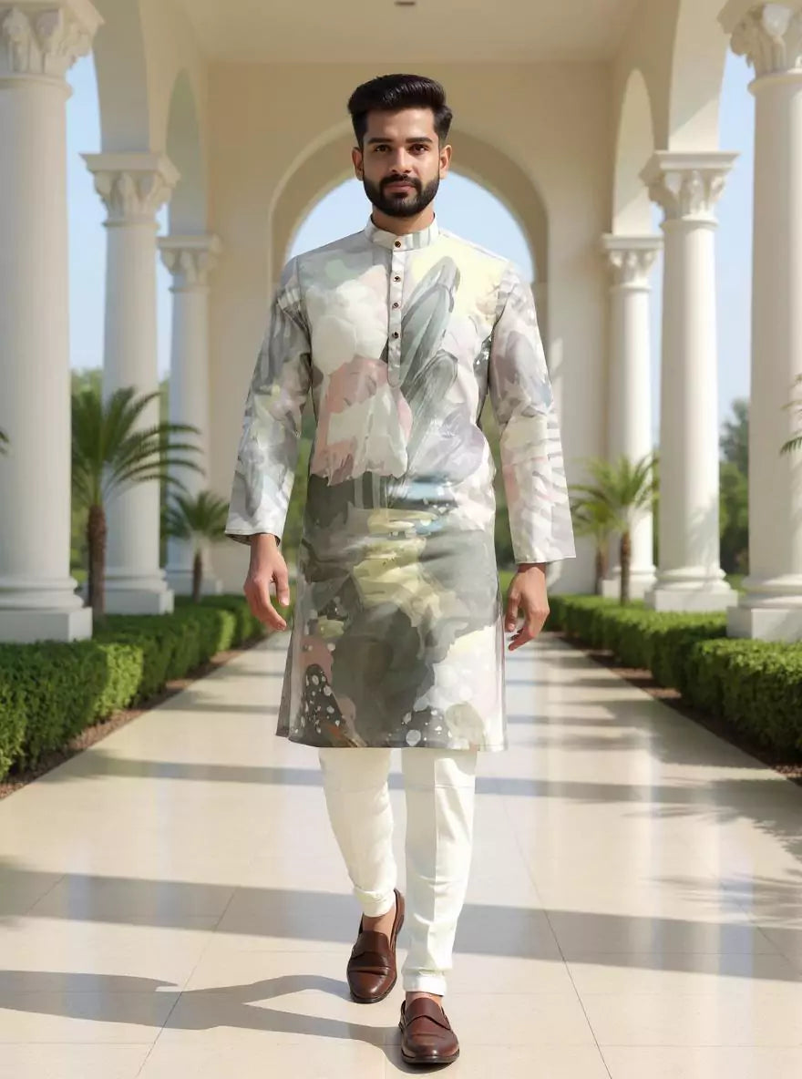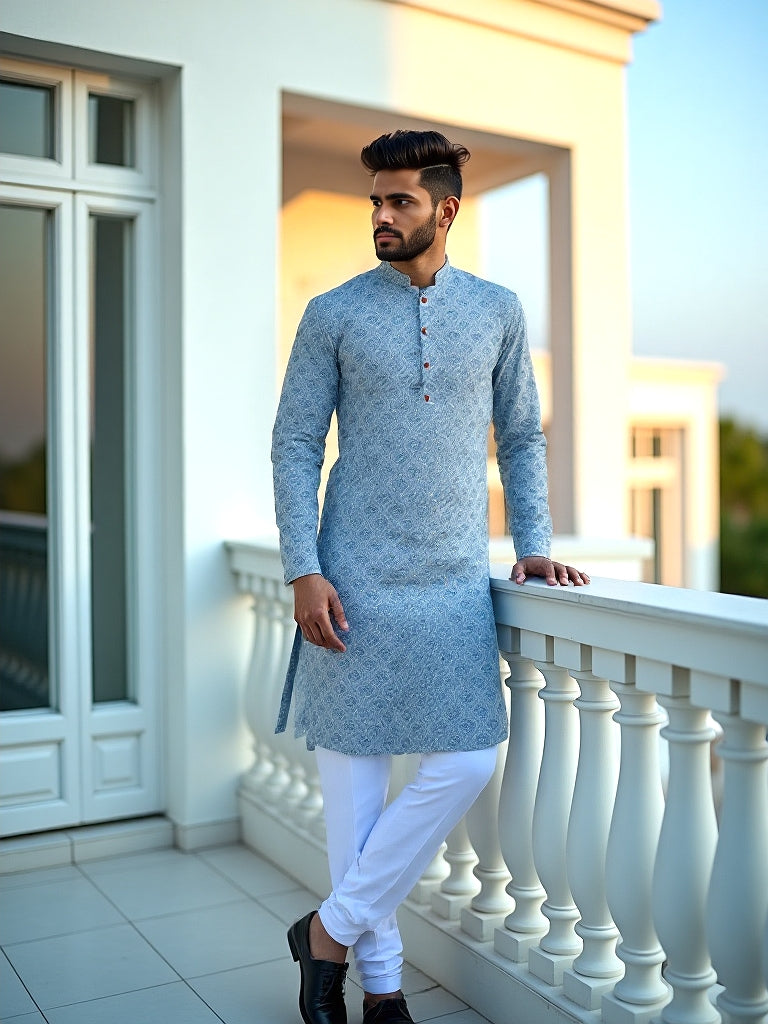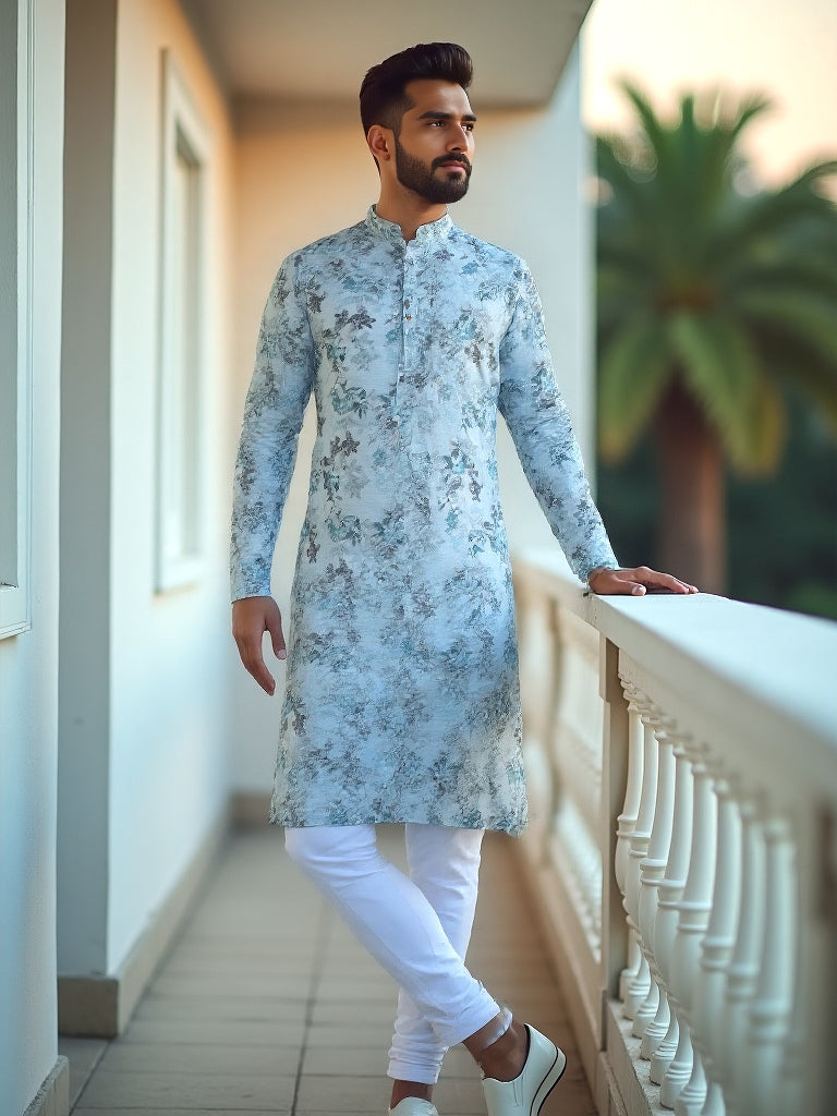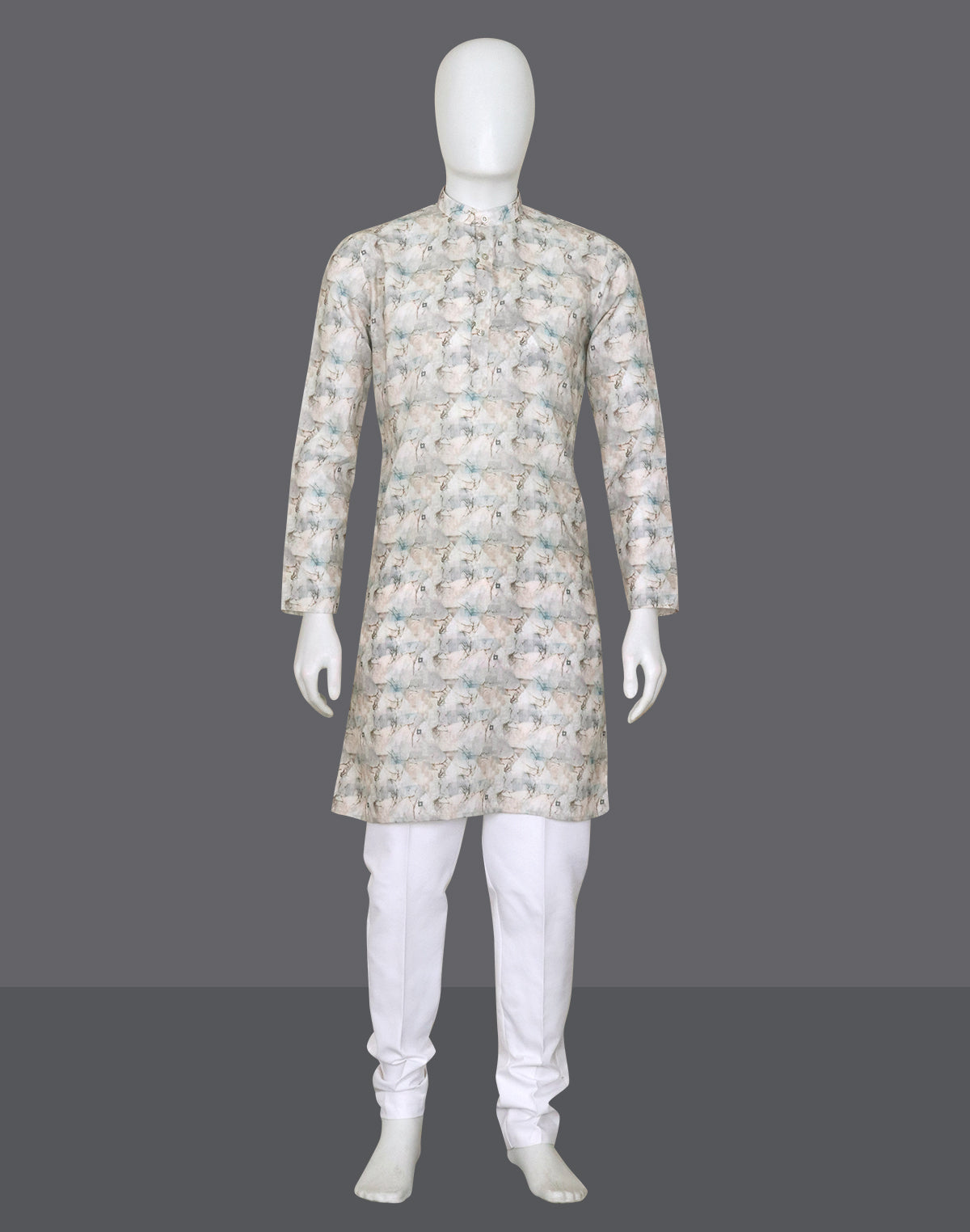 Light Sky Geometric Print Cotton Silk Kurta for Men