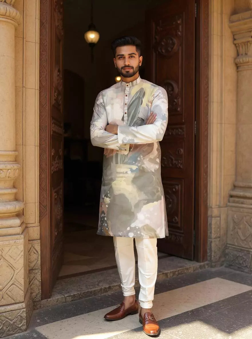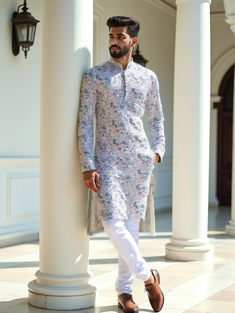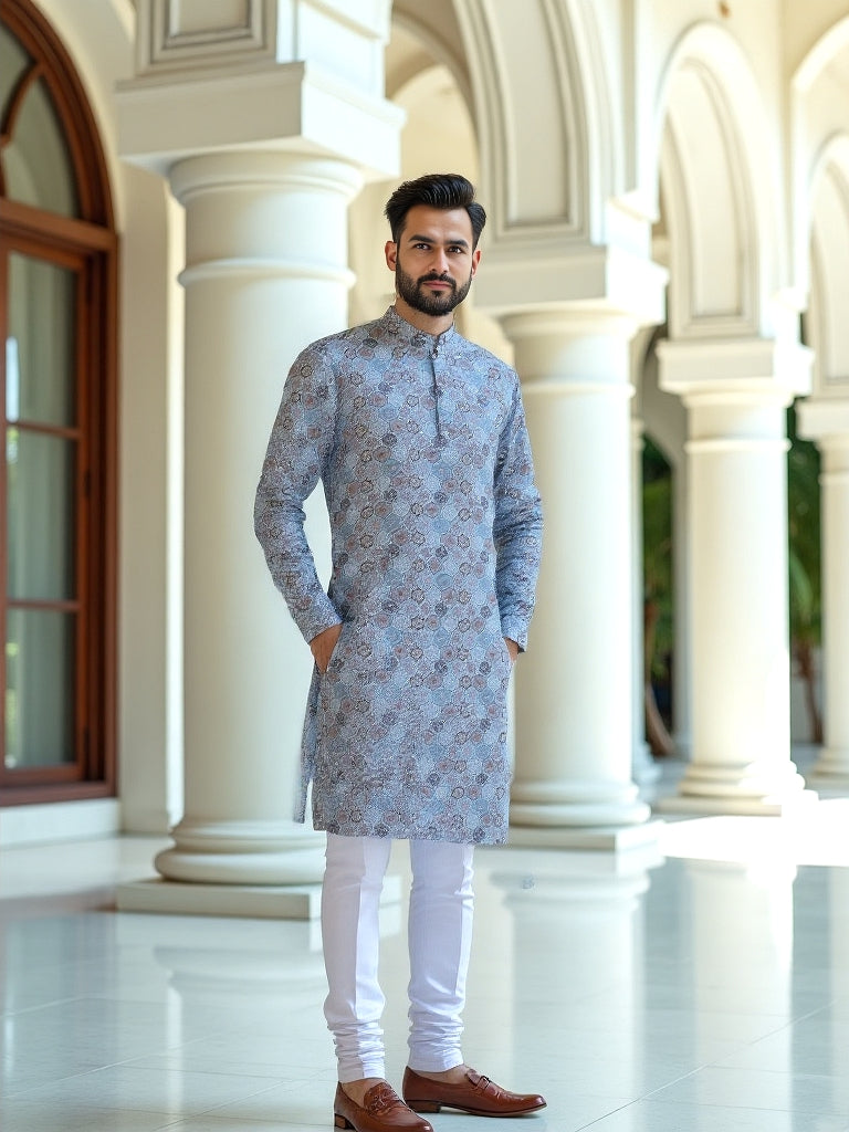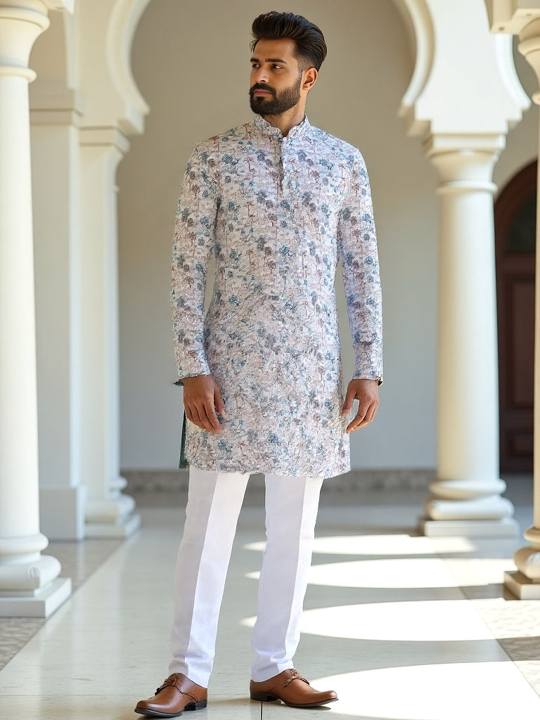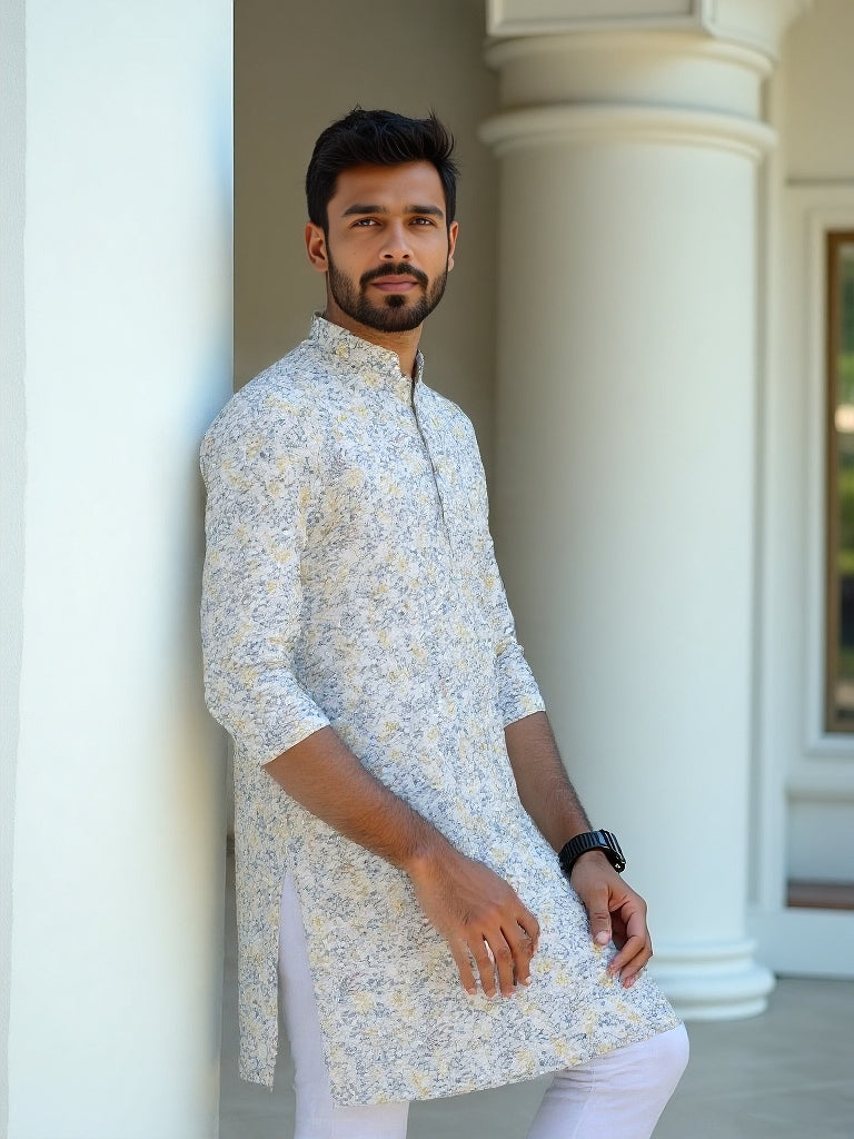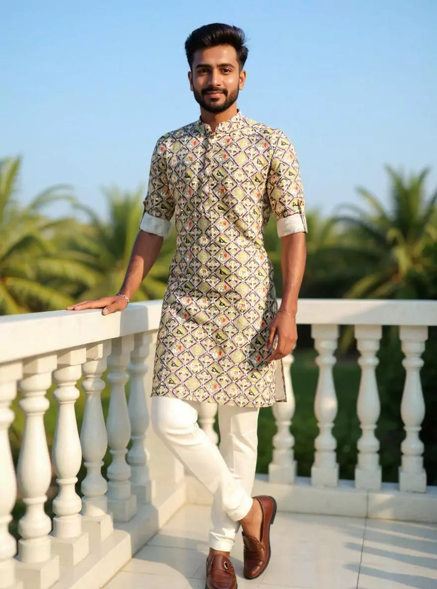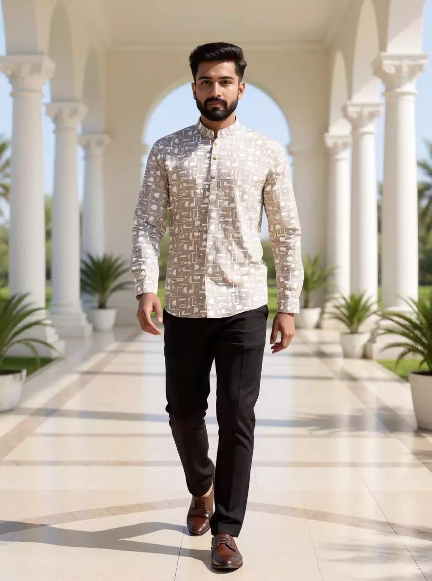 Light Sky Geometric Print Cotton Silk Kurta for Men
