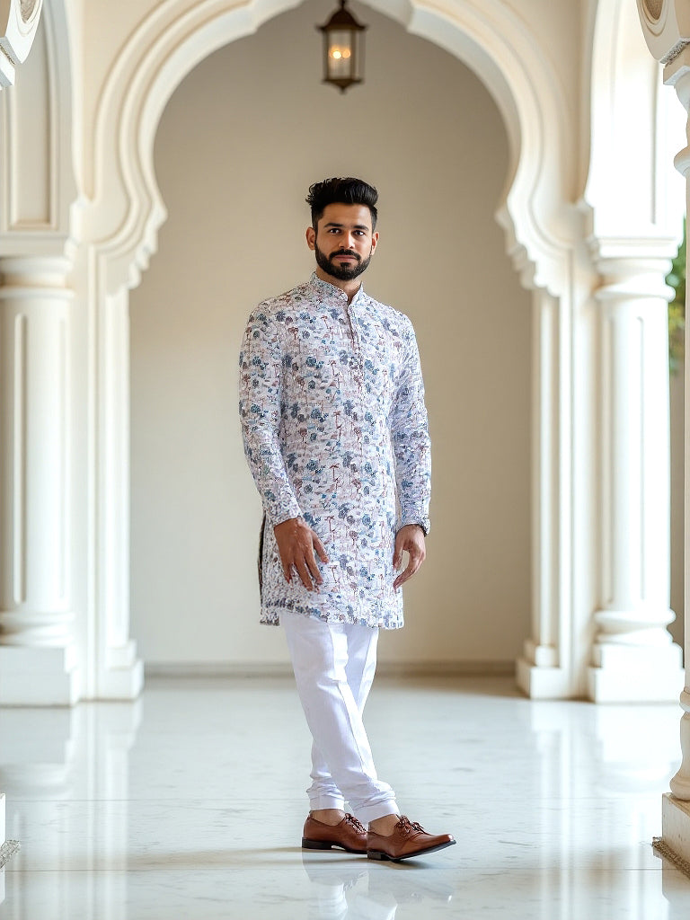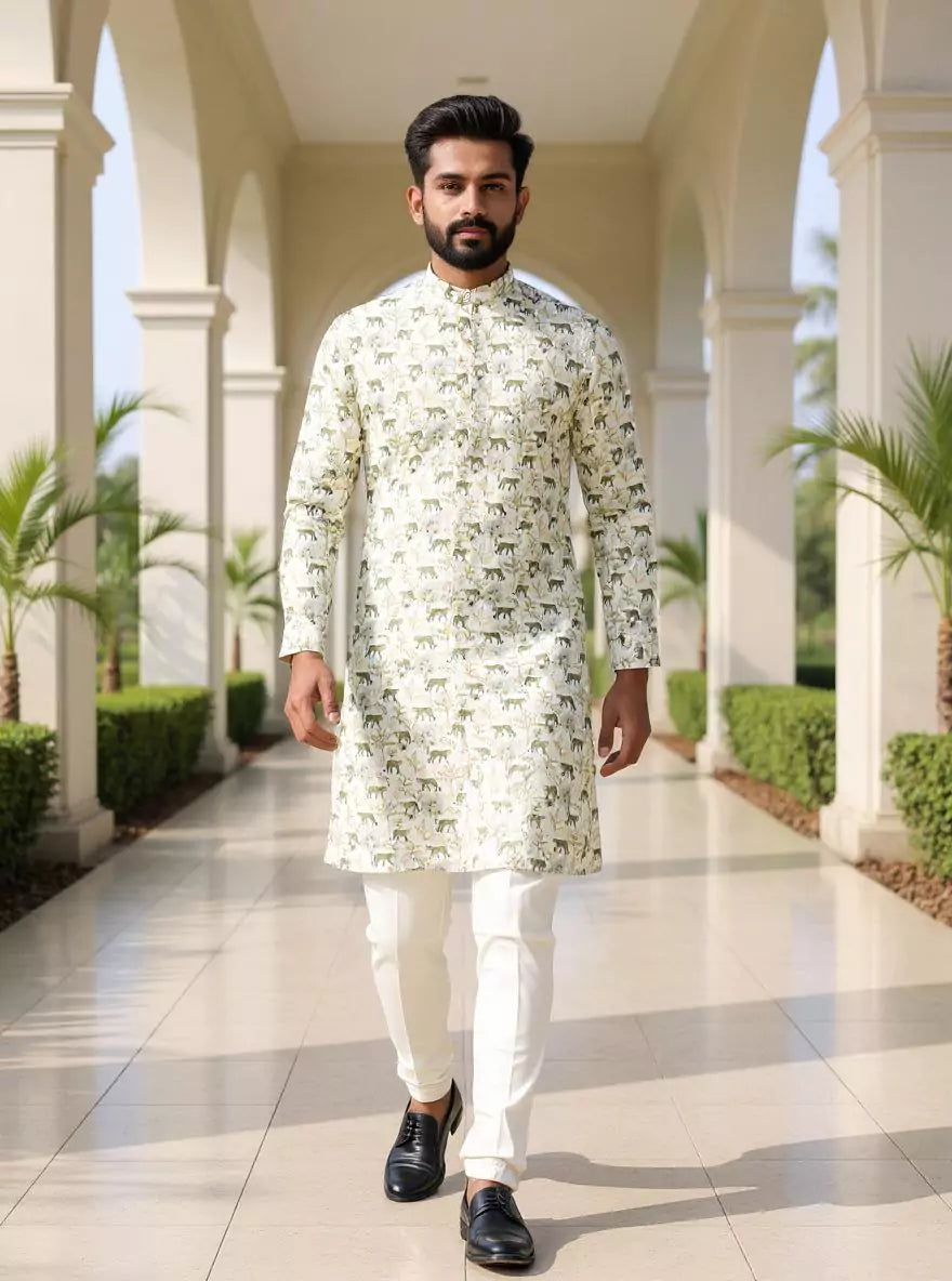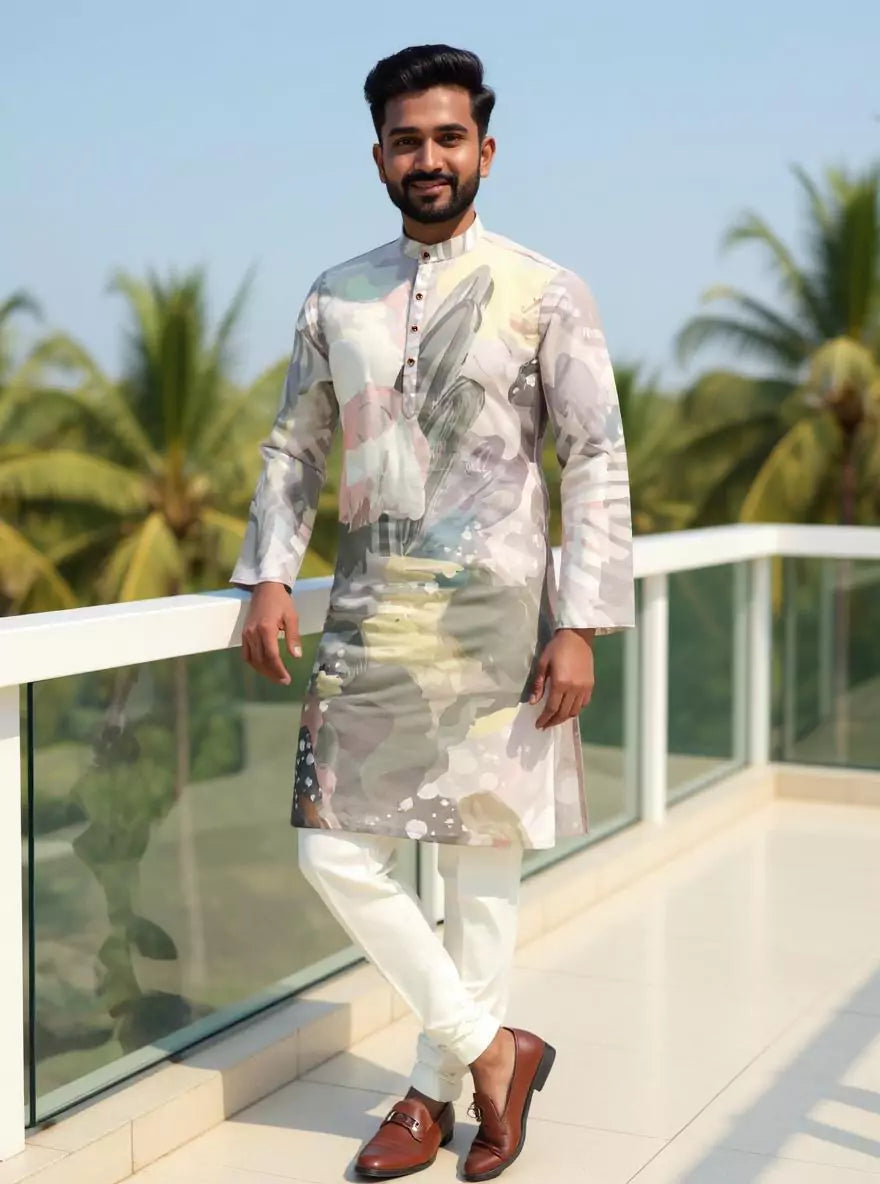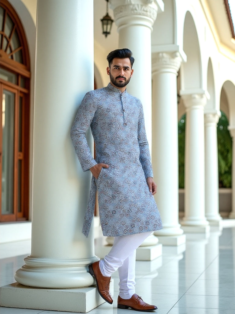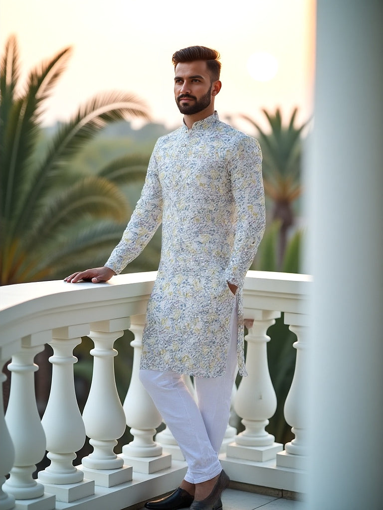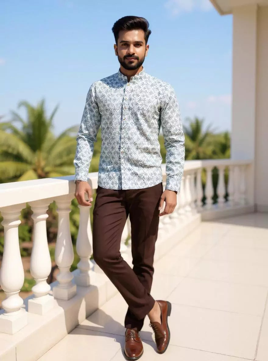 Light Sky Geometric Print Cotton Silk Kurta for Men