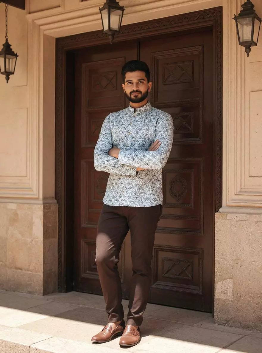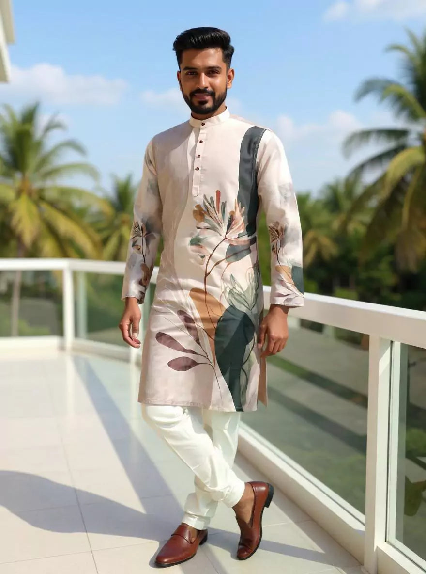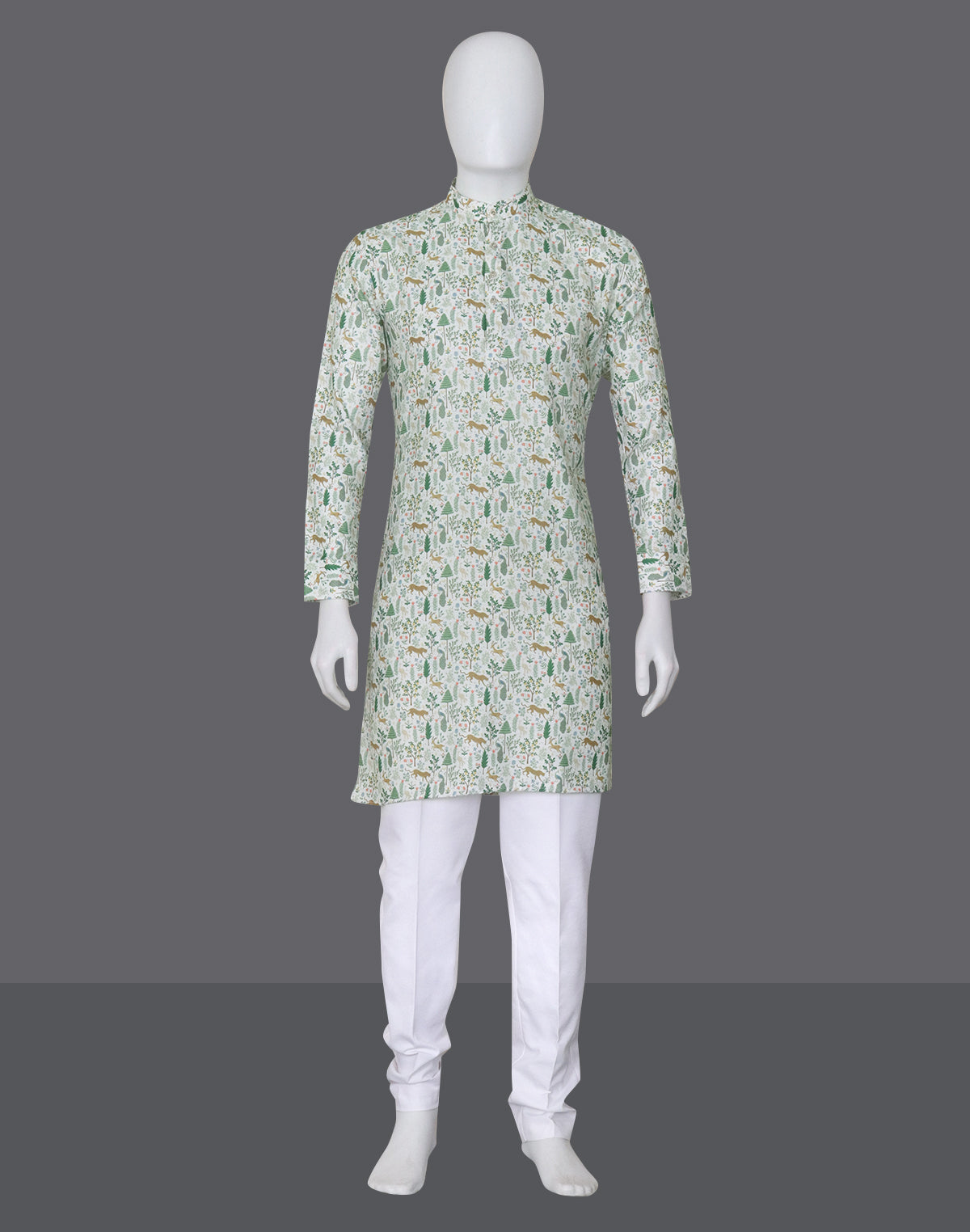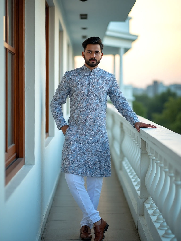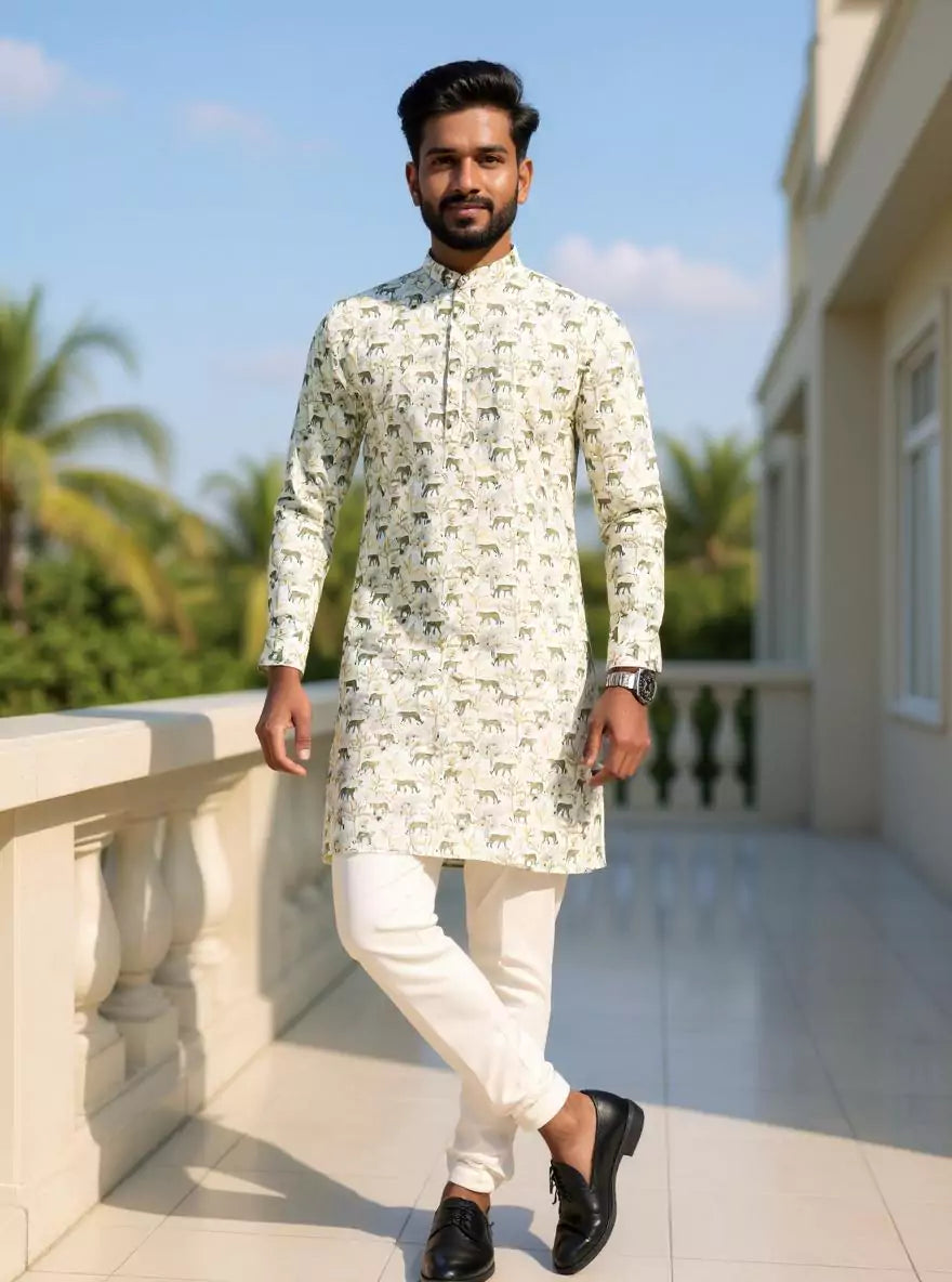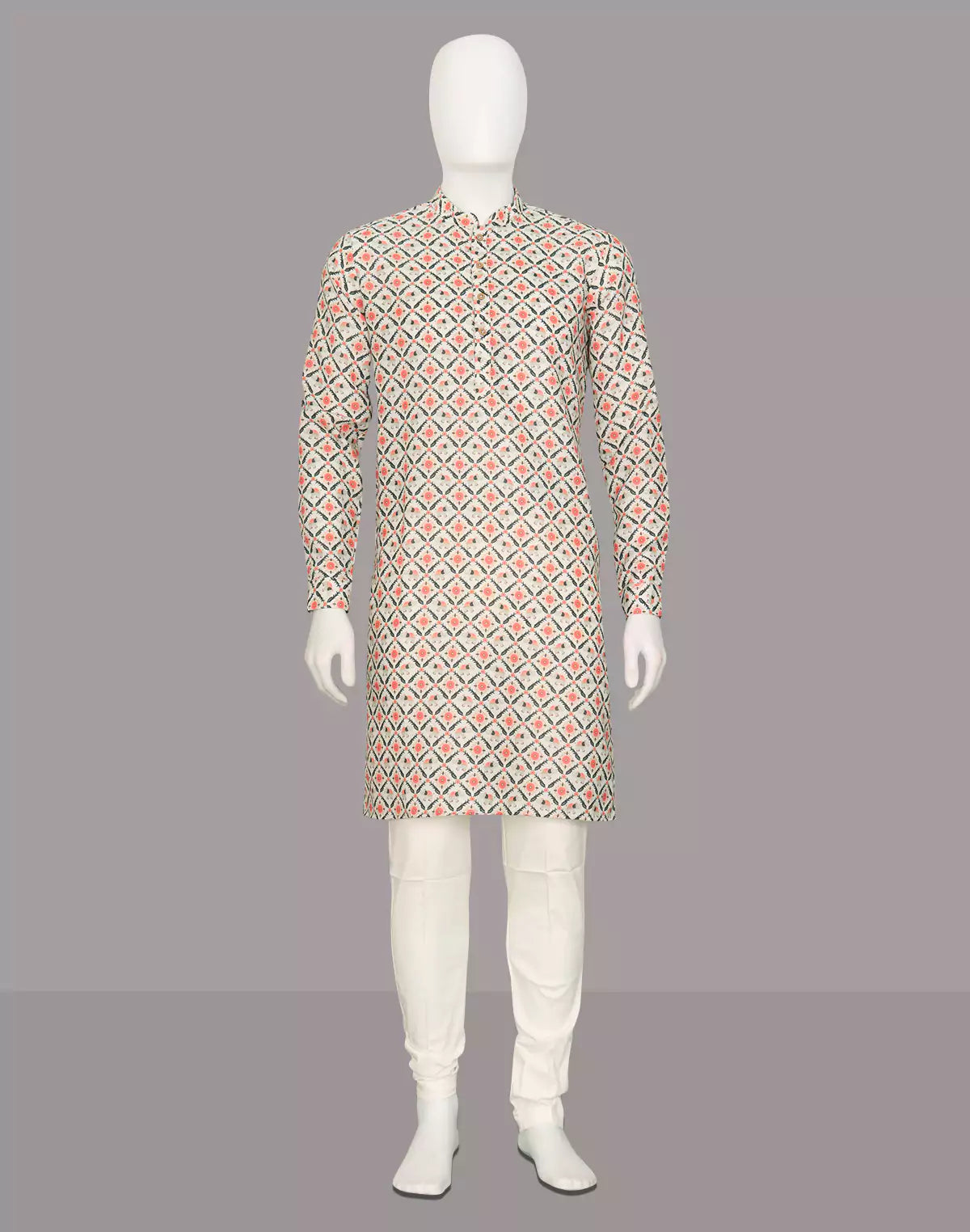 Light Sky Geometric Print Cotton Silk Kurta for Men