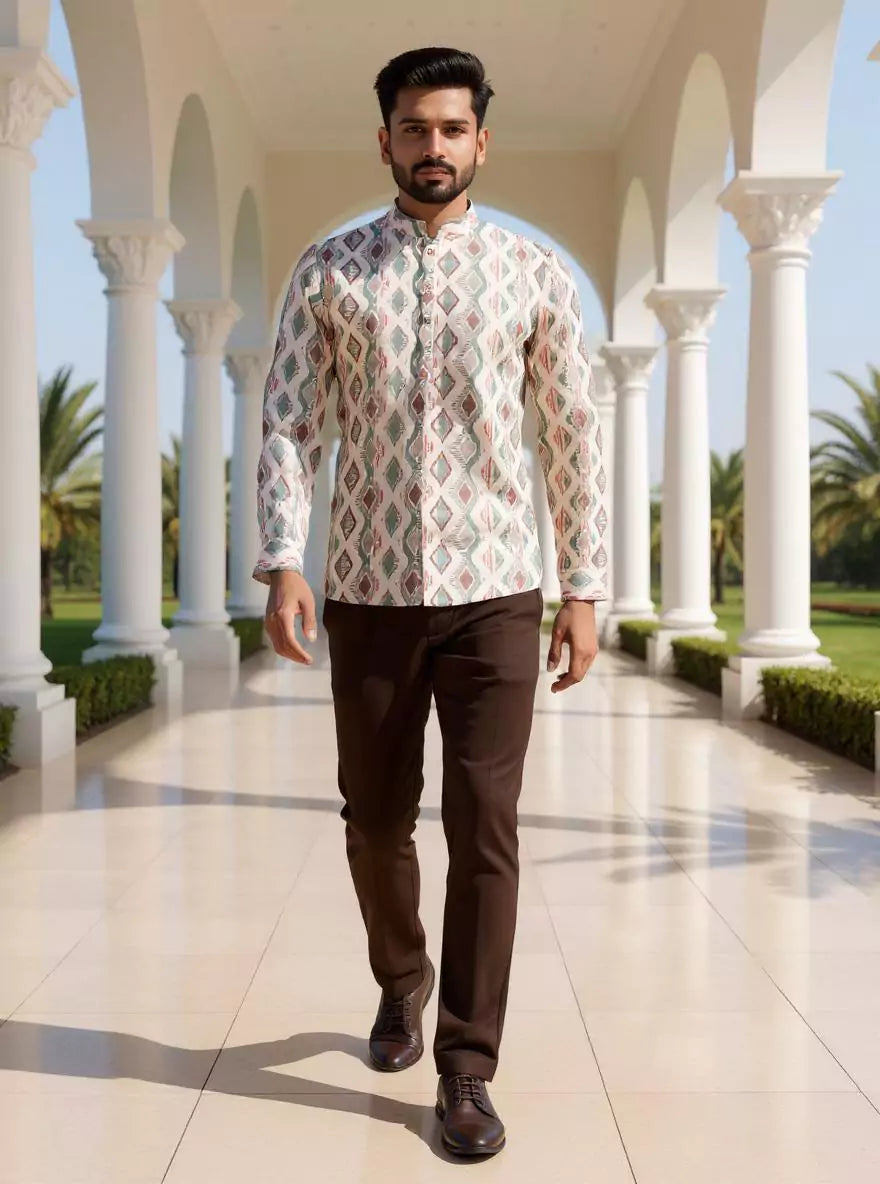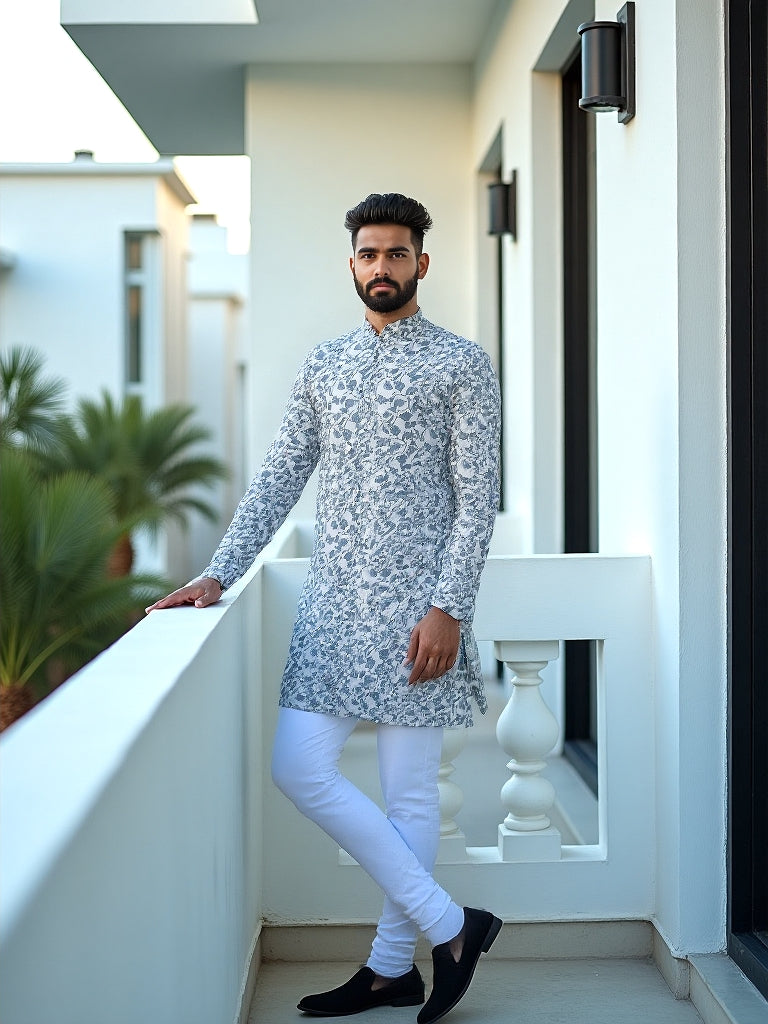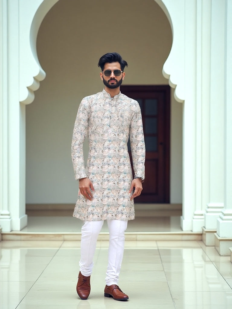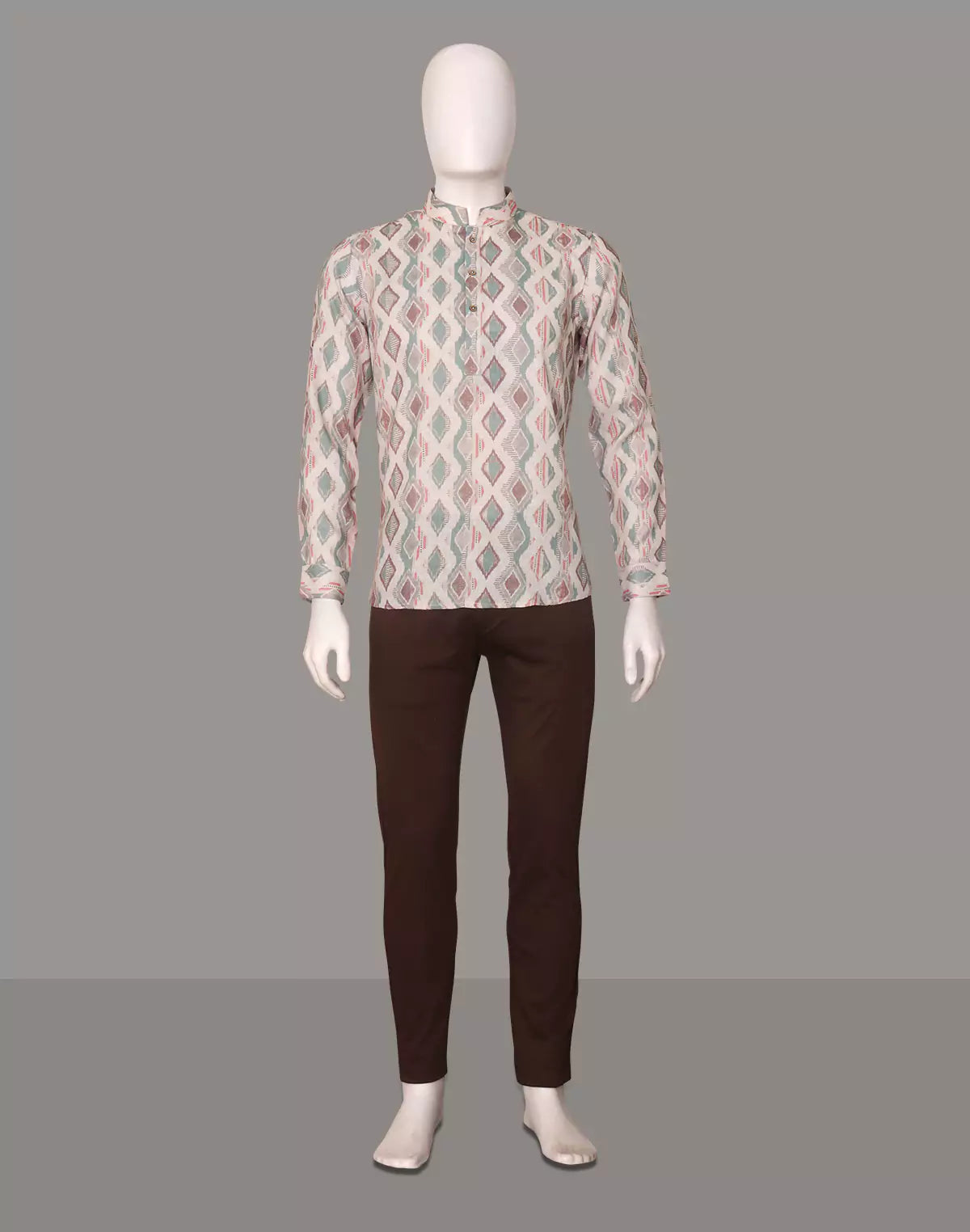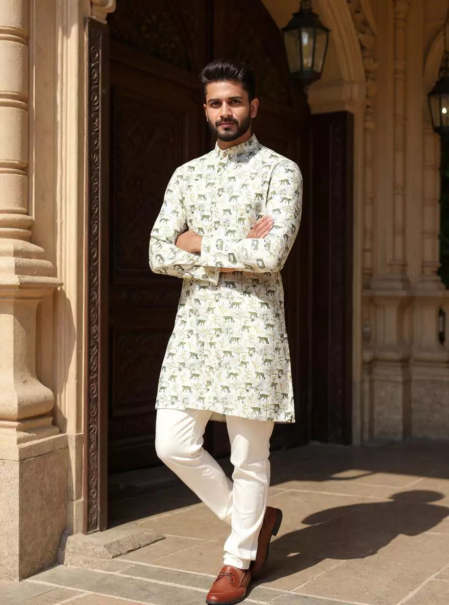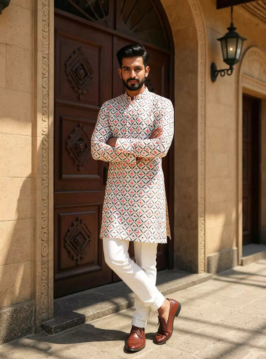 Light Sky Geometric Print Cotton Silk Kurta for Men