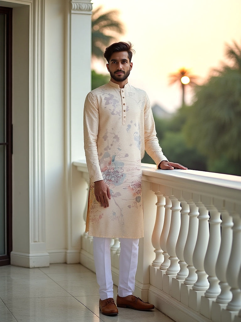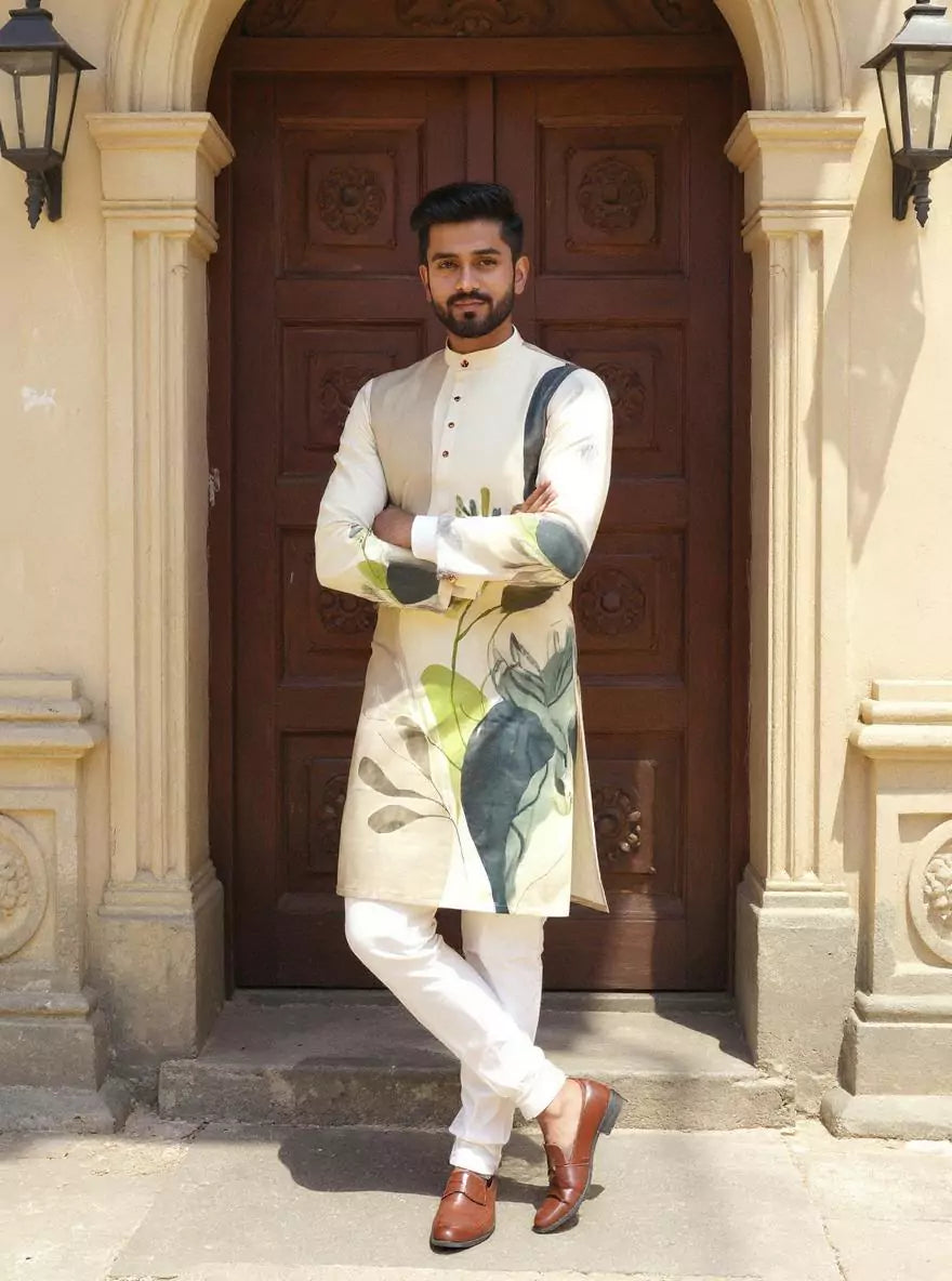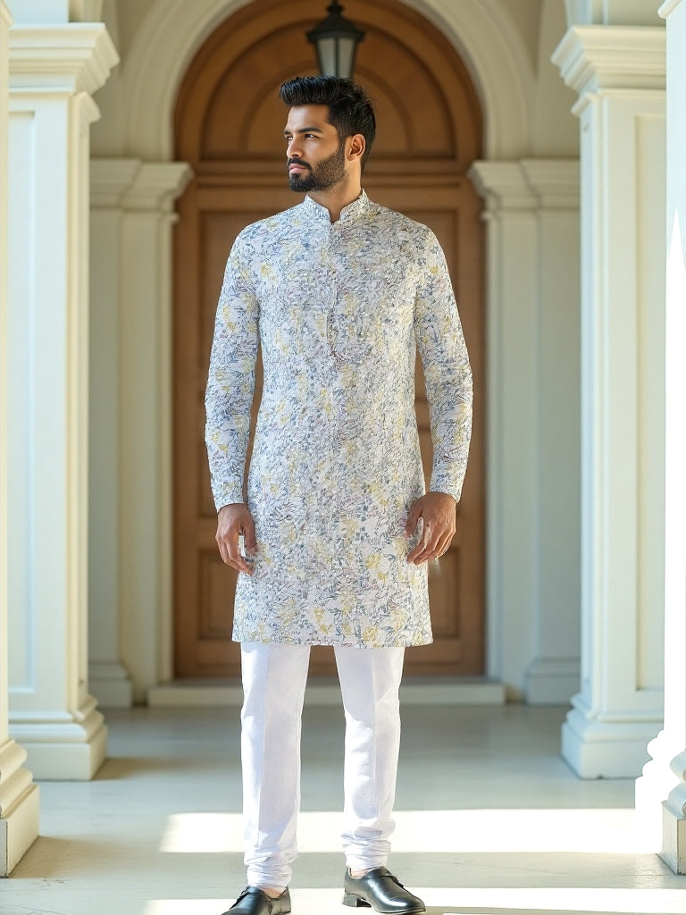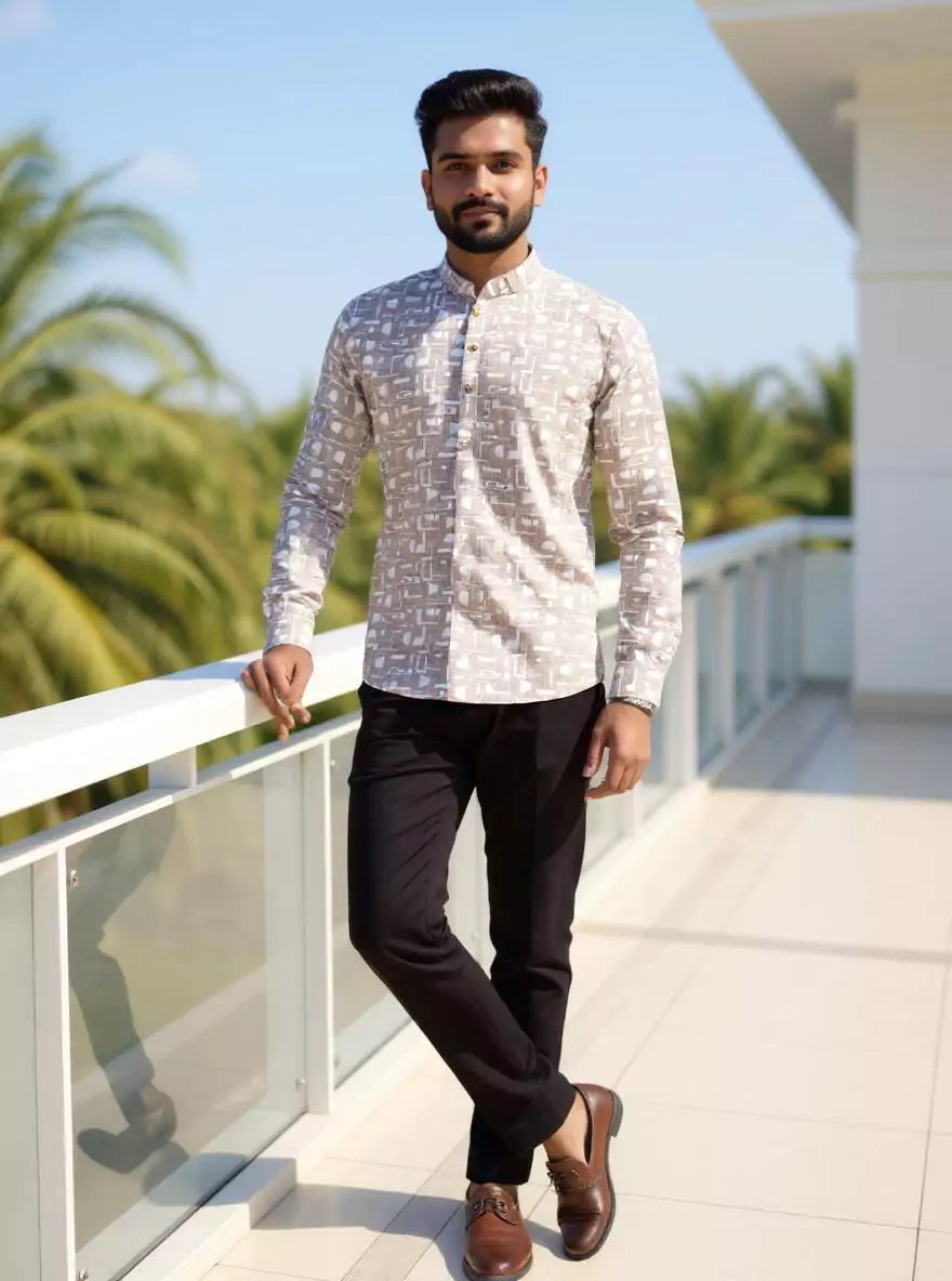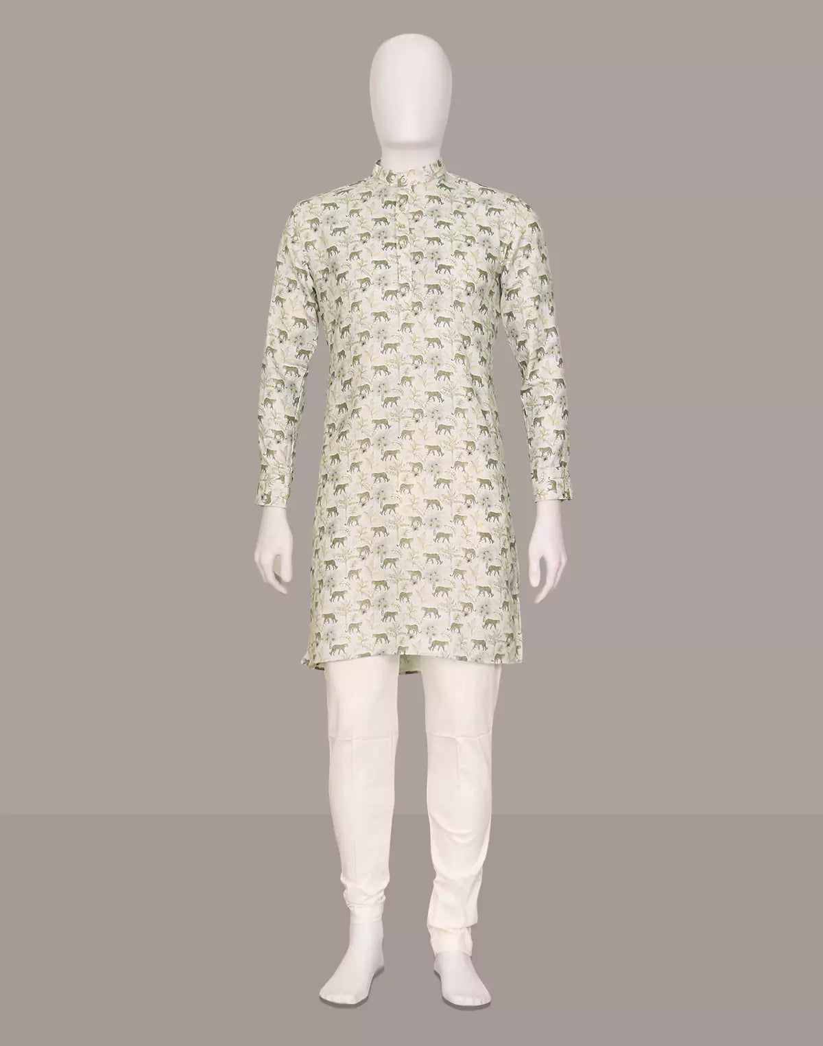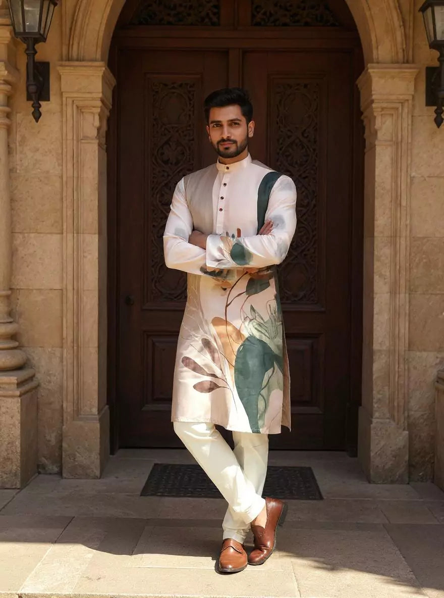 Light Sky Geometric Print Cotton Silk Kurta for Men