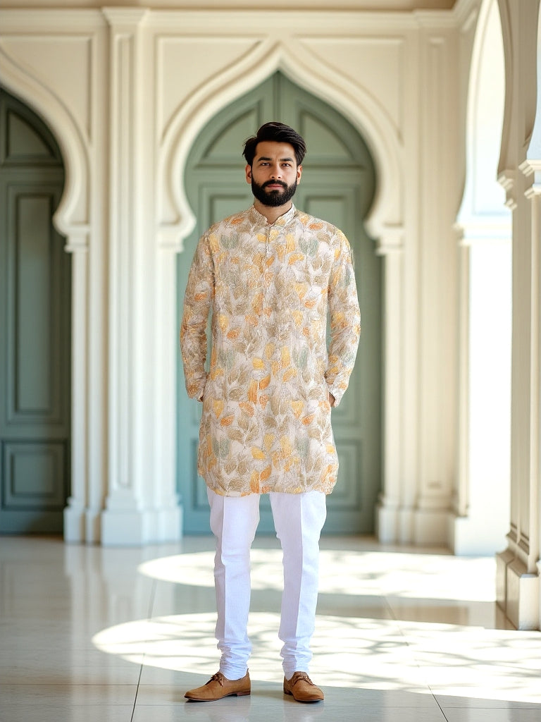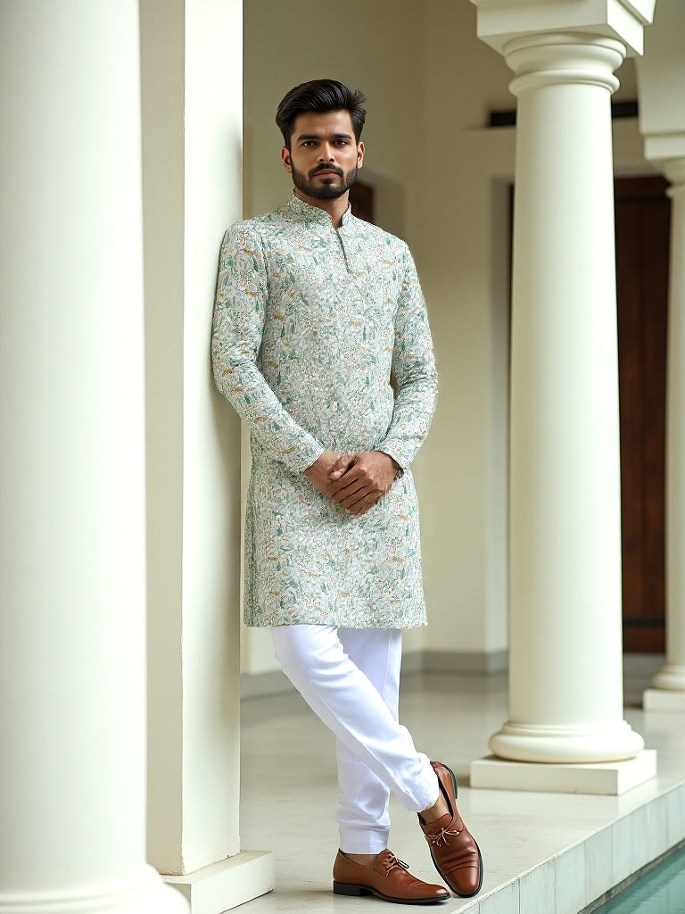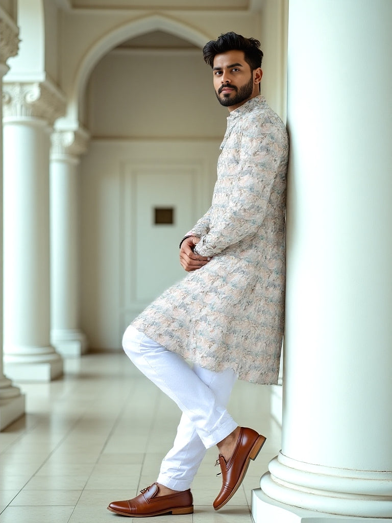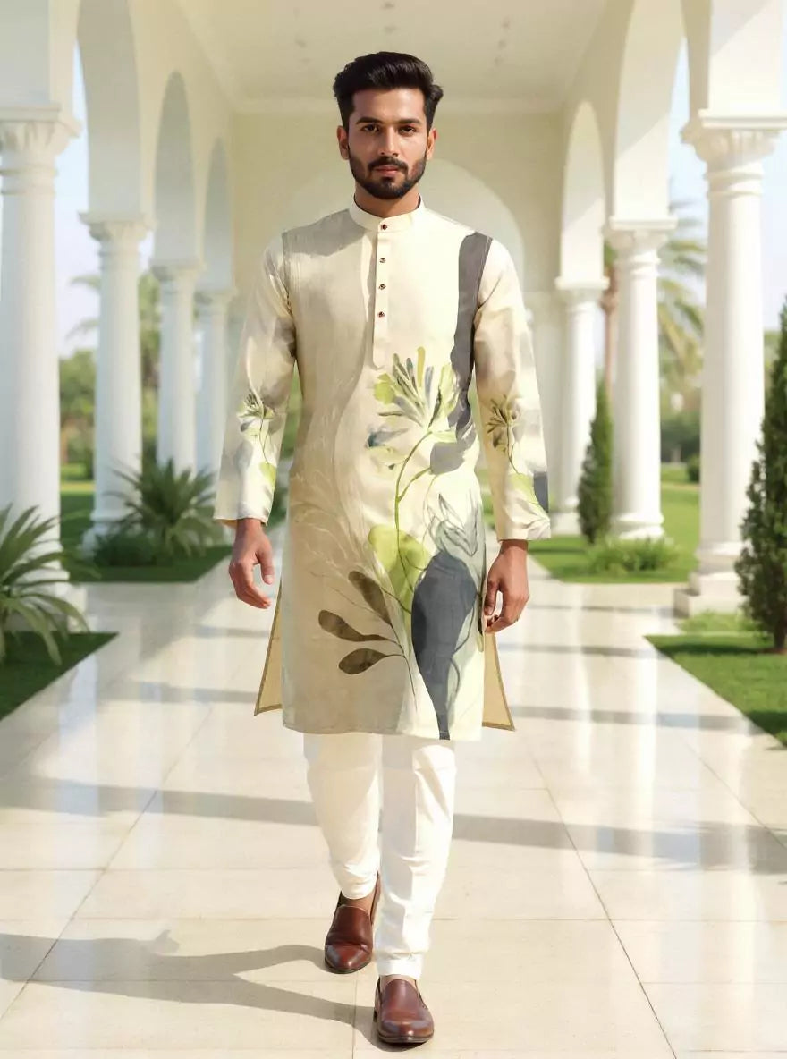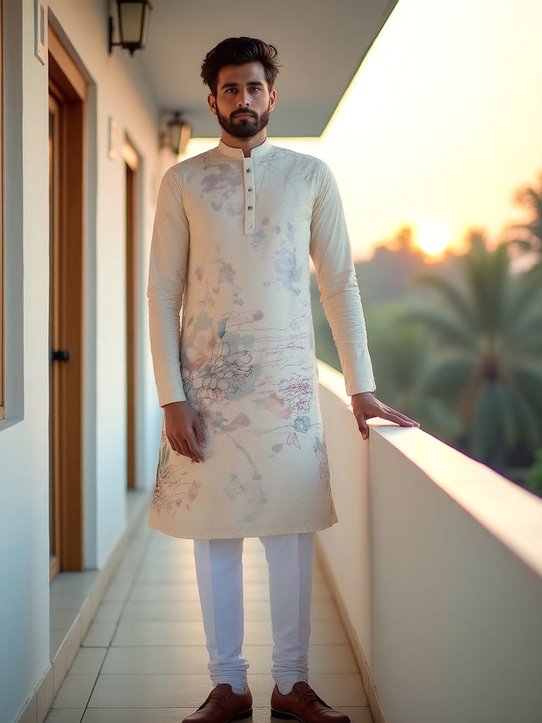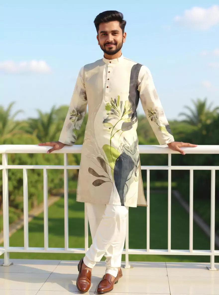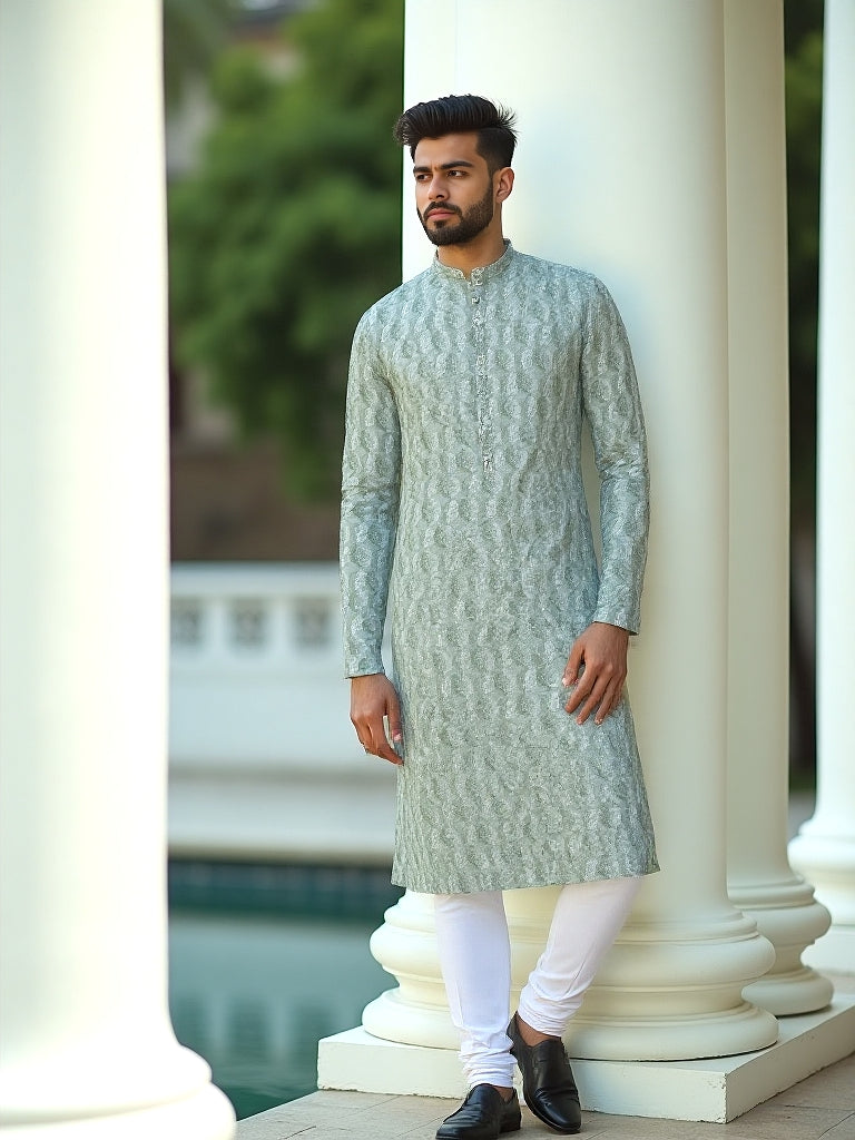 Light Sky Geometric Print Cotton Silk Kurta for Men