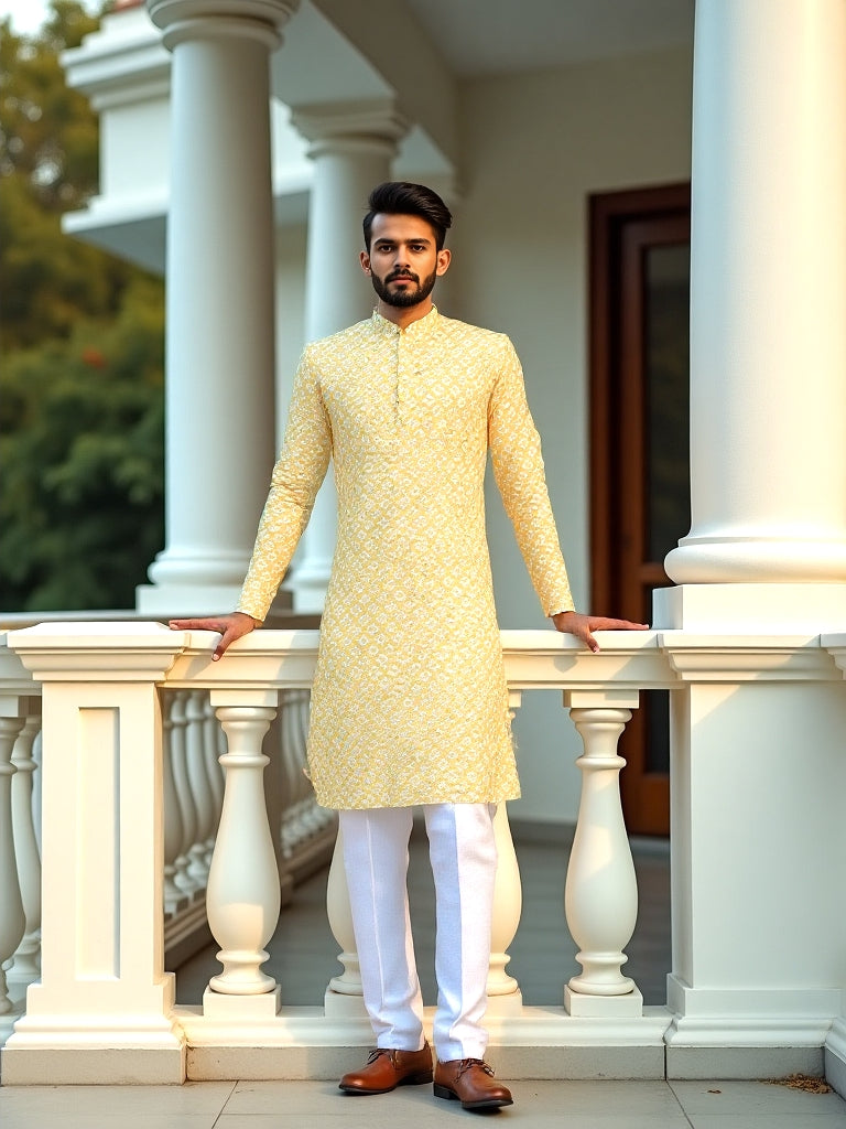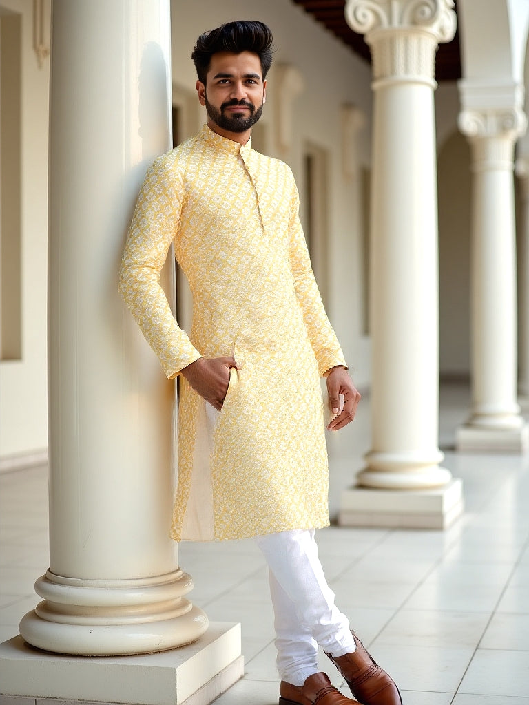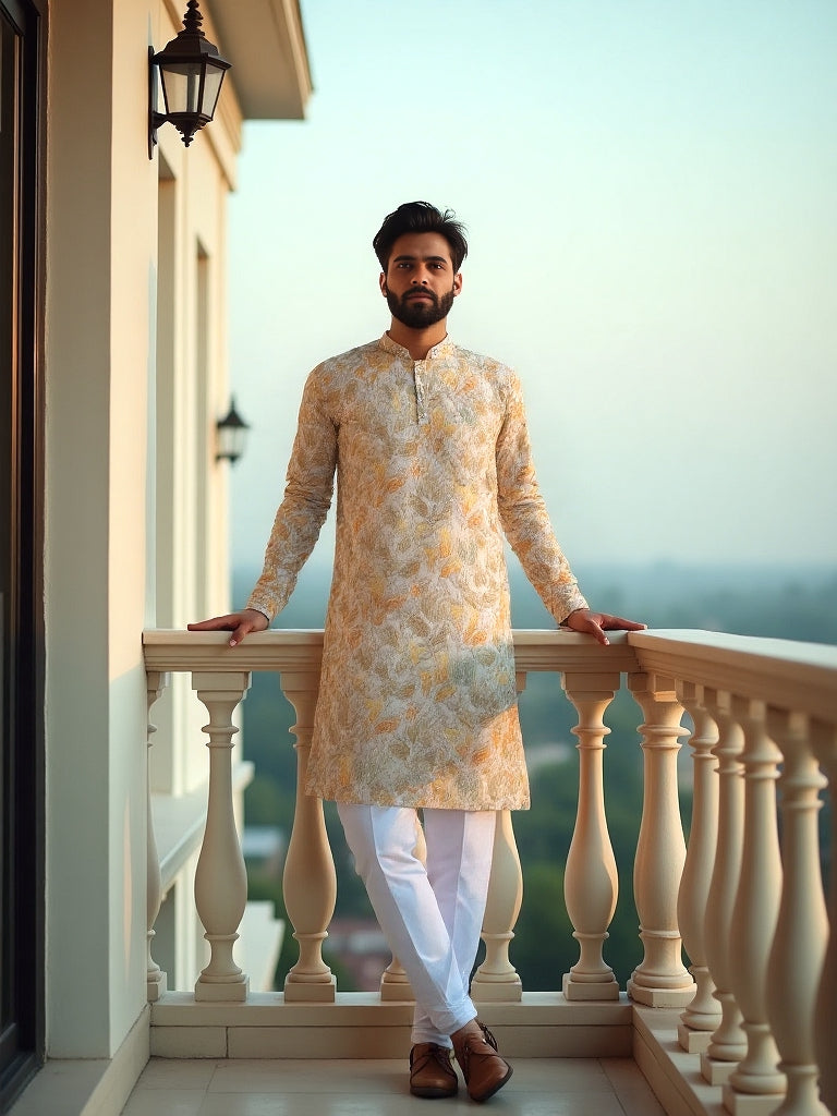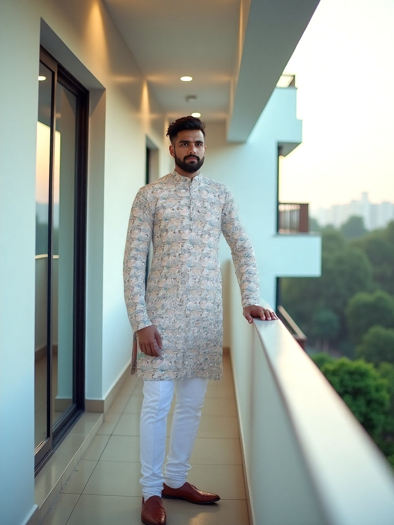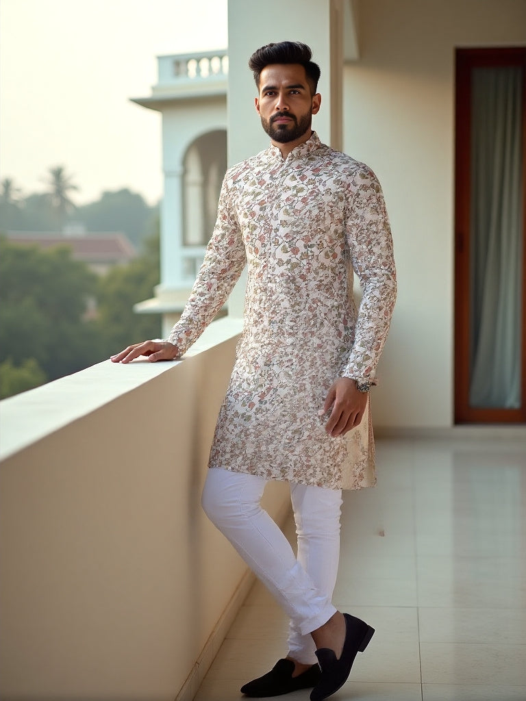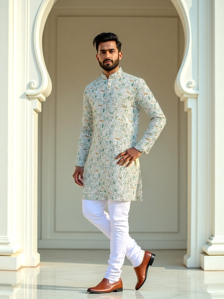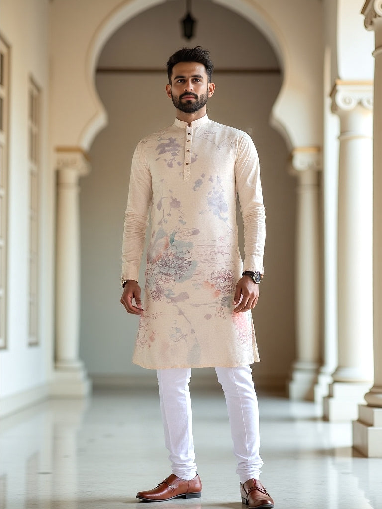 Light Sky Geometric Print Cotton Silk Kurta for Men
