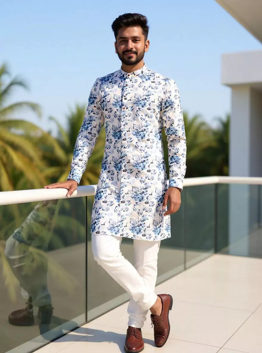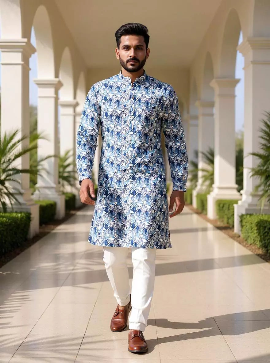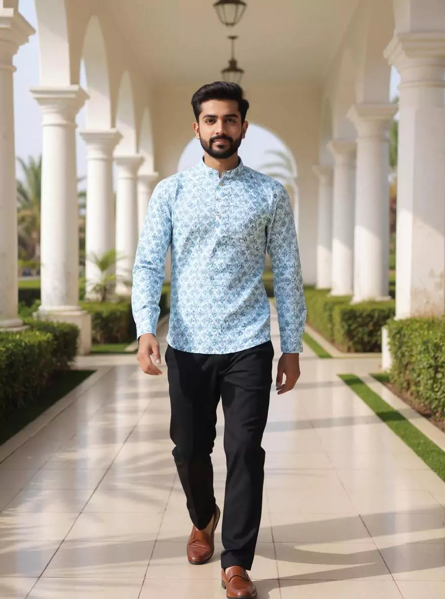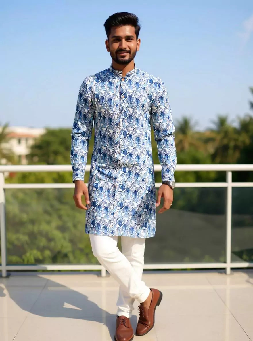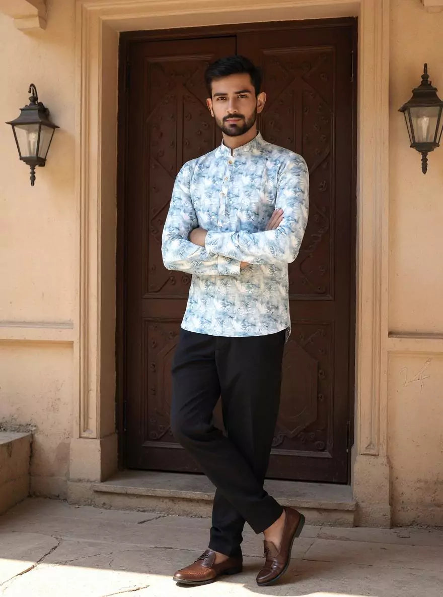 Stylish Blue Coloured Floral Print Giza Cotton Men Short Kurta