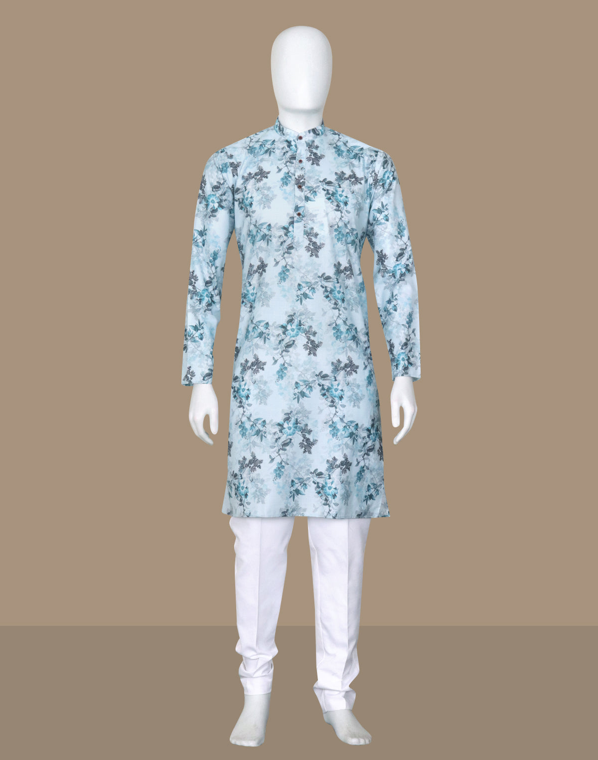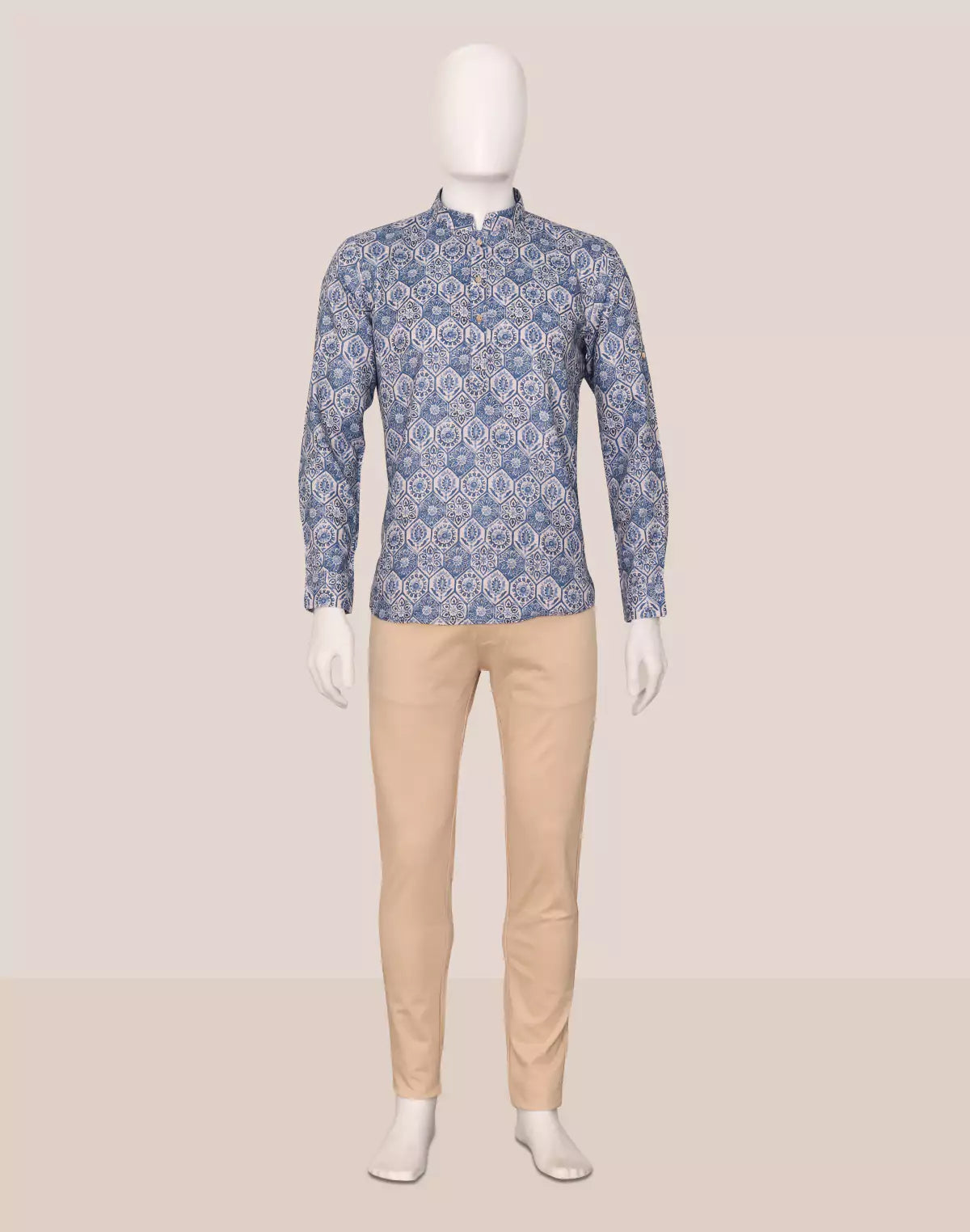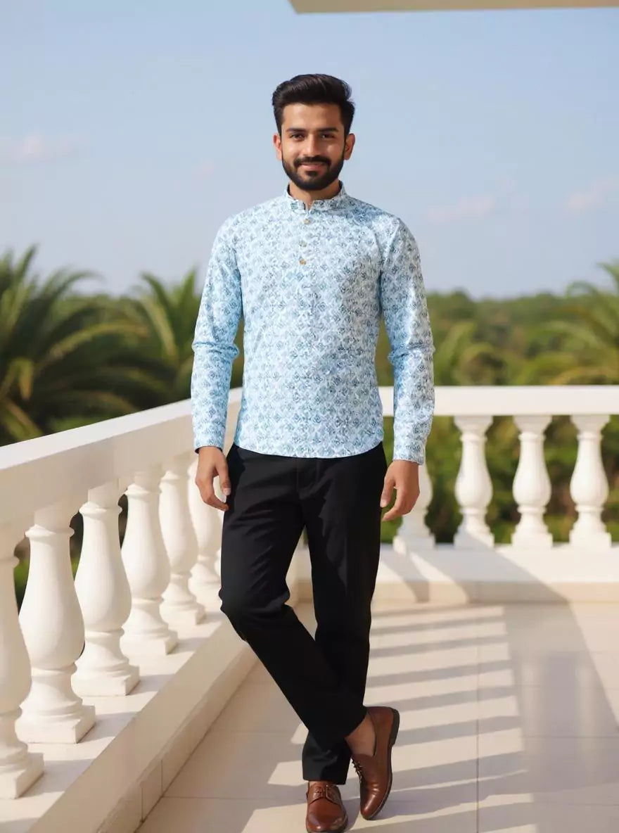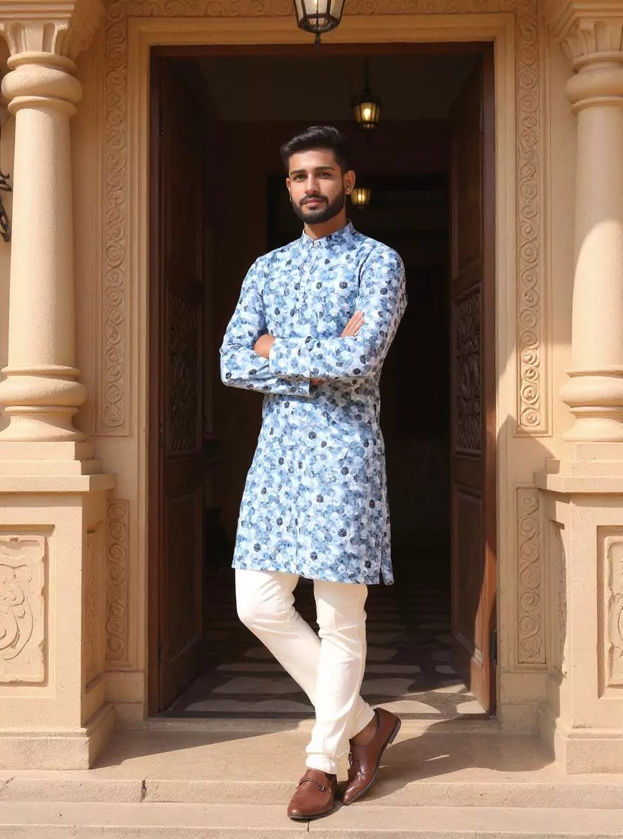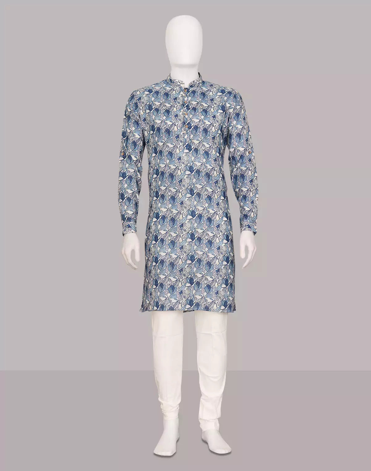 Stylish Blue Coloured Floral Print Giza Cotton Men Short Kurta