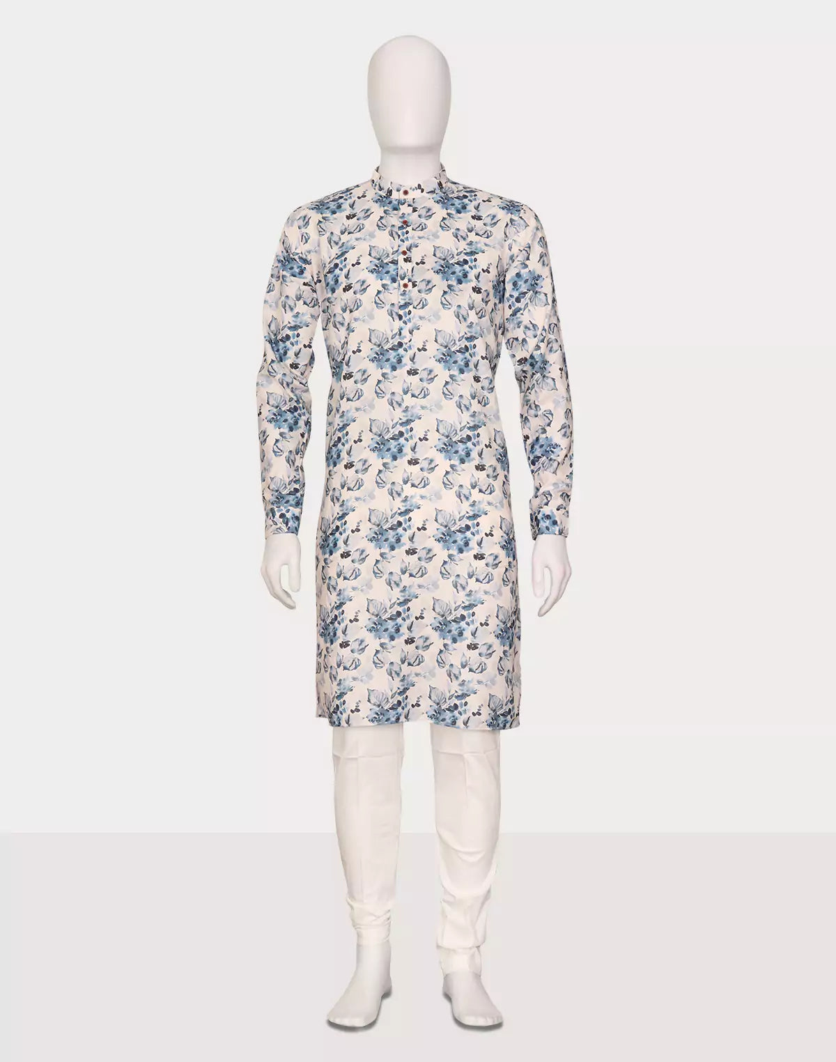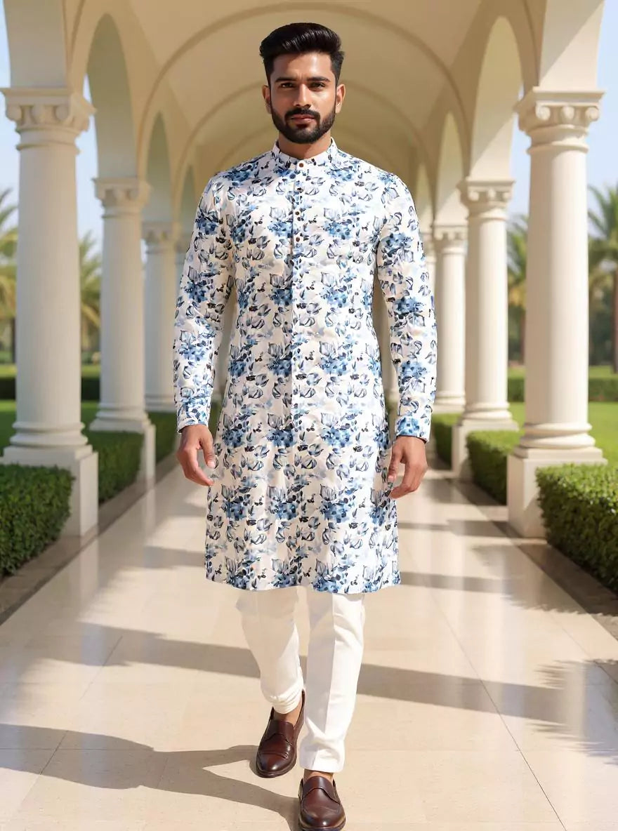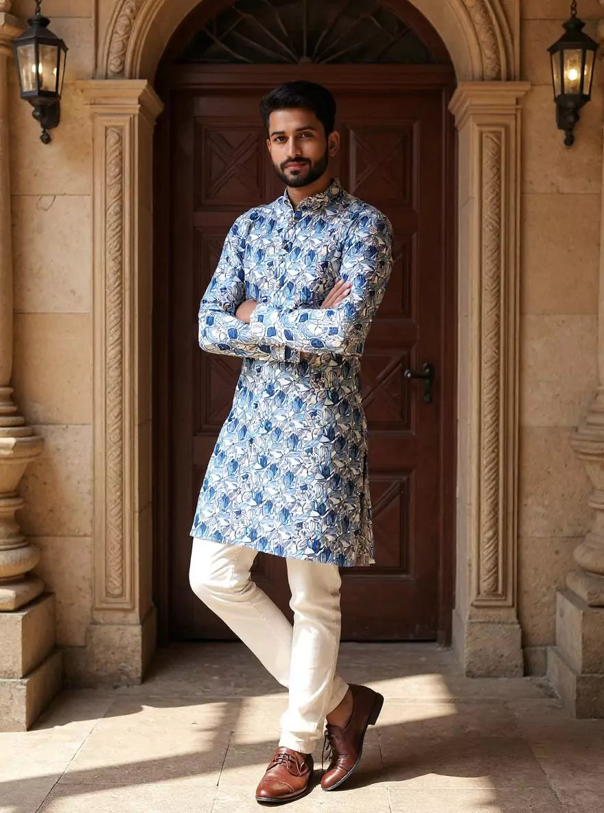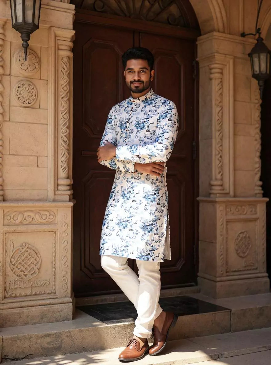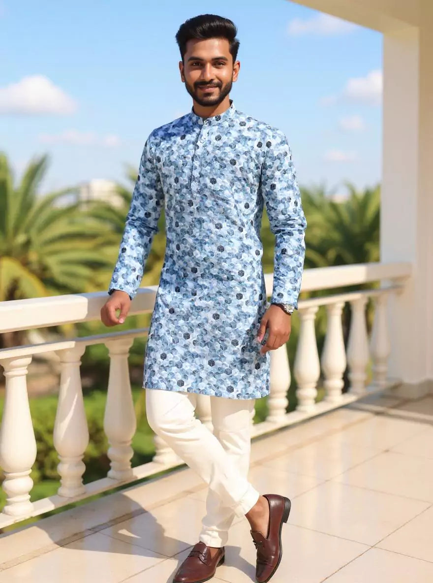 Stylish Blue Coloured Floral Print Giza Cotton Men Short Kurta