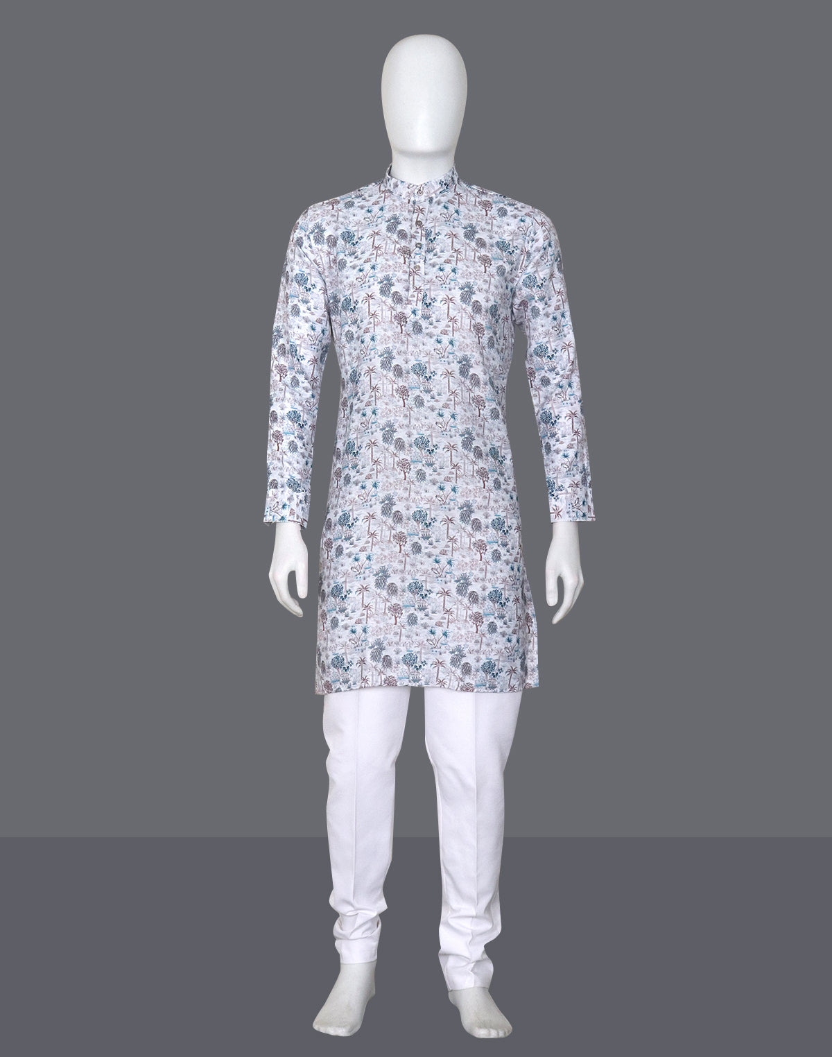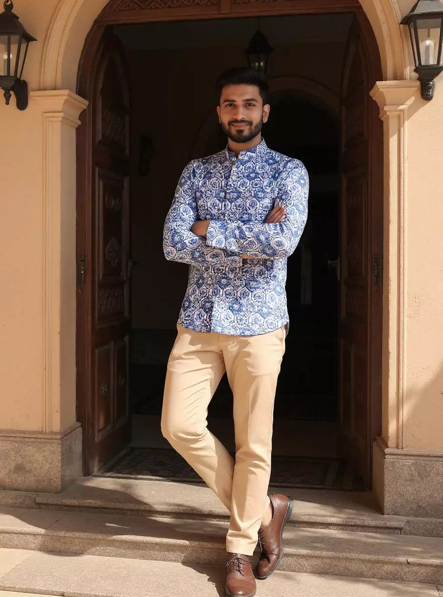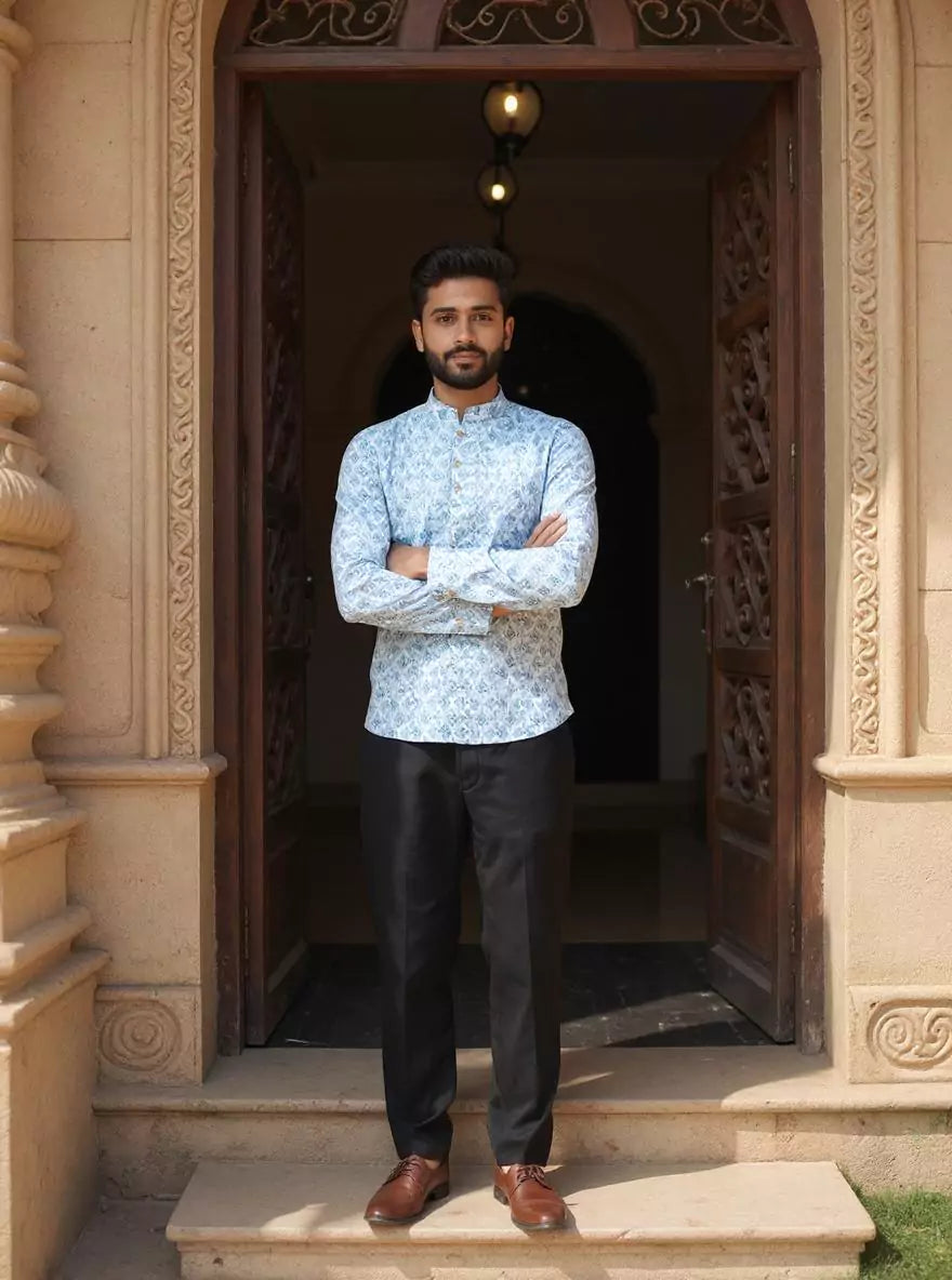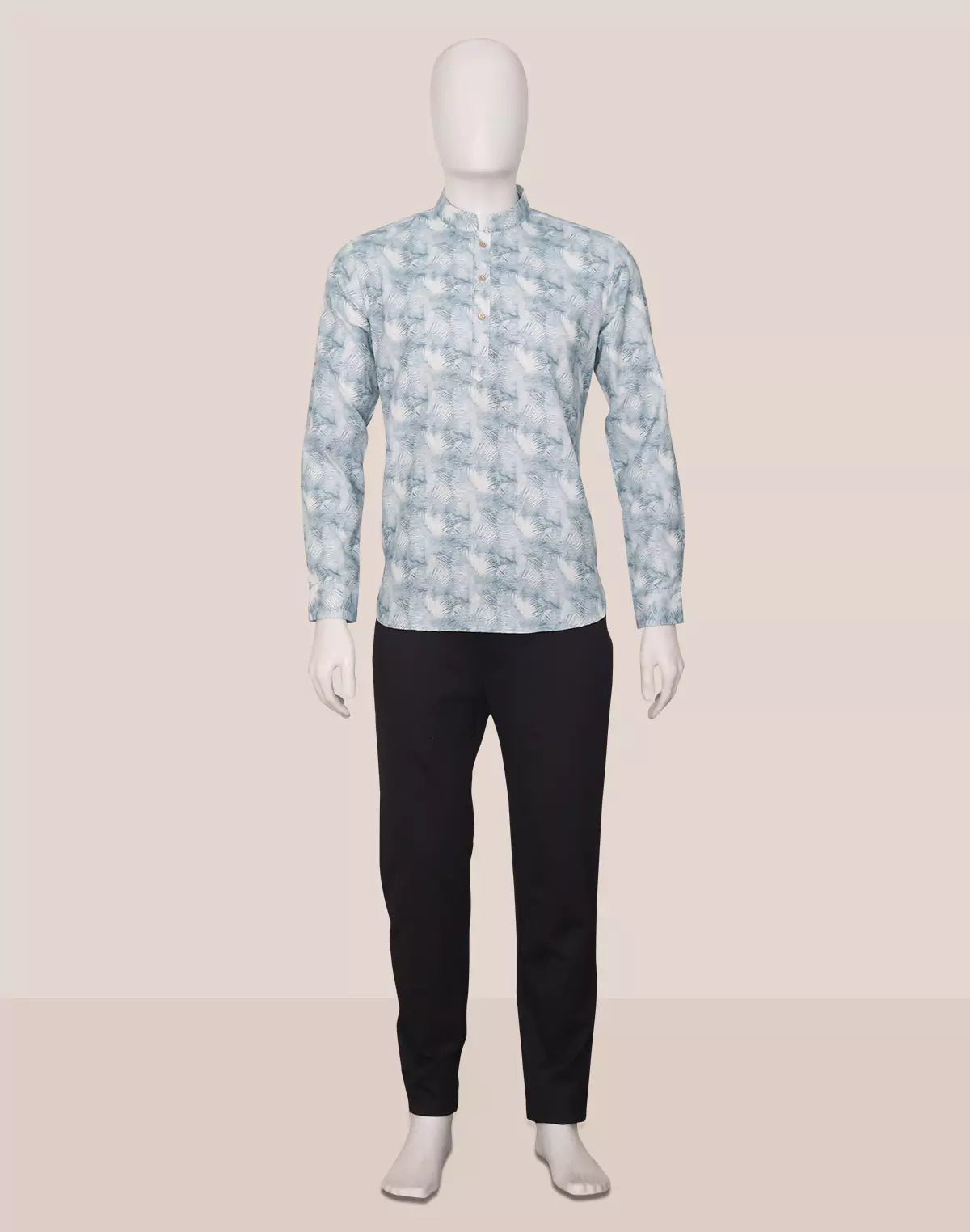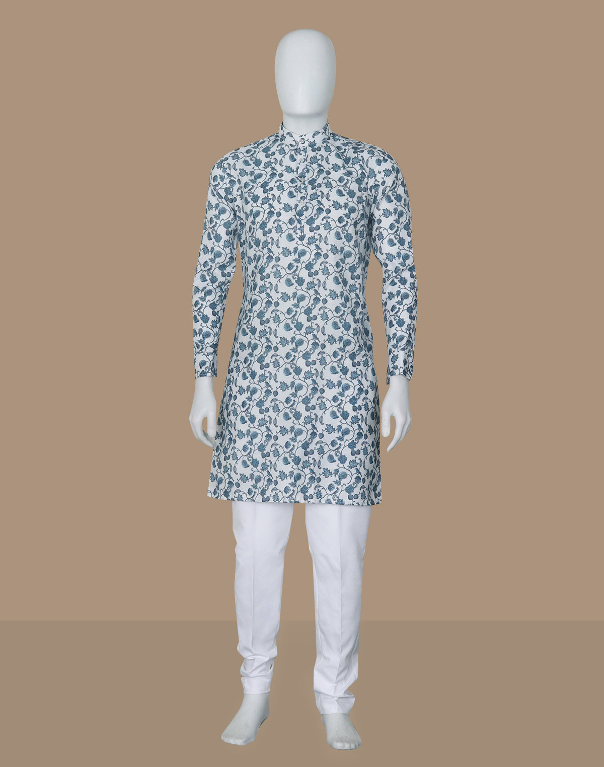 Stylish Blue Coloured Floral Print Giza Cotton Men Short Kurta