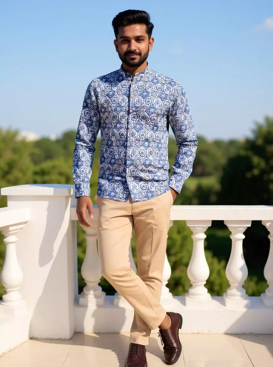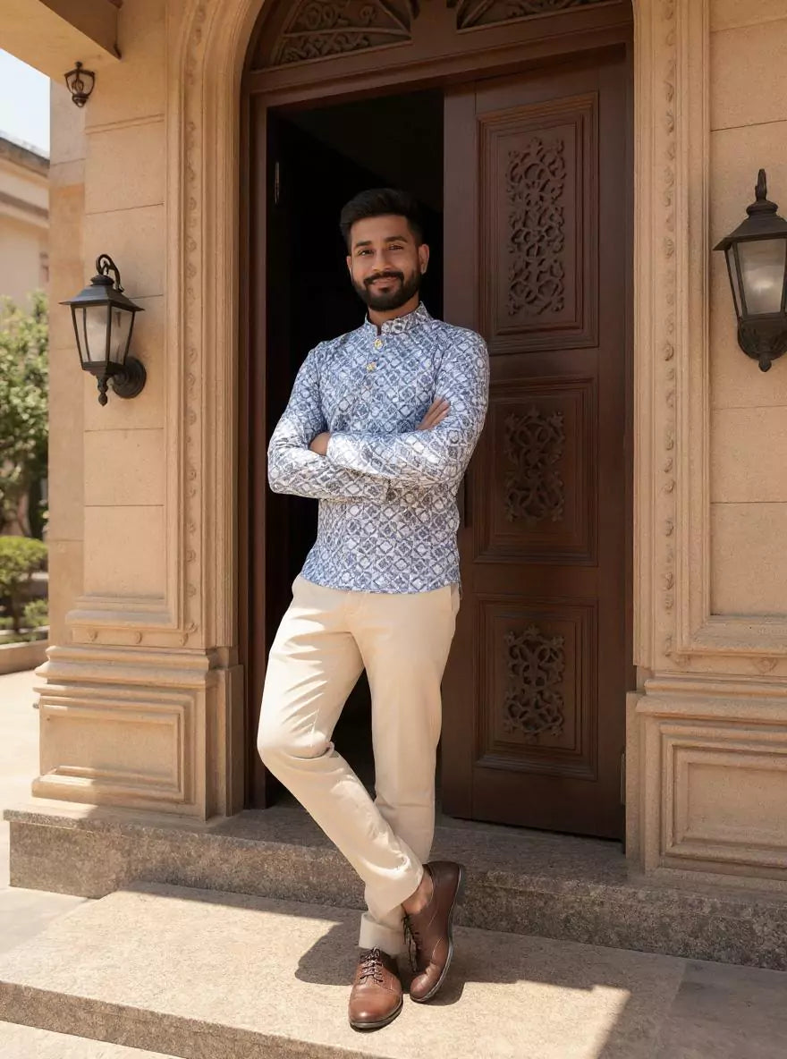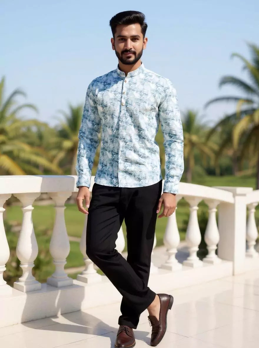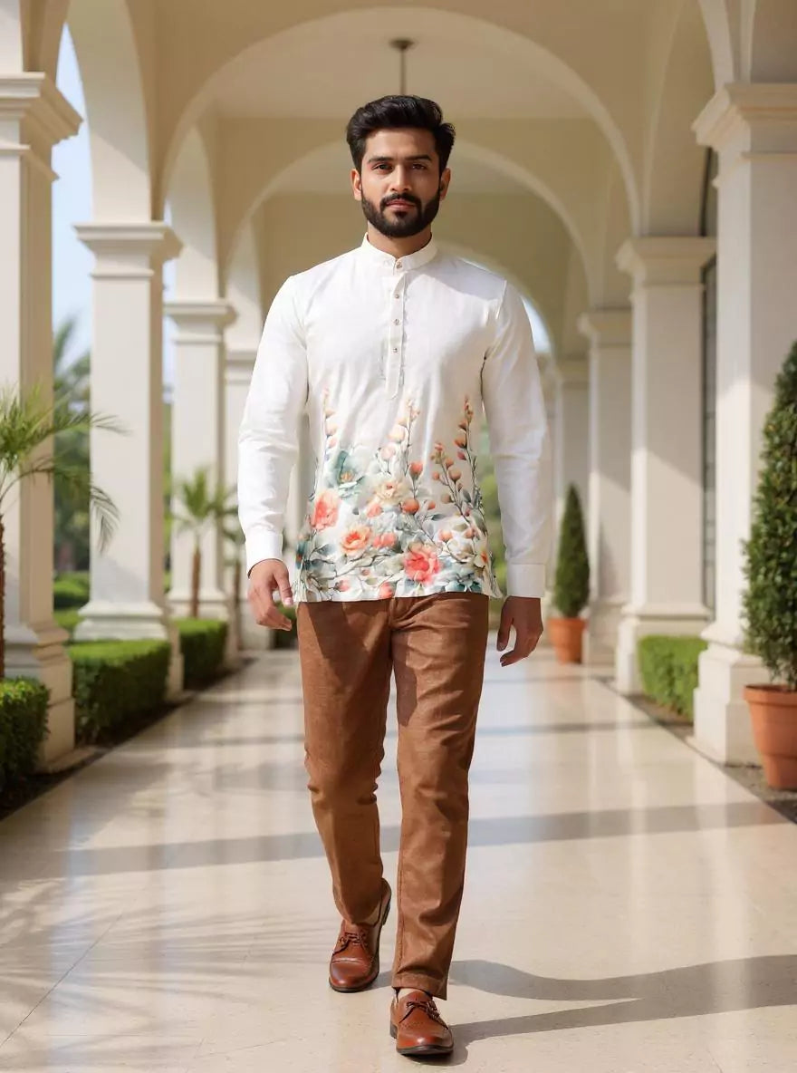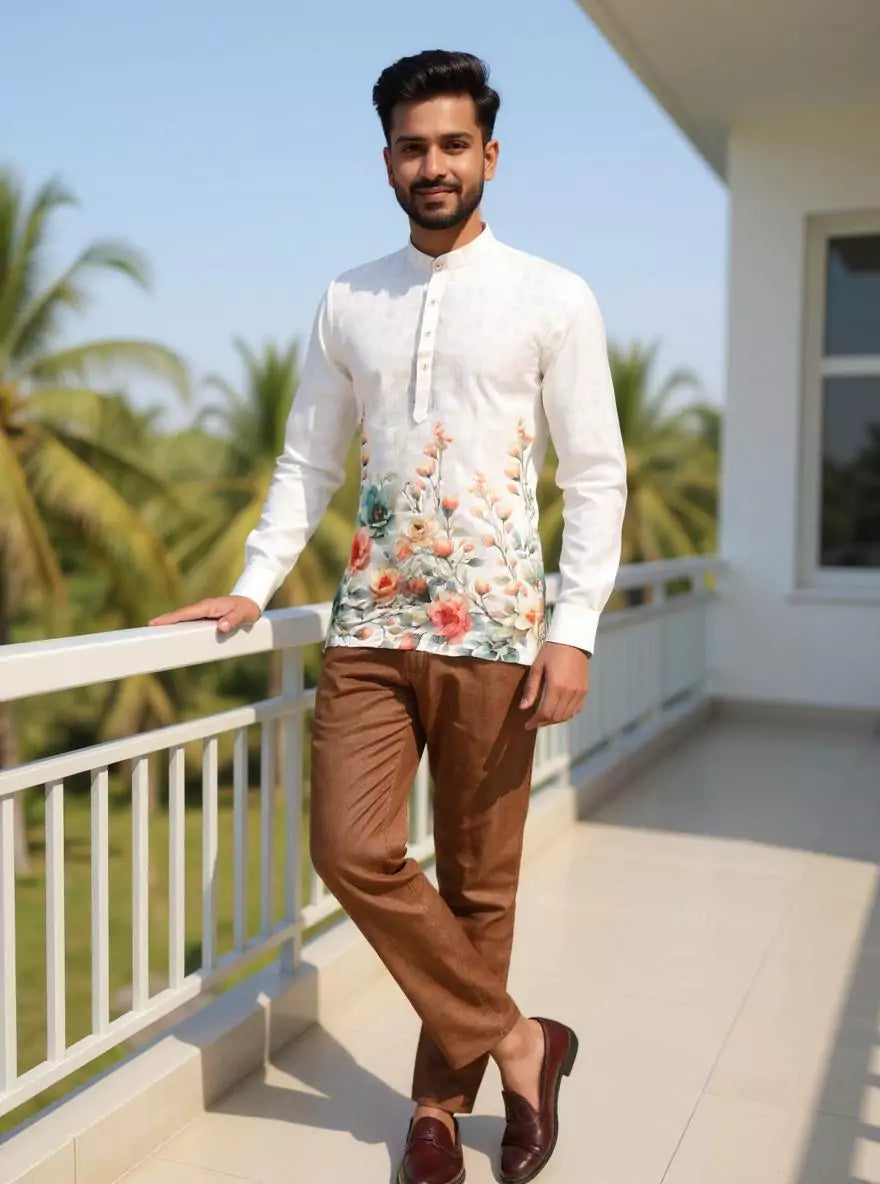 Stylish Blue Coloured Floral Print Giza Cotton Men Short Kurta