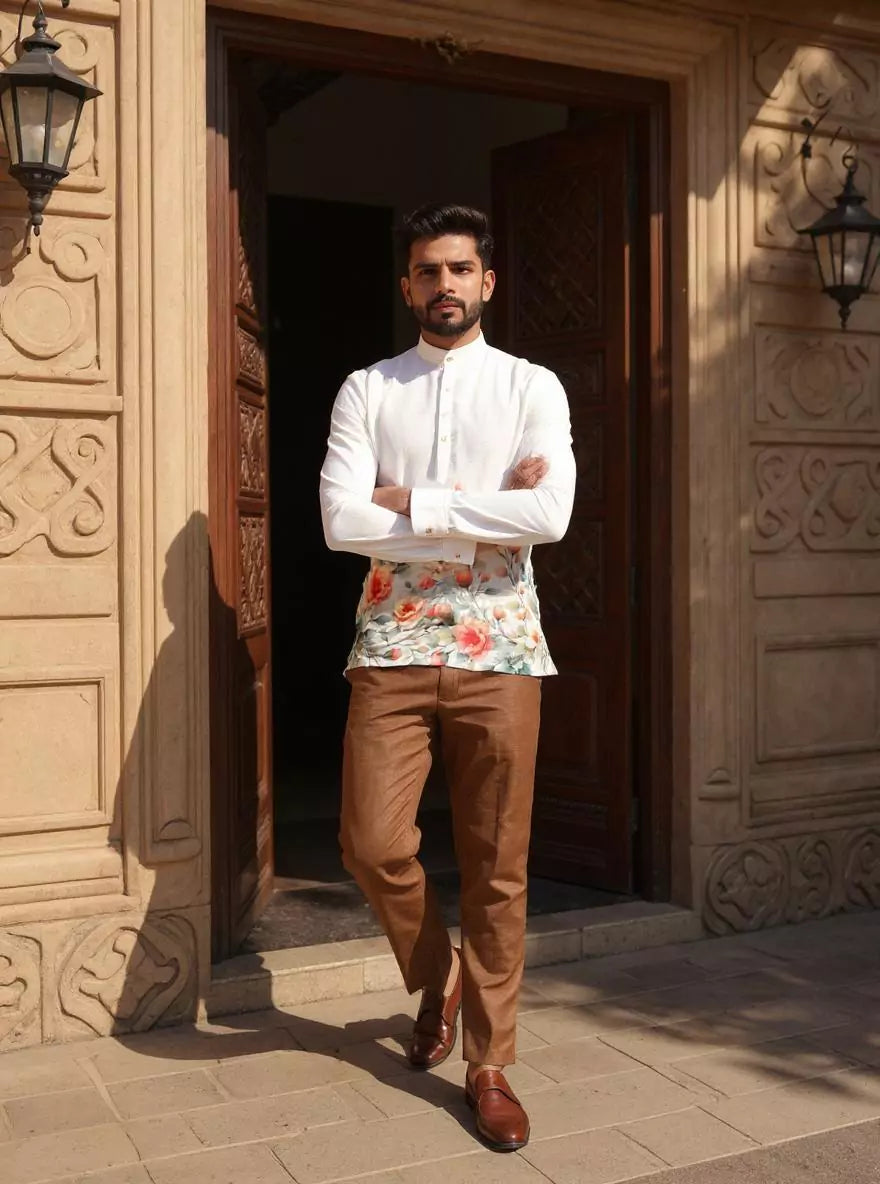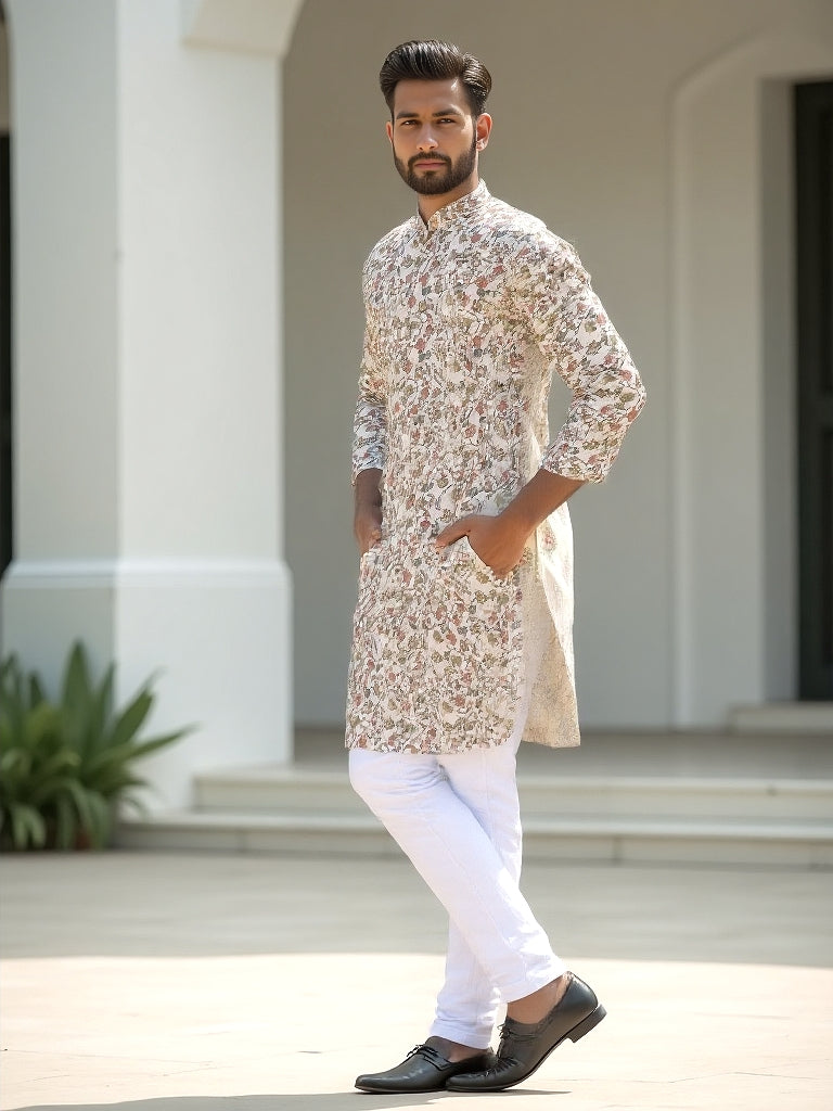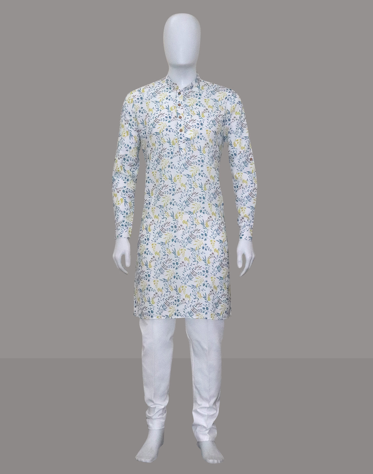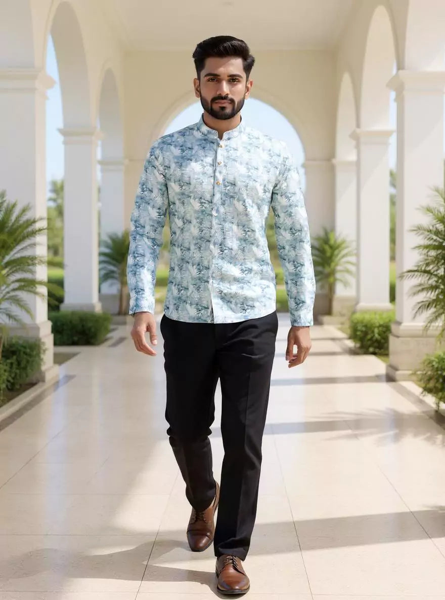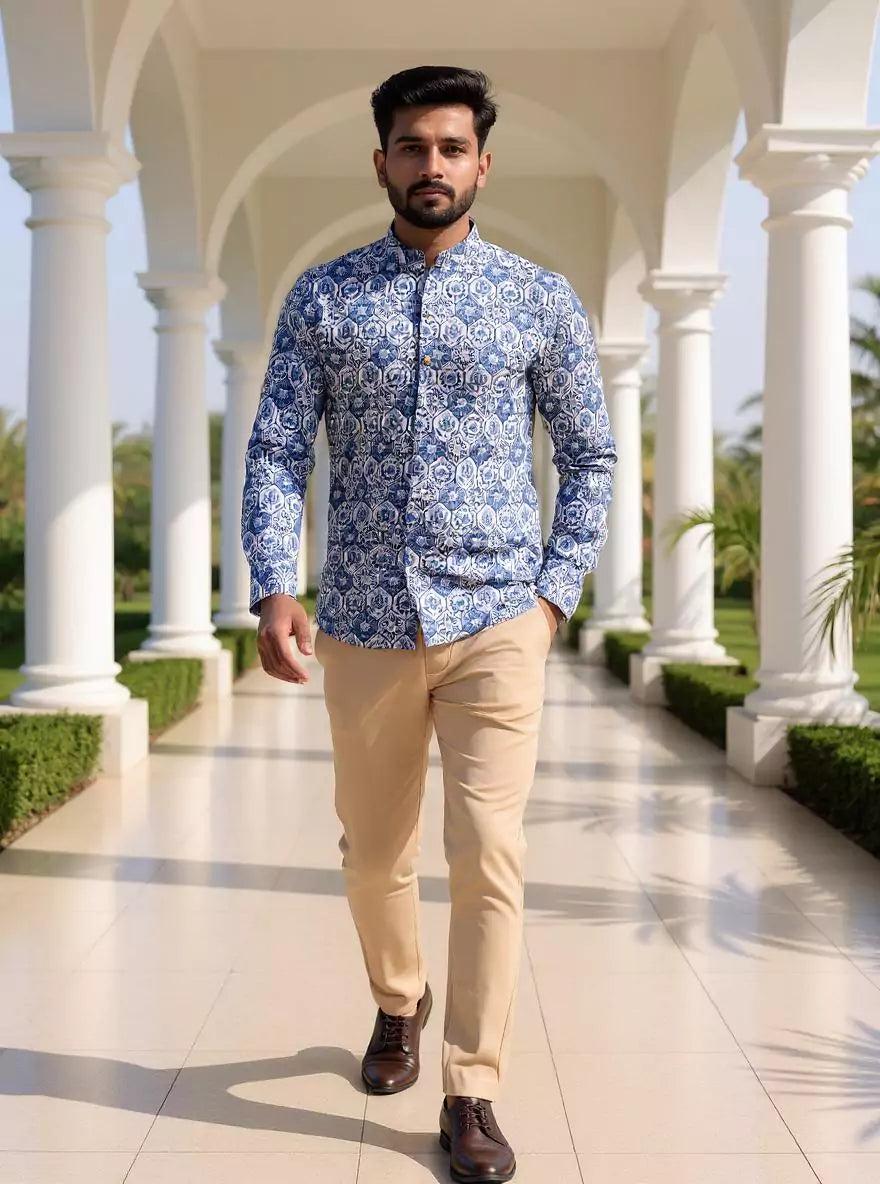 Stylish Blue Coloured Floral Print Giza Cotton Men Short Kurta