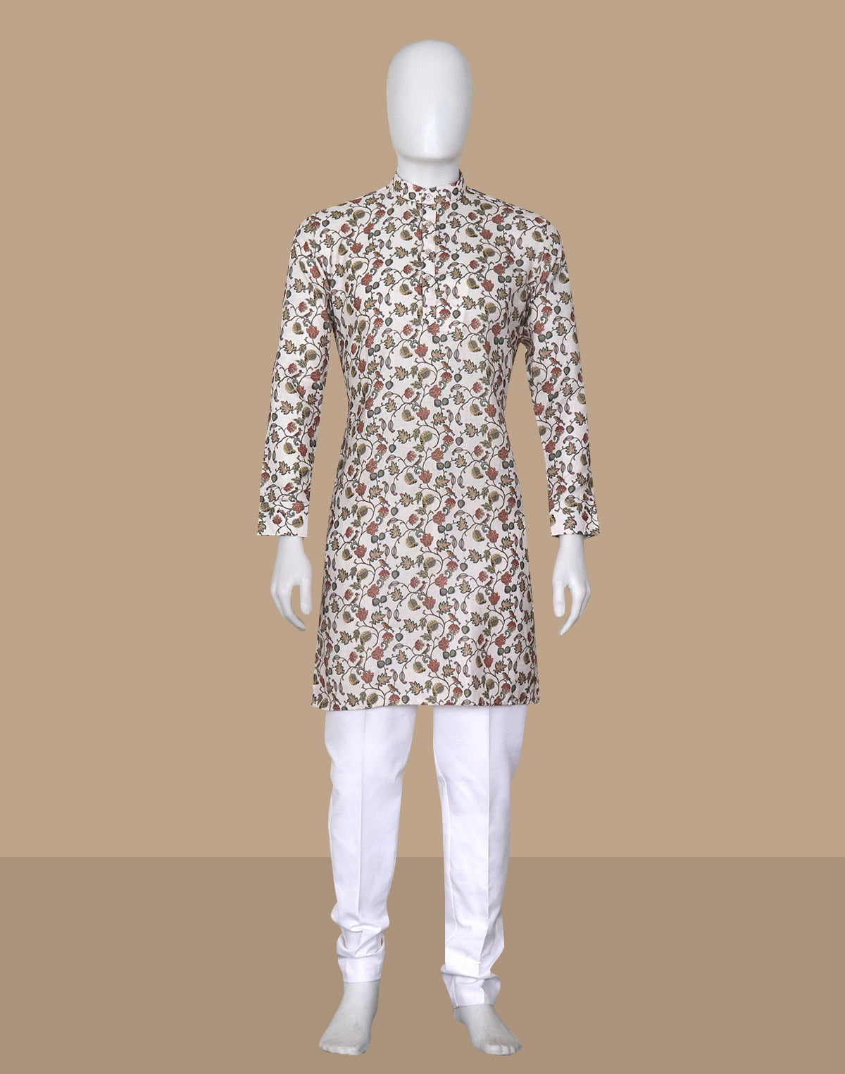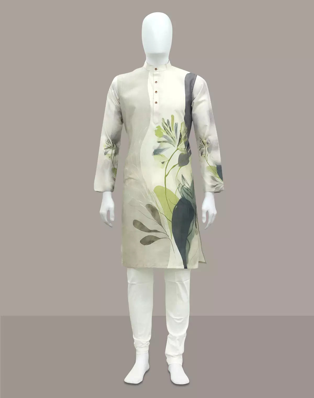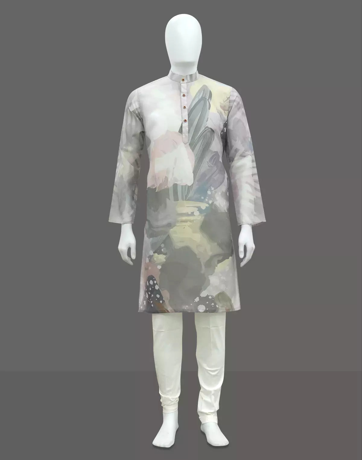 Light Grey Floral Motifs Cotton Silk Printed Kurta