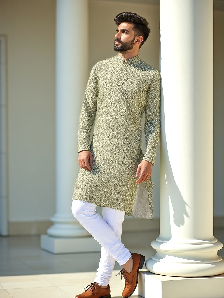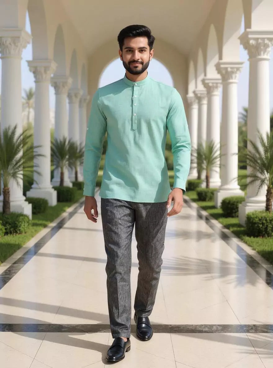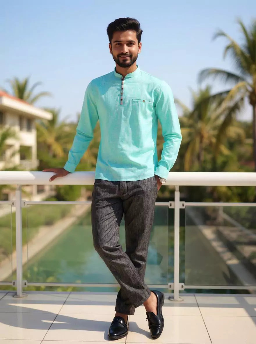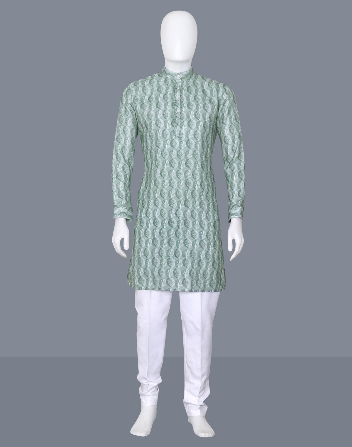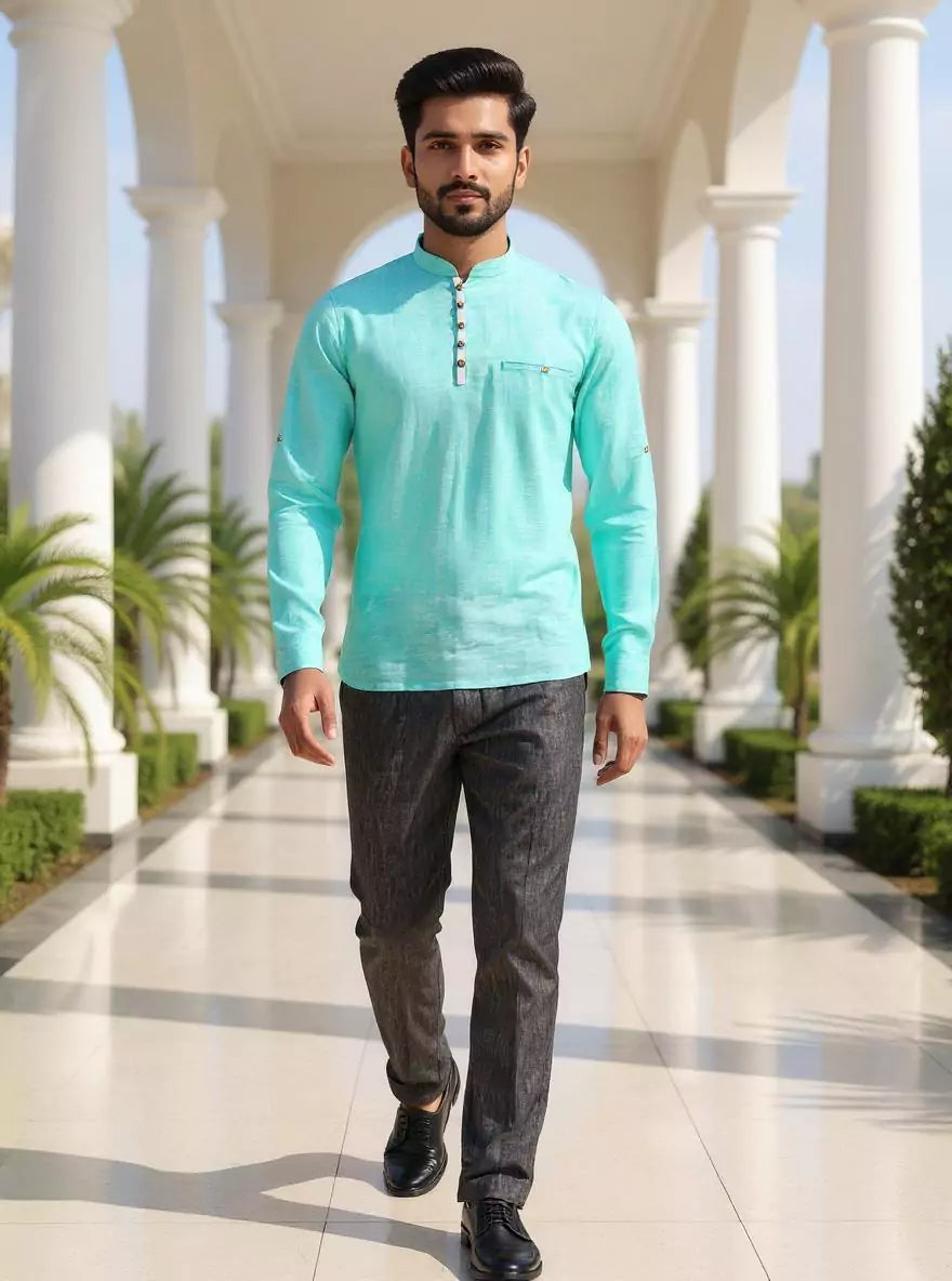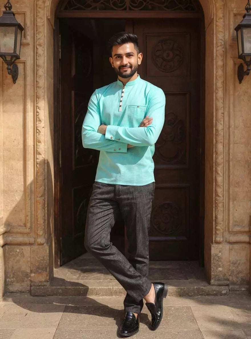 Pista Trellis Patterned Glaxo Cotton Short Kurta for Men