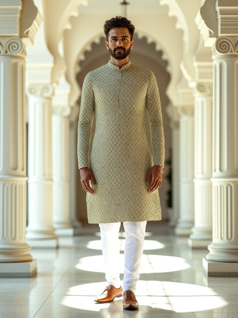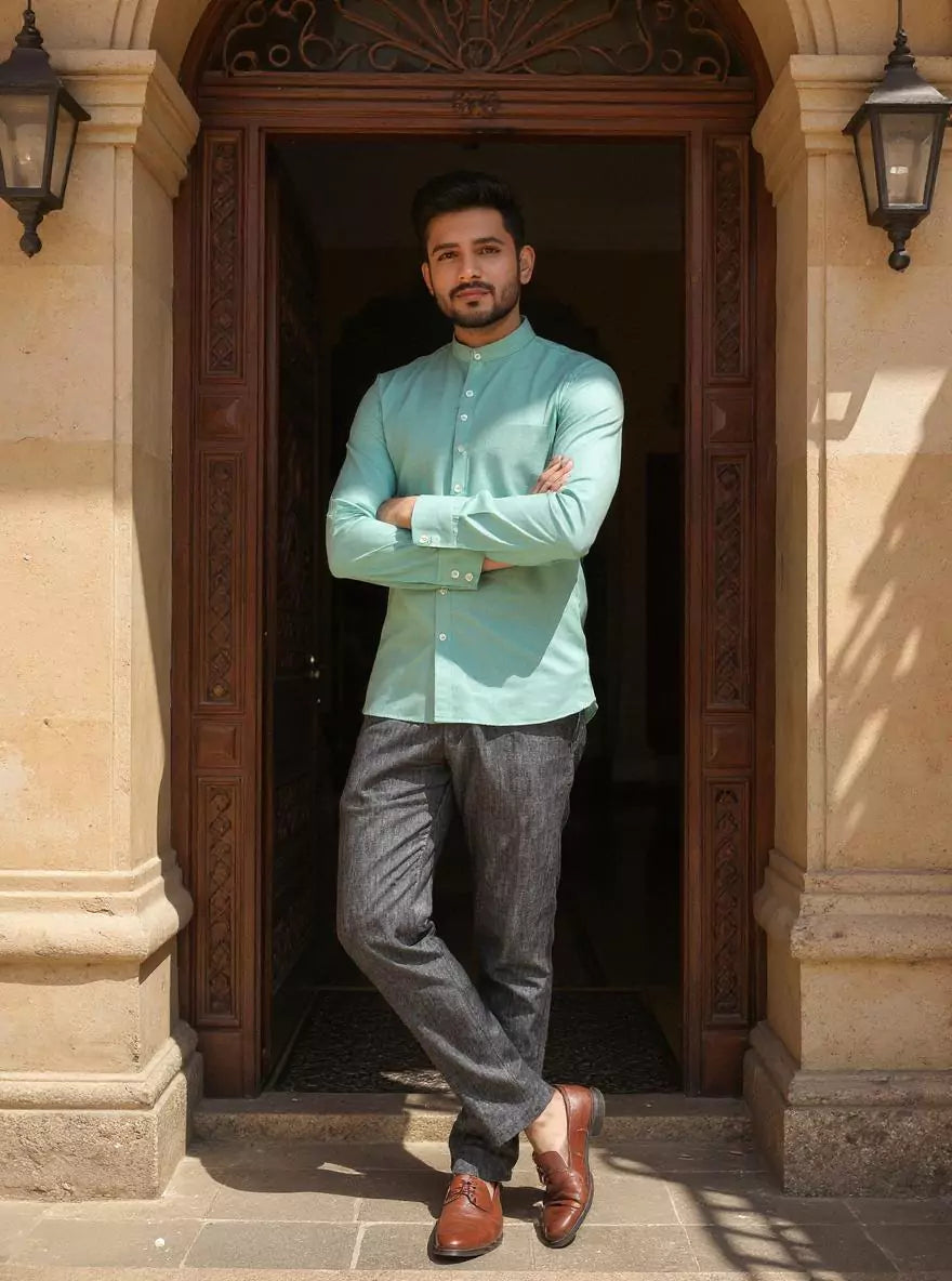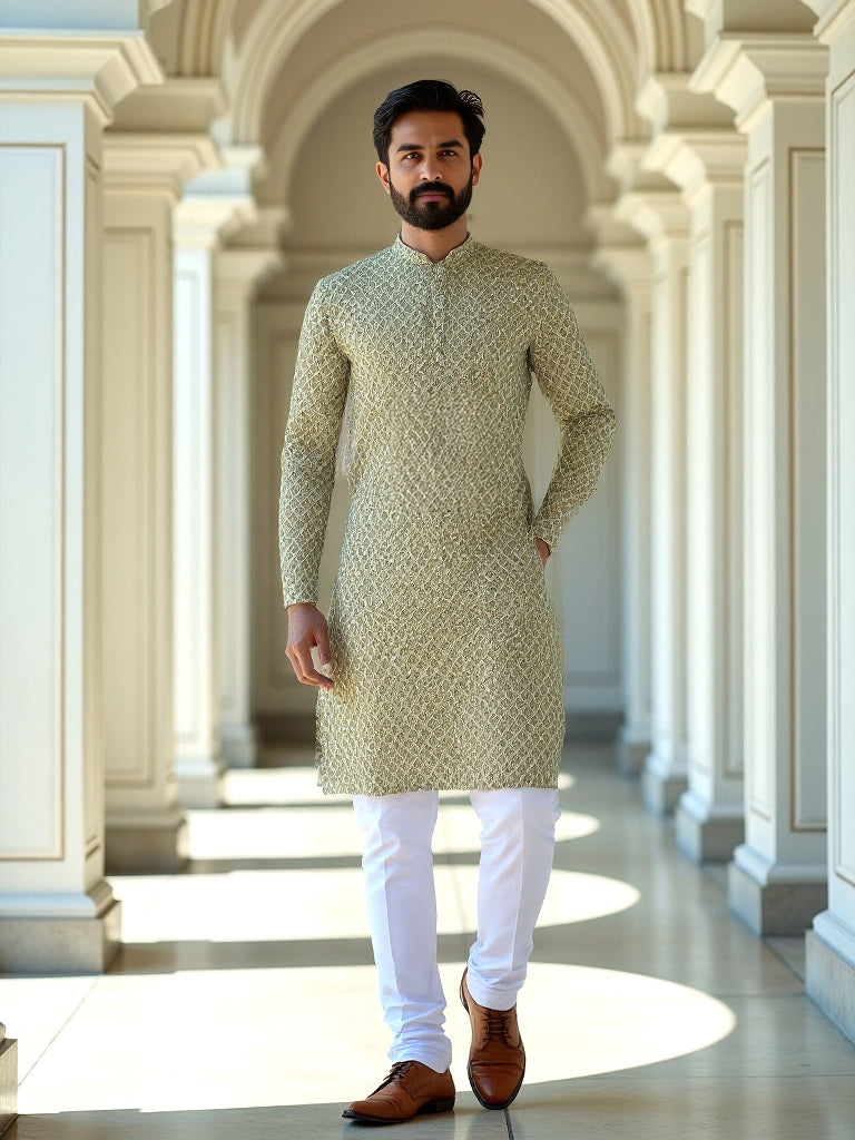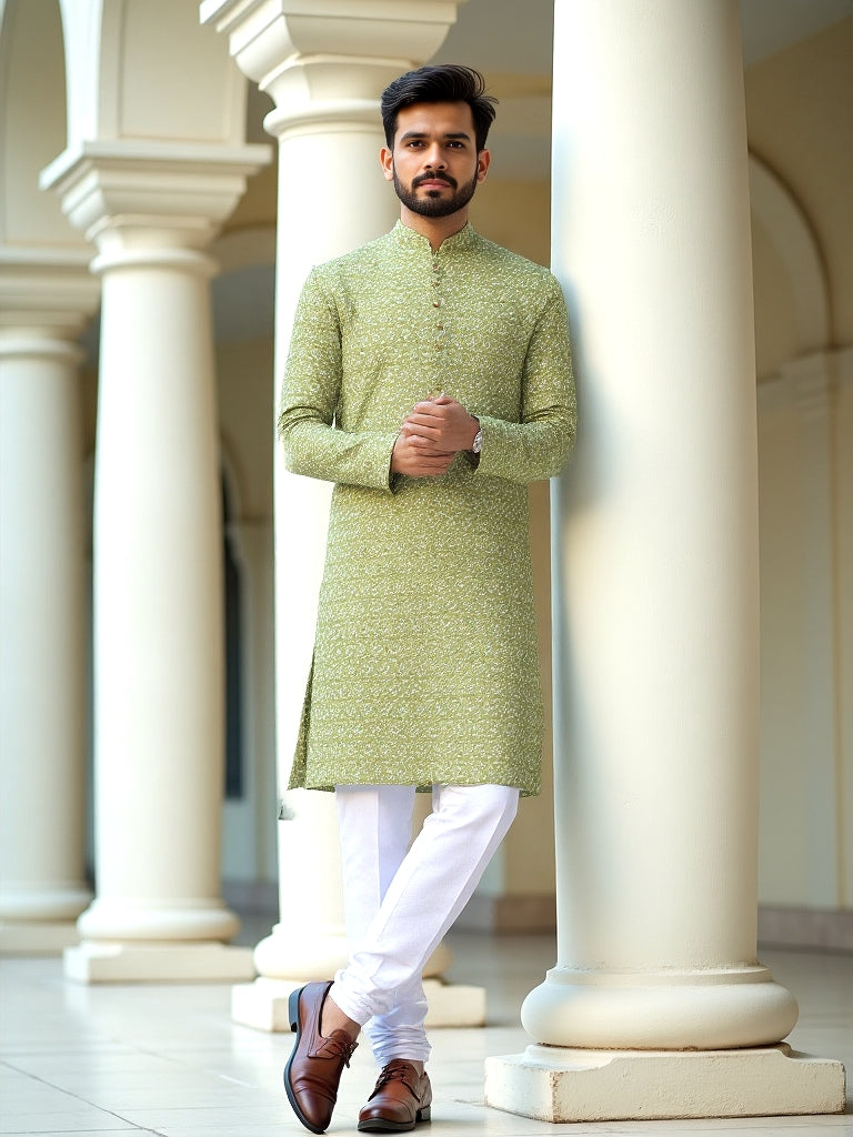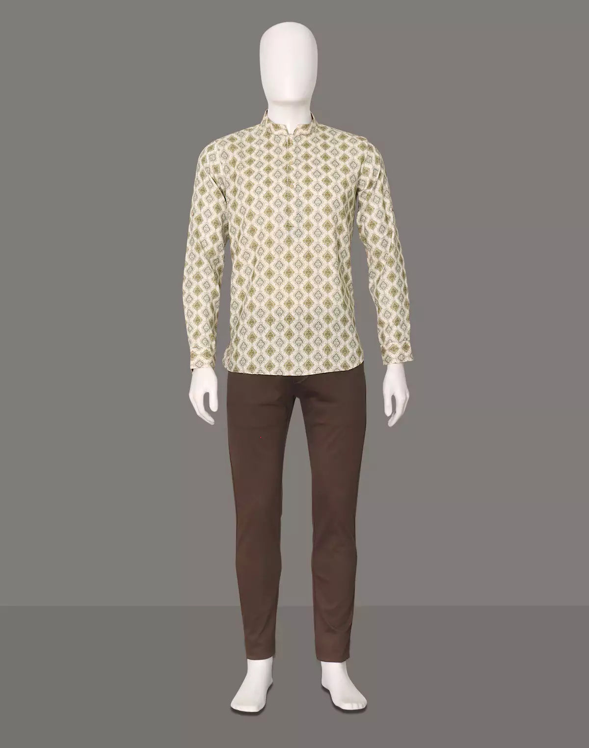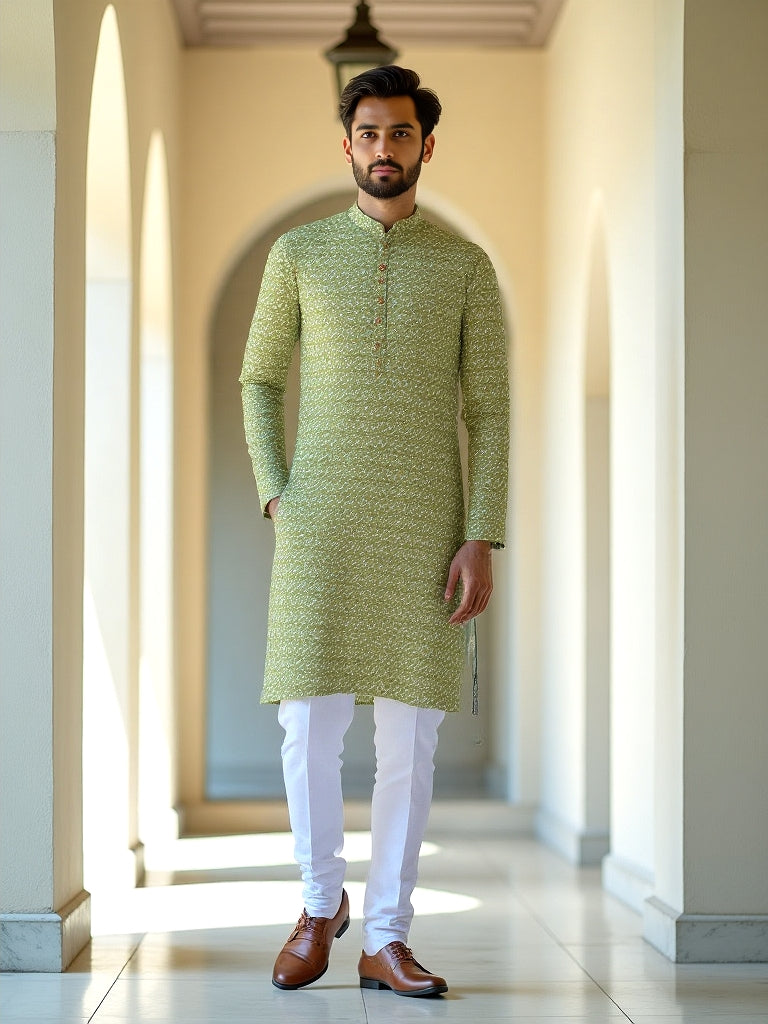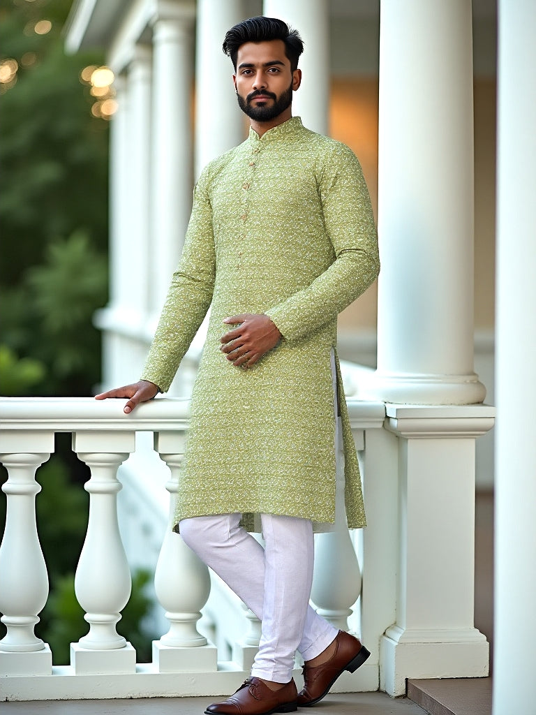Pista Trellis Patterned Glaxo Cotton Short Kurta for Men